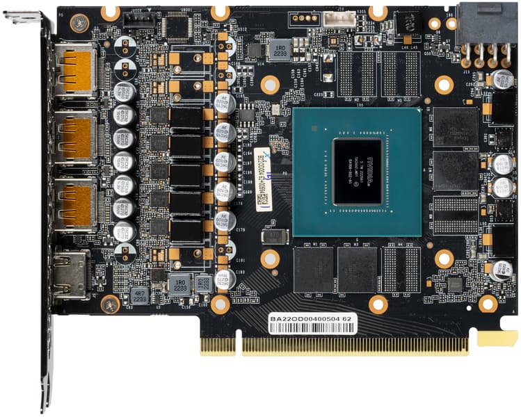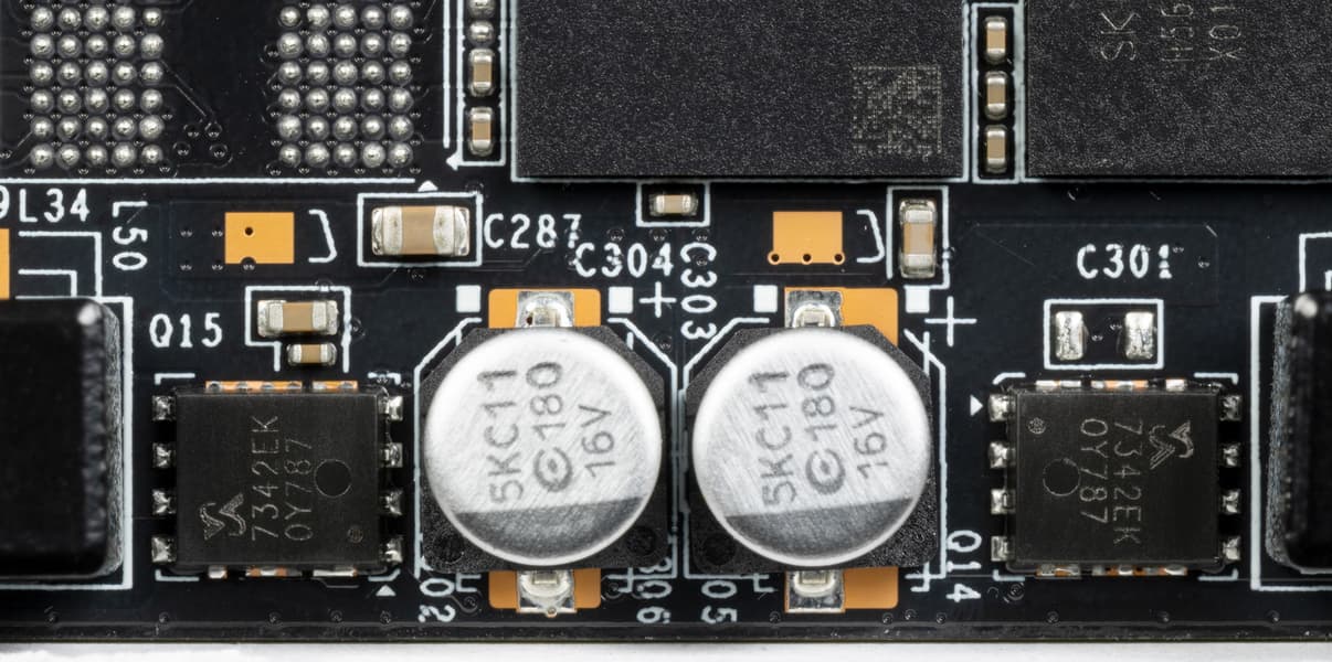 Карта имеет 8 ГБ памяти GDDR6 SDRAM, размещенной в 4 микросхемах по 16 Гбит на лицевой стороне PCB. Микросхемы памяти SKHynix рассчитаны на условную номинальную частоту работы в 2000 (16000) МГц.