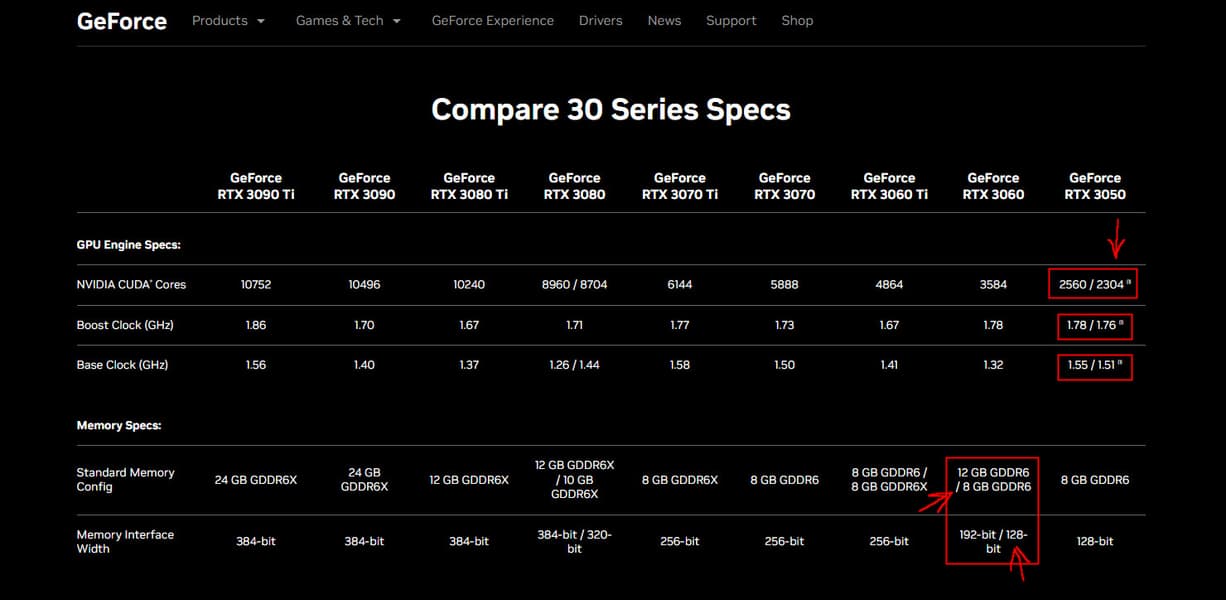 Так выглядит таблица с характеристиками всех продуктов семейства GeForce RTX 30 на сайте Nvidia:
