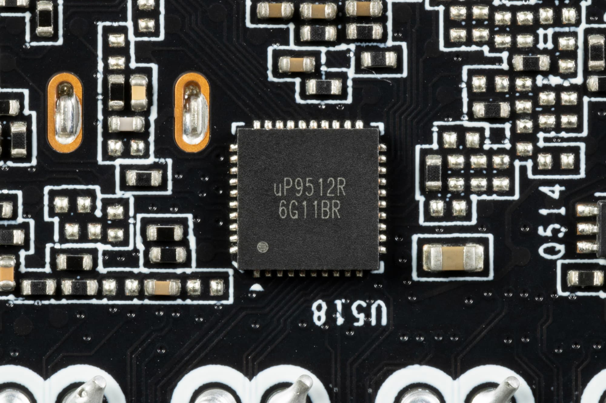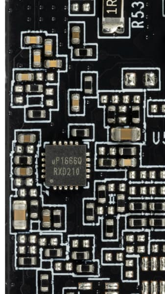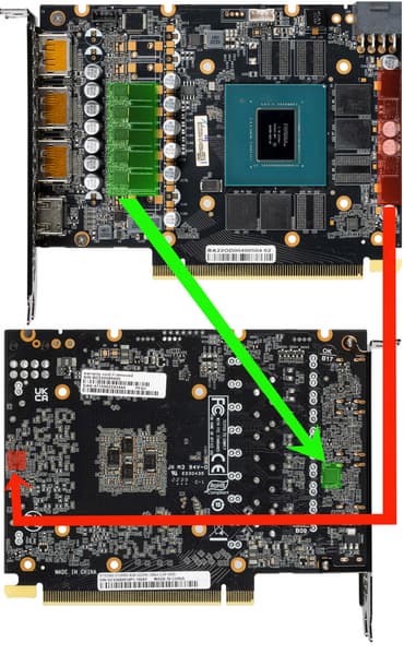 Зеленым цветом отмечена схема питания ядра, красным — памяти. ШИМ-контроллер uP9512R (uPI Semiconductor) отвечает за работу фаз питания графического процессора.