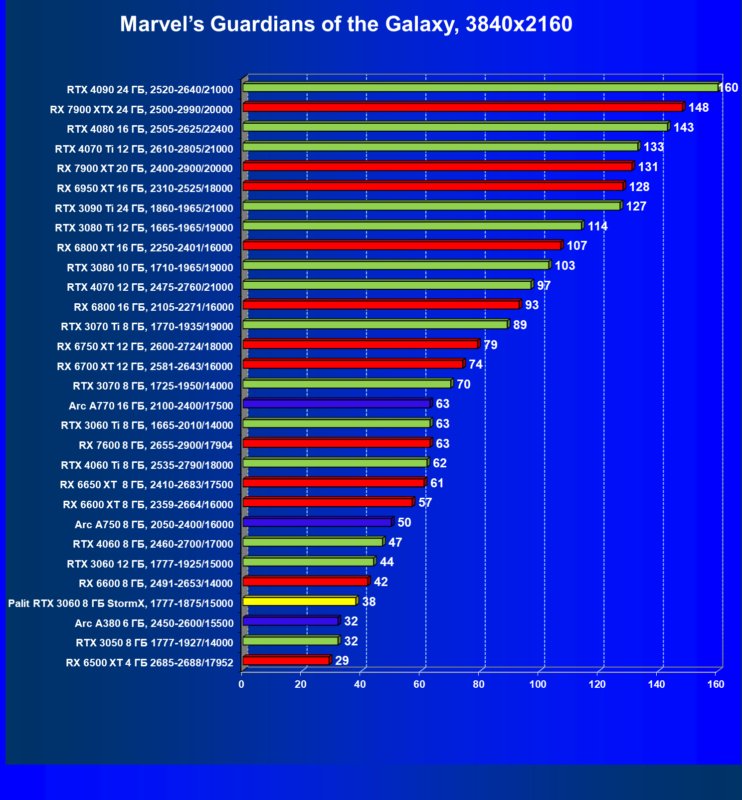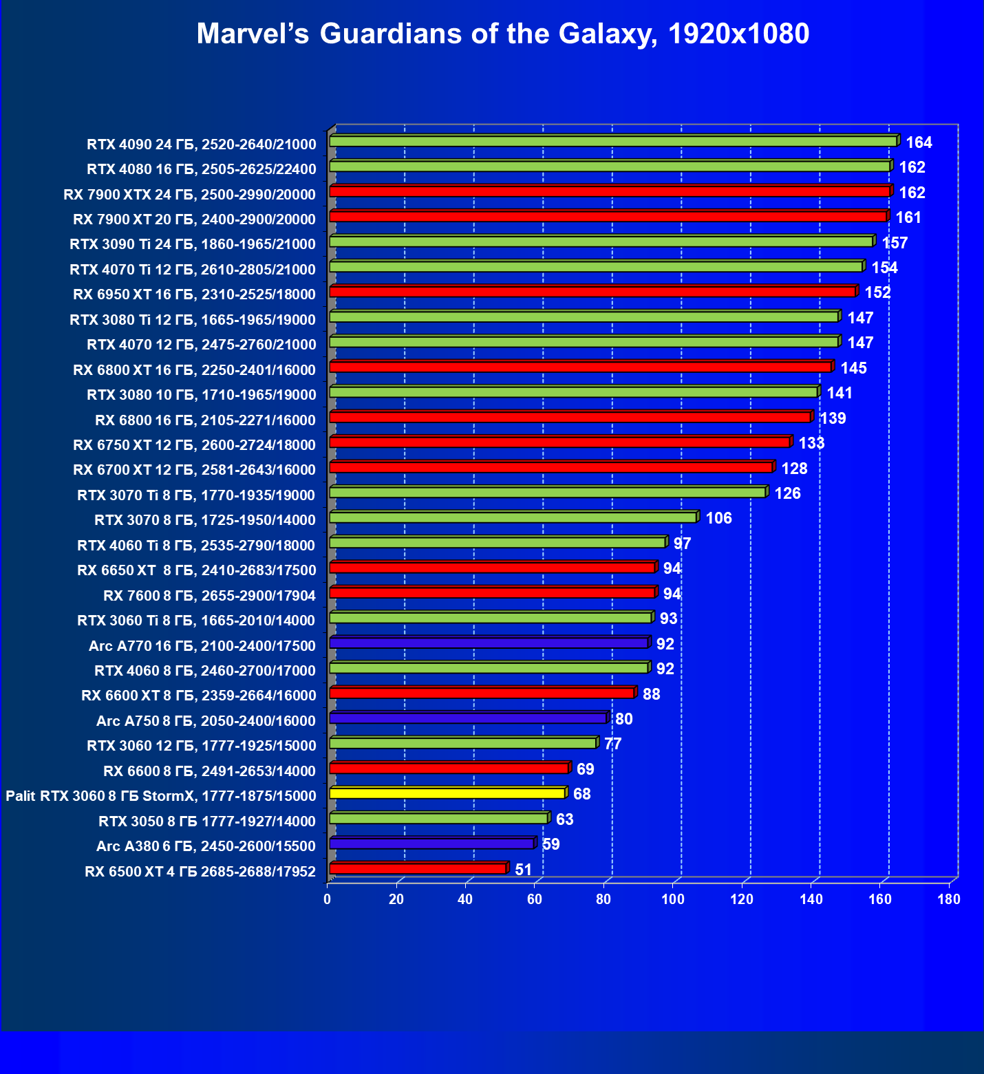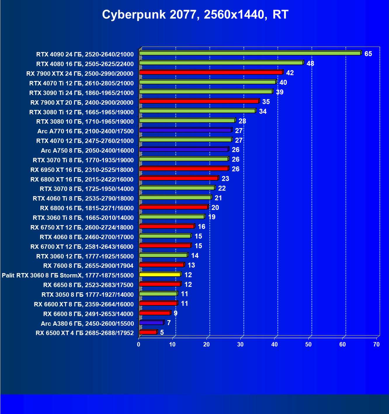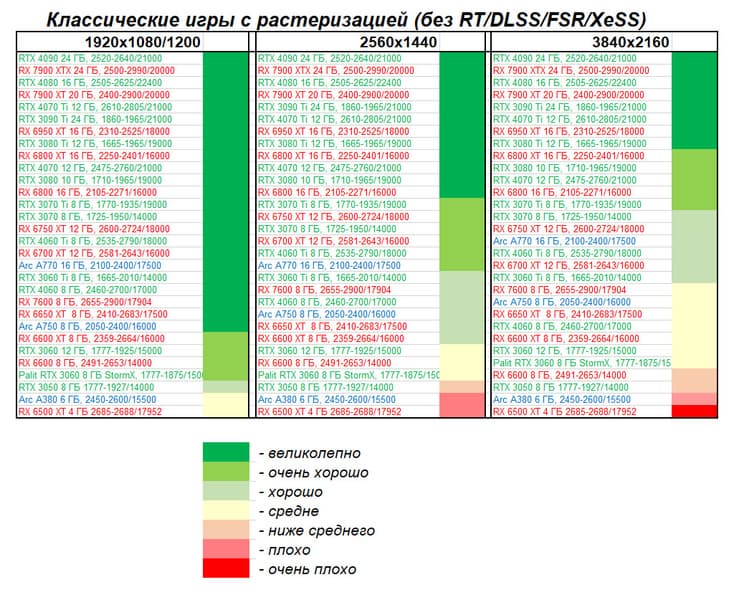Отлично видно, что GeForce RTX 3060 создан для Full HD, однако и в 2.5K в ряде игр обеспечивает приличную производительность при максимальных настройках графики. Один близкий соперник в лице Radeon RX 6600 попадает идеально между 8- и 12-гигабайтными вариантами GeForce RTX 3060. Другой, в лице Arc A750, заметно опережает даже GeForce RTX 3060 с 12 ГБ.