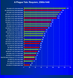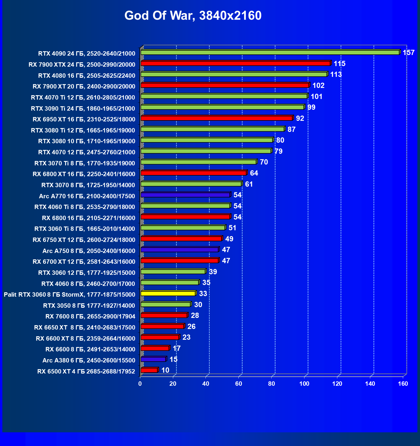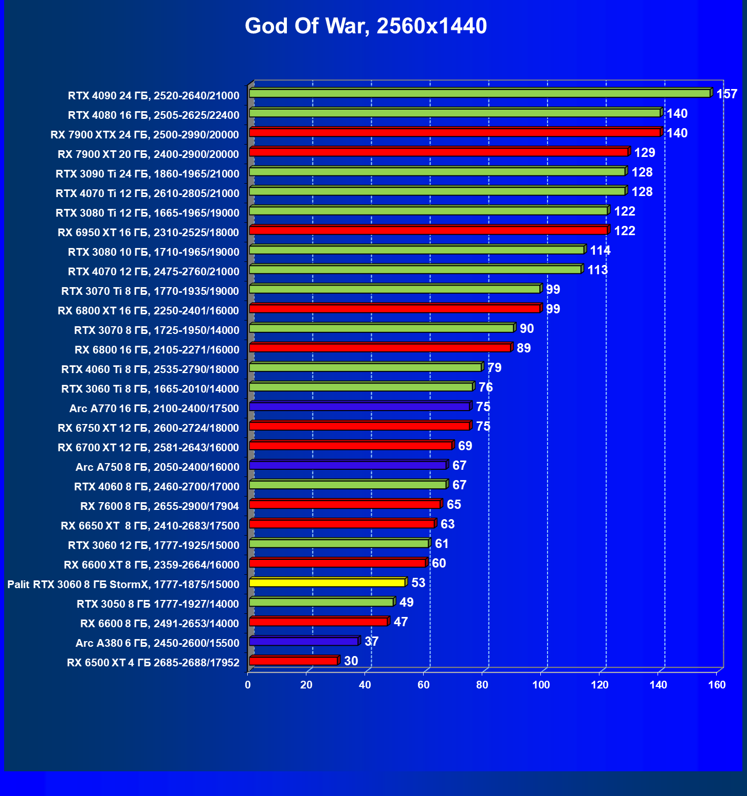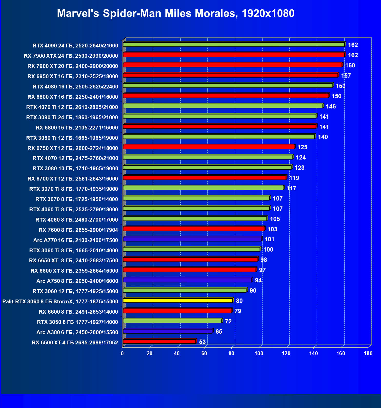 Отлично видно, что GeForce RTX 3060 создан для Full HD, однако и в 2.5K в ряде игр обеспечивает приличную производительность при максимальных настройках графики. Один близкий соперник в лице Radeon RX 6600 попадает идеально между 8- и 12-гигабайтными вариантами GeForce RTX 3060. Другой, в лице Arc A750, заметно опережает даже GeForce RTX 3060 с 12 ГБ.