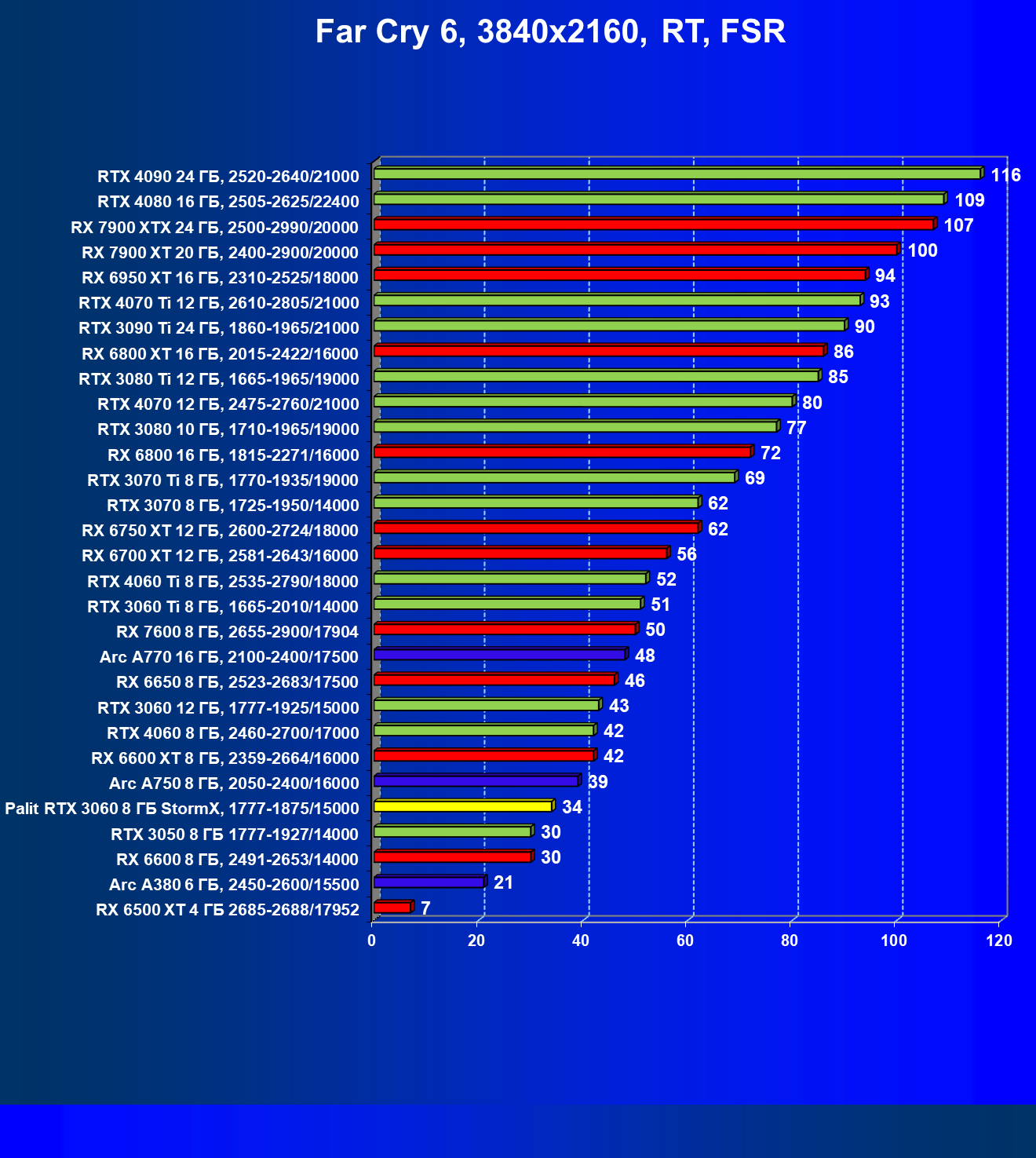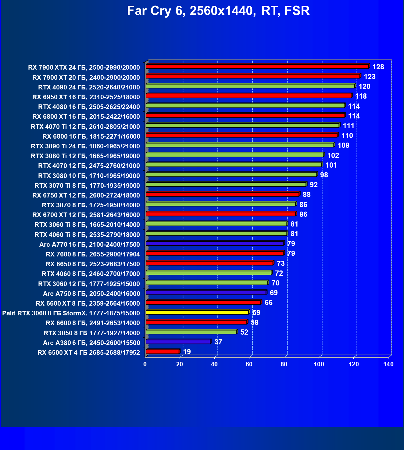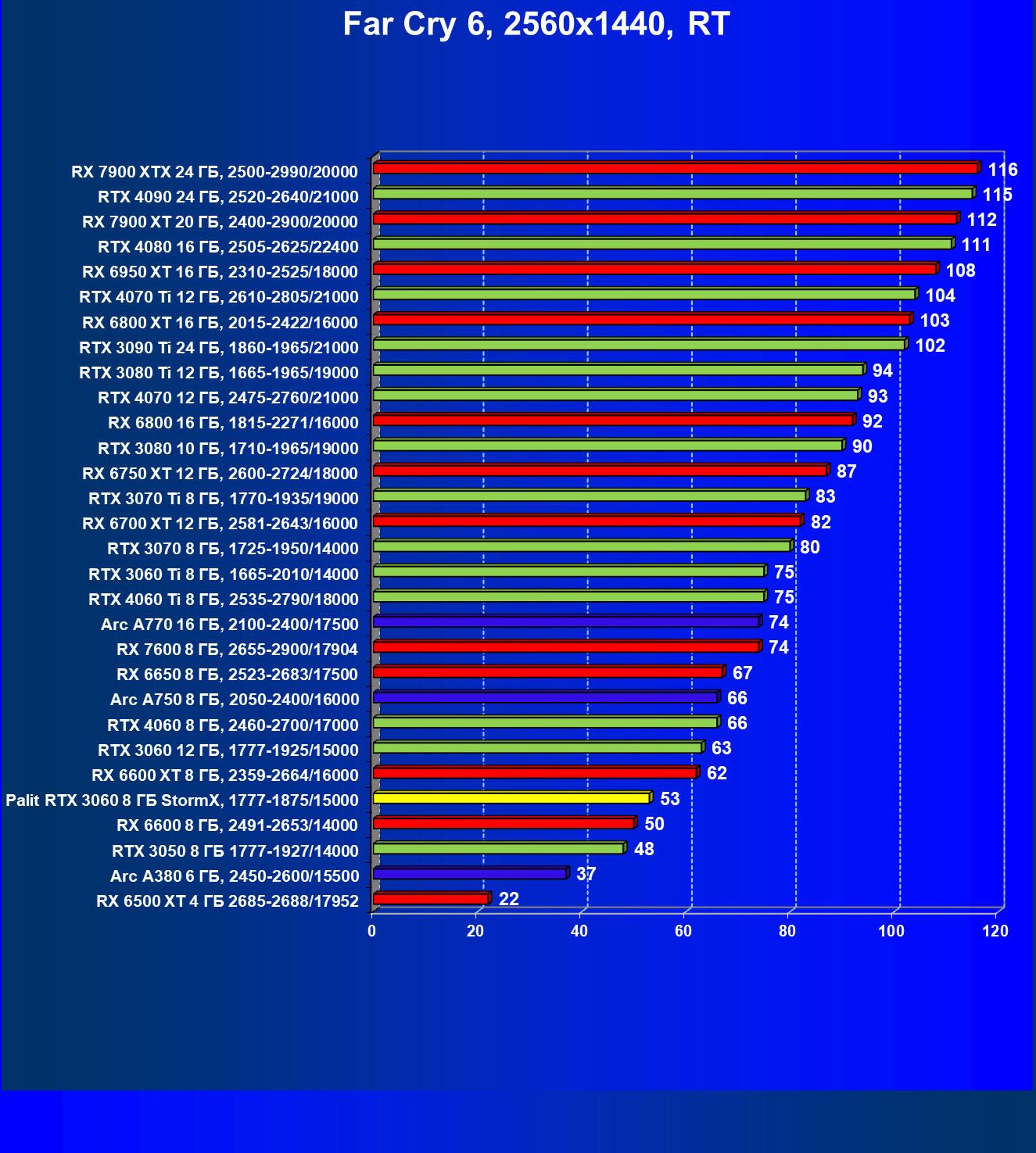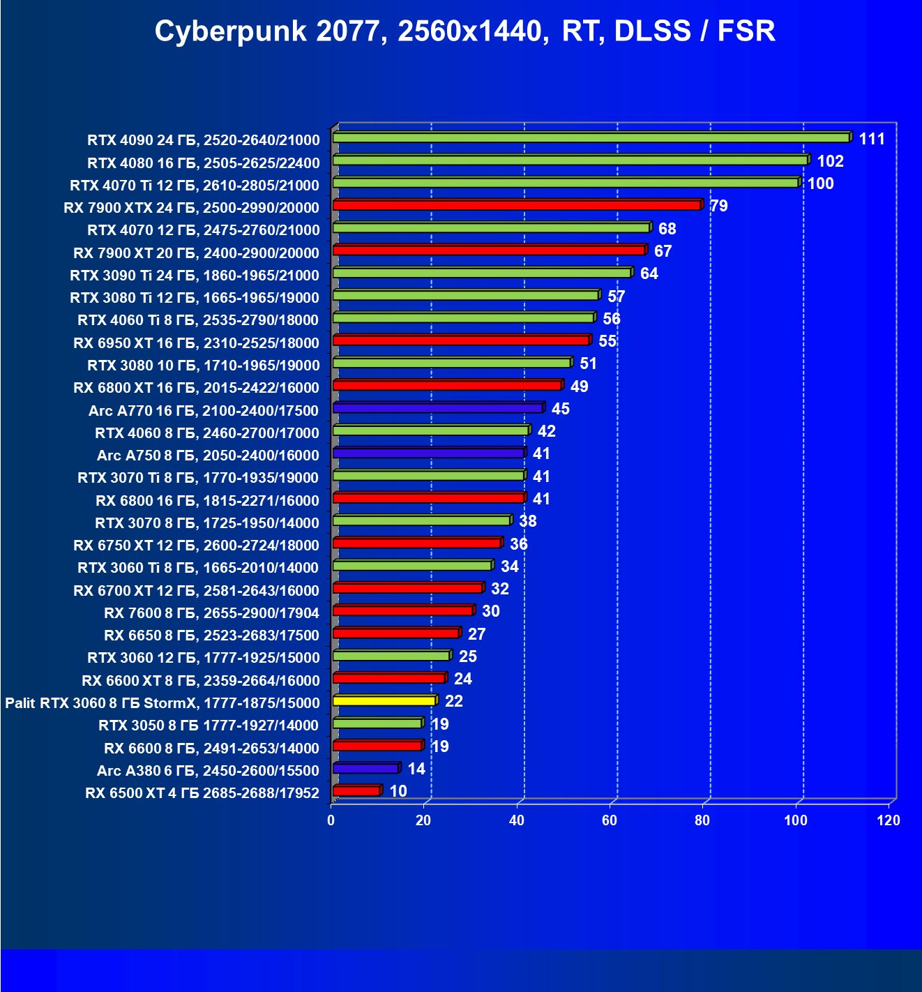 | 25 | RX 6600 XT 8 ГБ, 2359—2664/16000 | 321 | 111 | 29 000 |