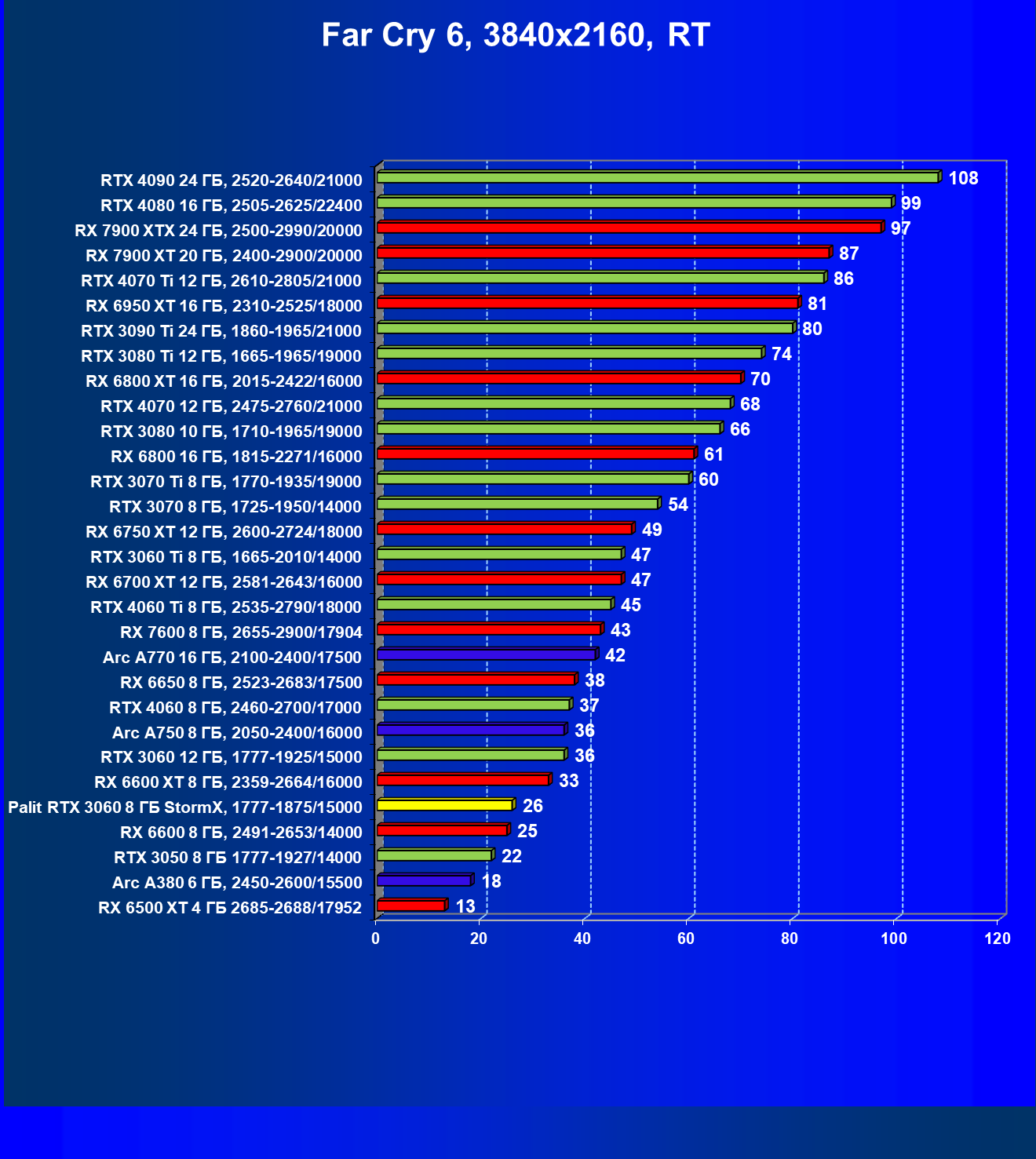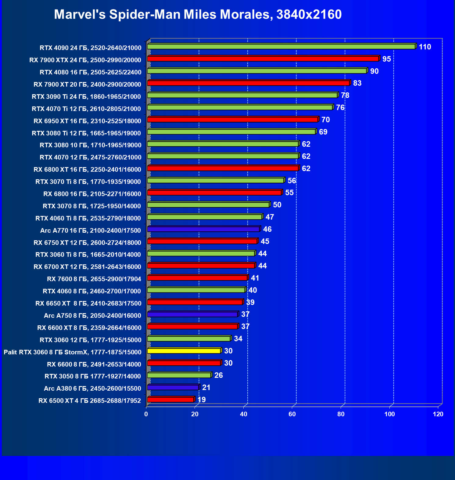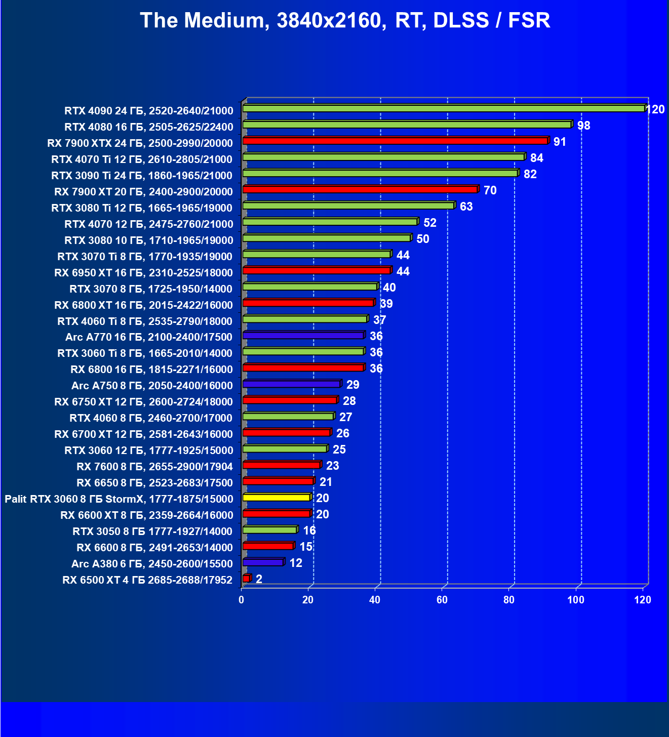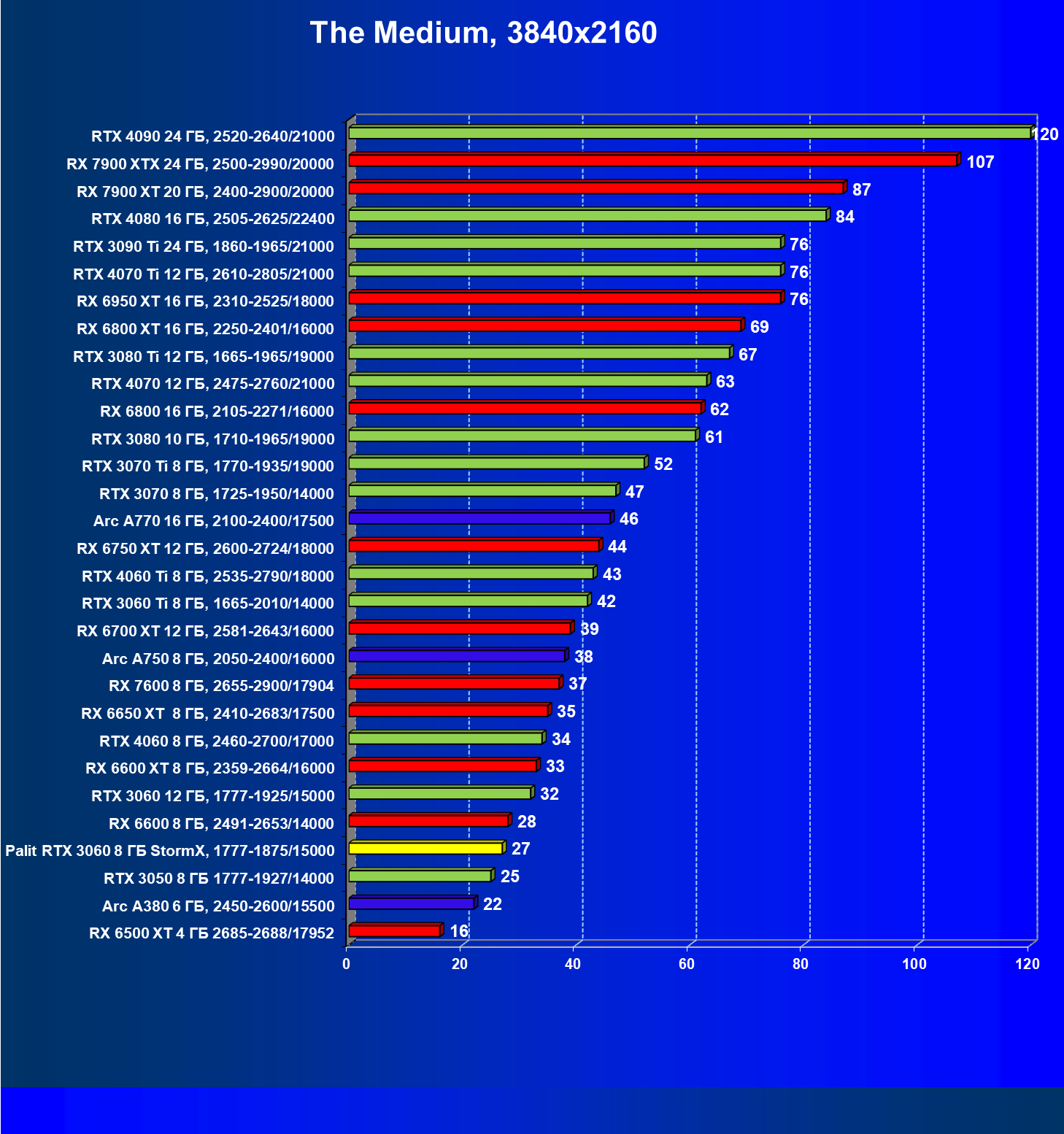 | 25 | RX 6600 XT 8 ГБ, 2359—2664/16000 | 321 | 111 | 29 000 |