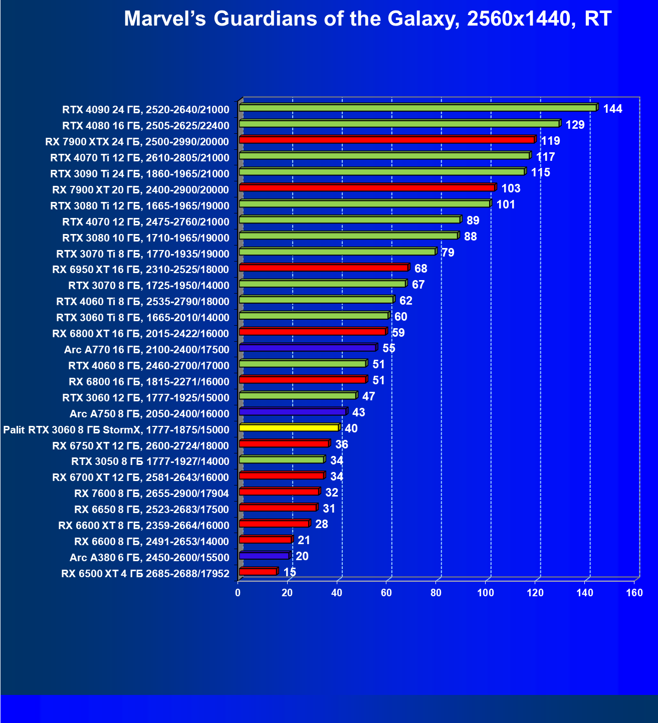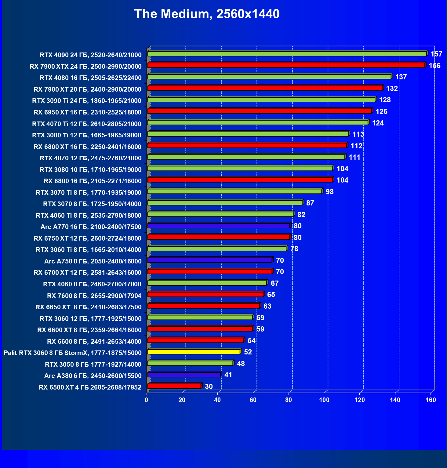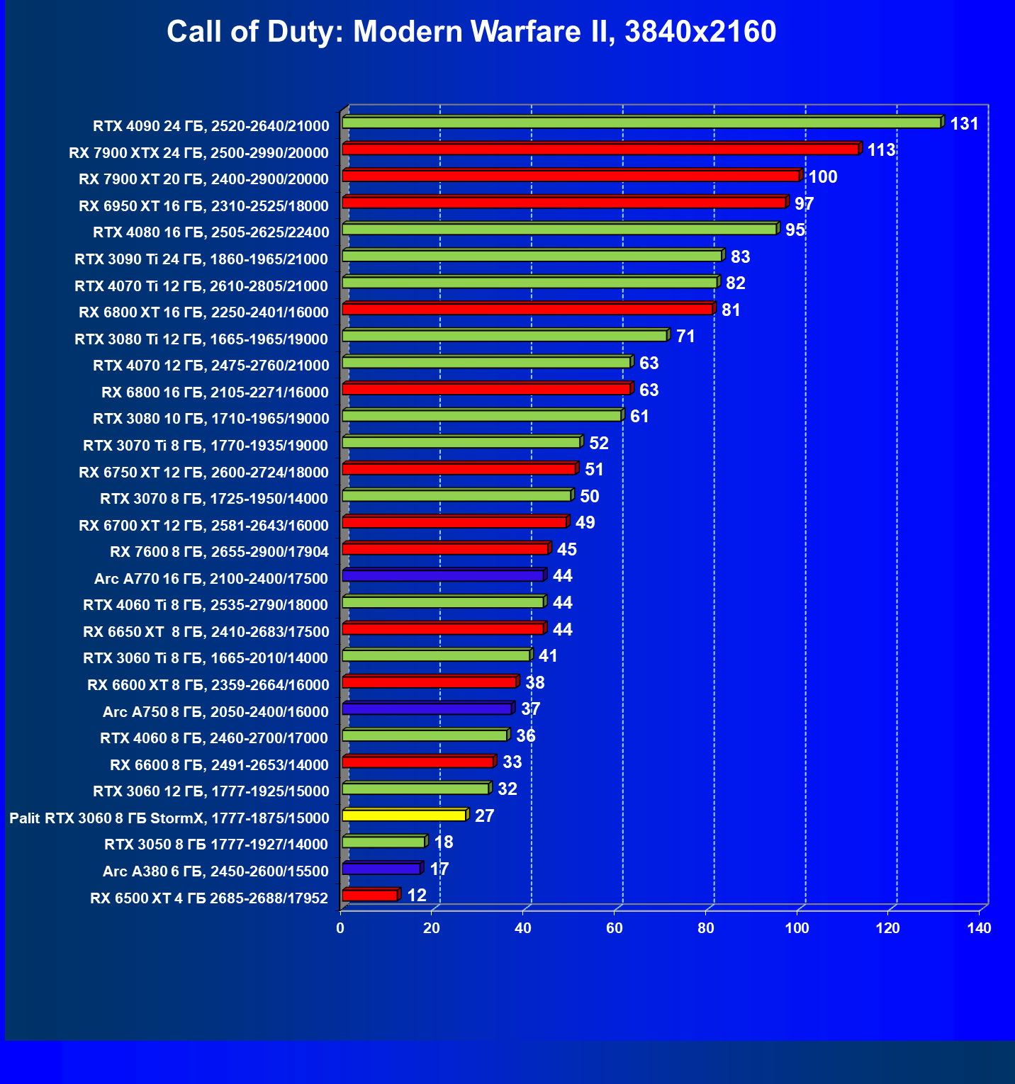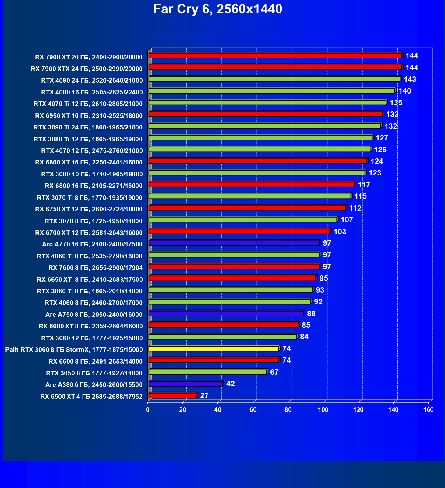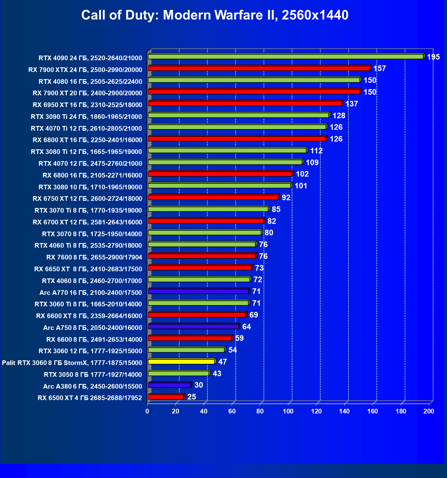 | 25 | RX 6600 XT 8 ГБ, 2359—2664/16000 | 321 | 111 | 29 000 |