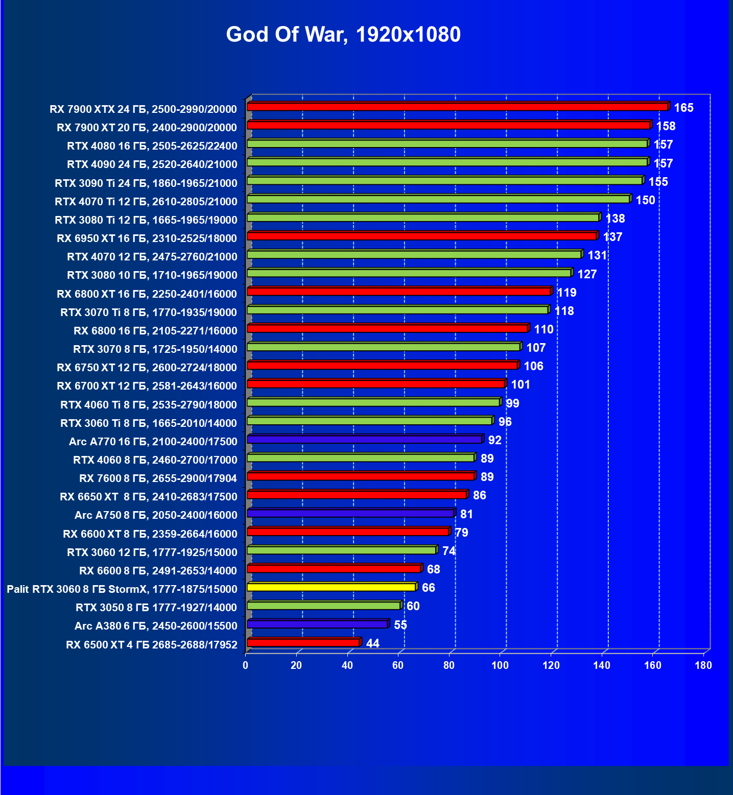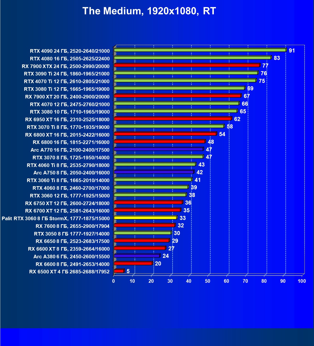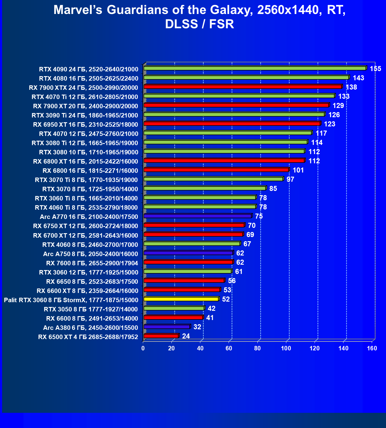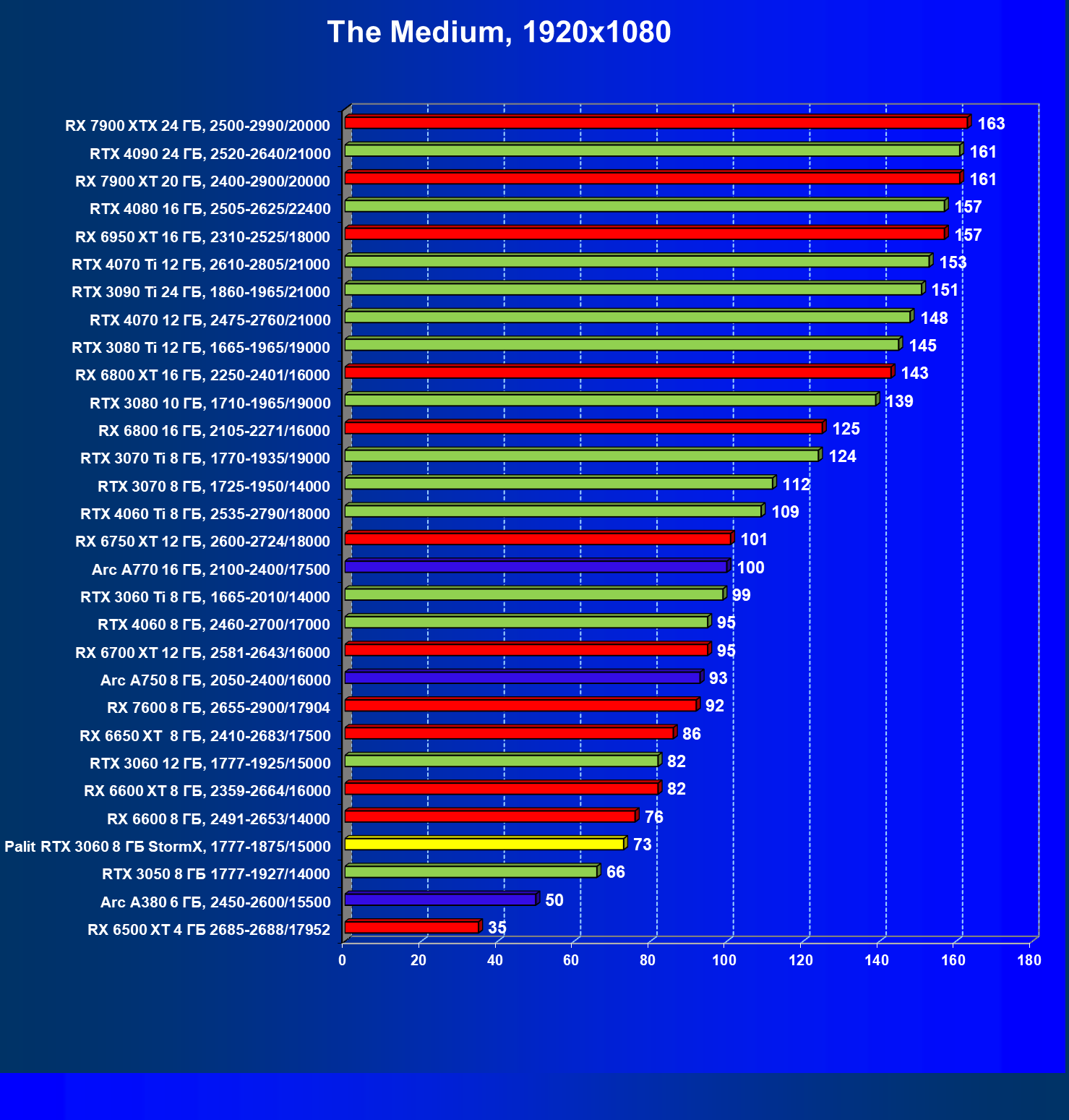 | 25 | RX 6600 XT 8 ГБ, 2359—2664/16000 | 321 | 111 | 29 000 |