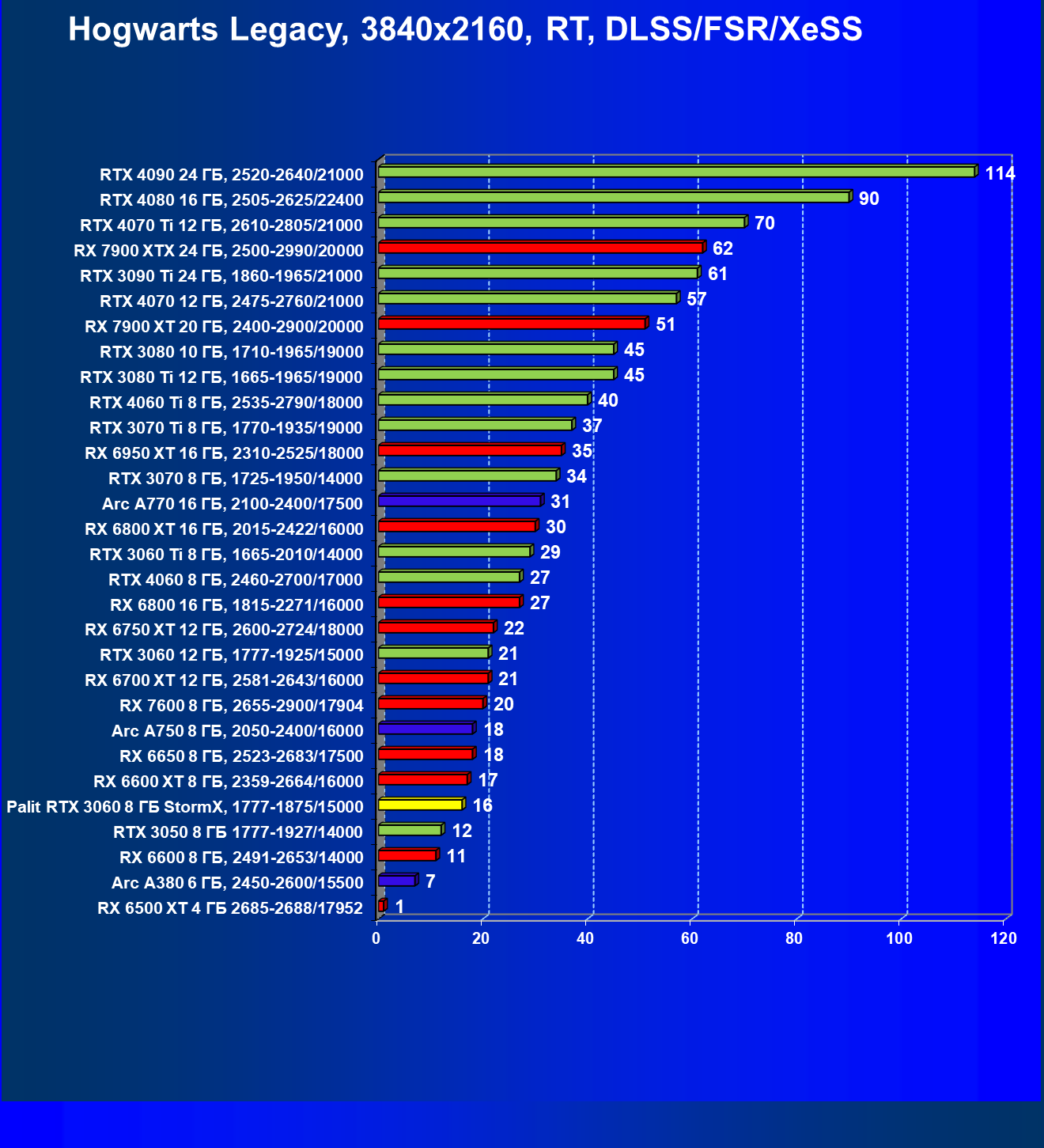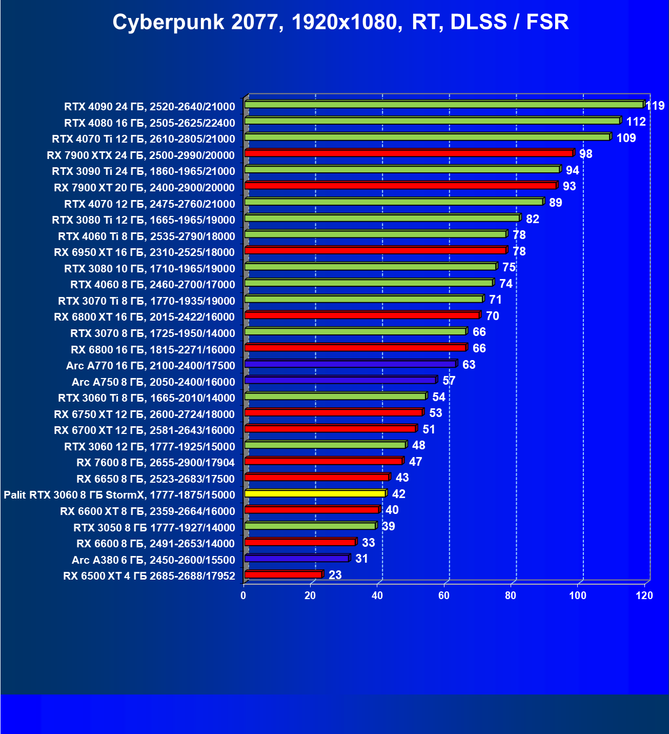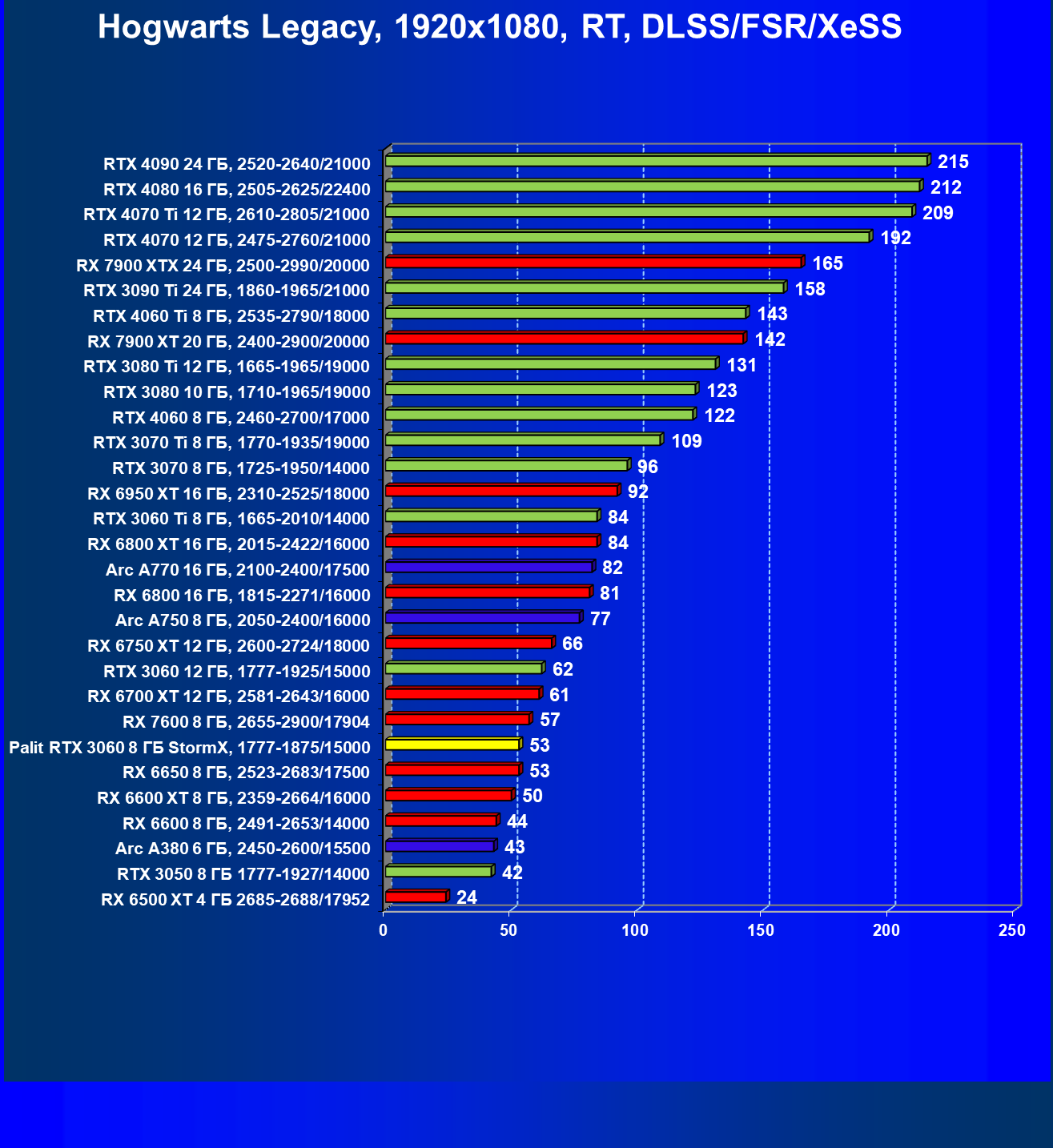 | 23 | RX 6650 XT 8 ГБ, 2410—2683/17500 | 274 | 86 | 32 000 |