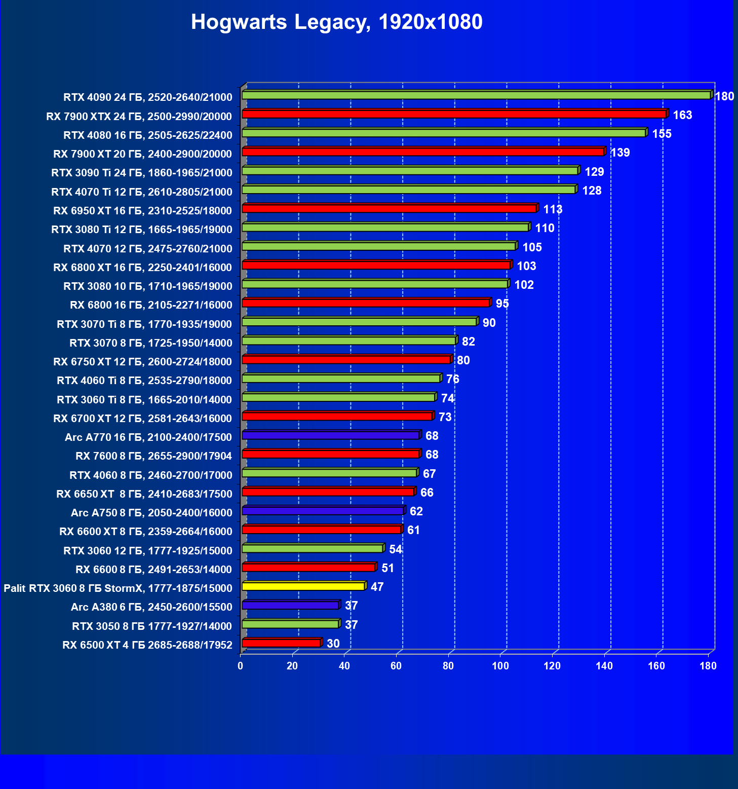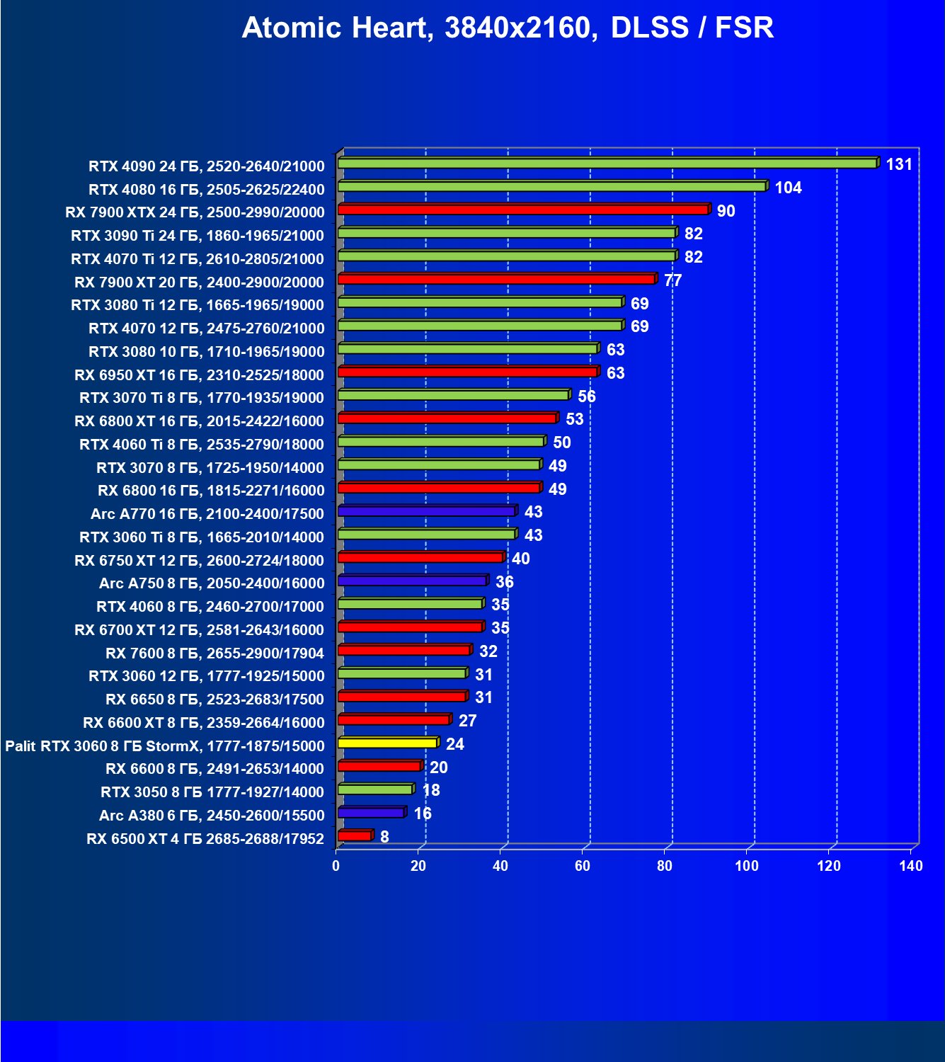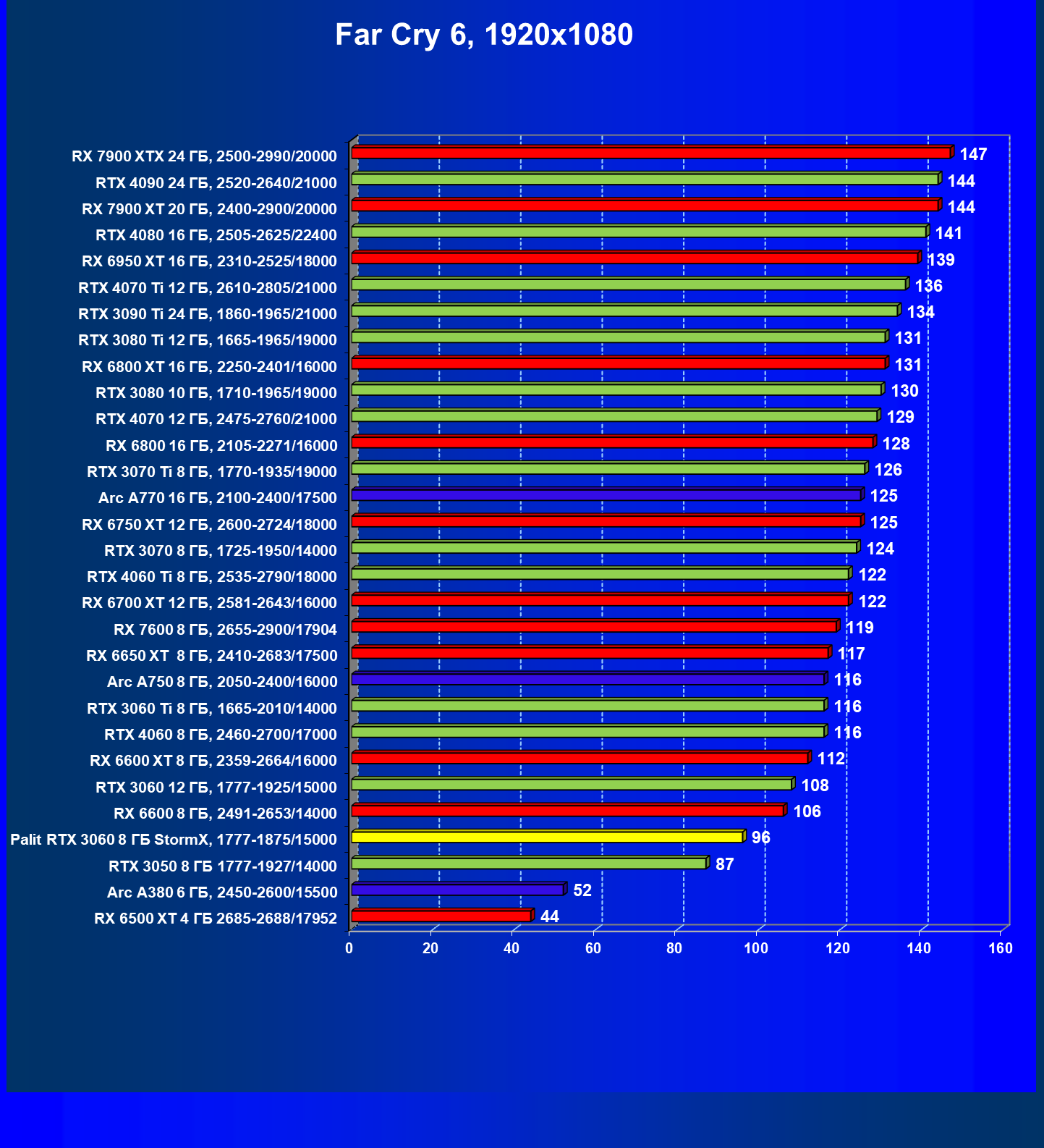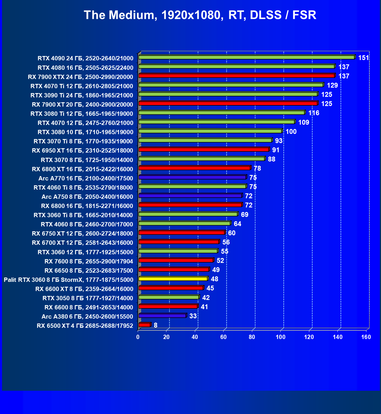 | 23 | RX 6650 XT 8 ГБ, 2410—2683/17500 | 274 | 86 | 32 000 |