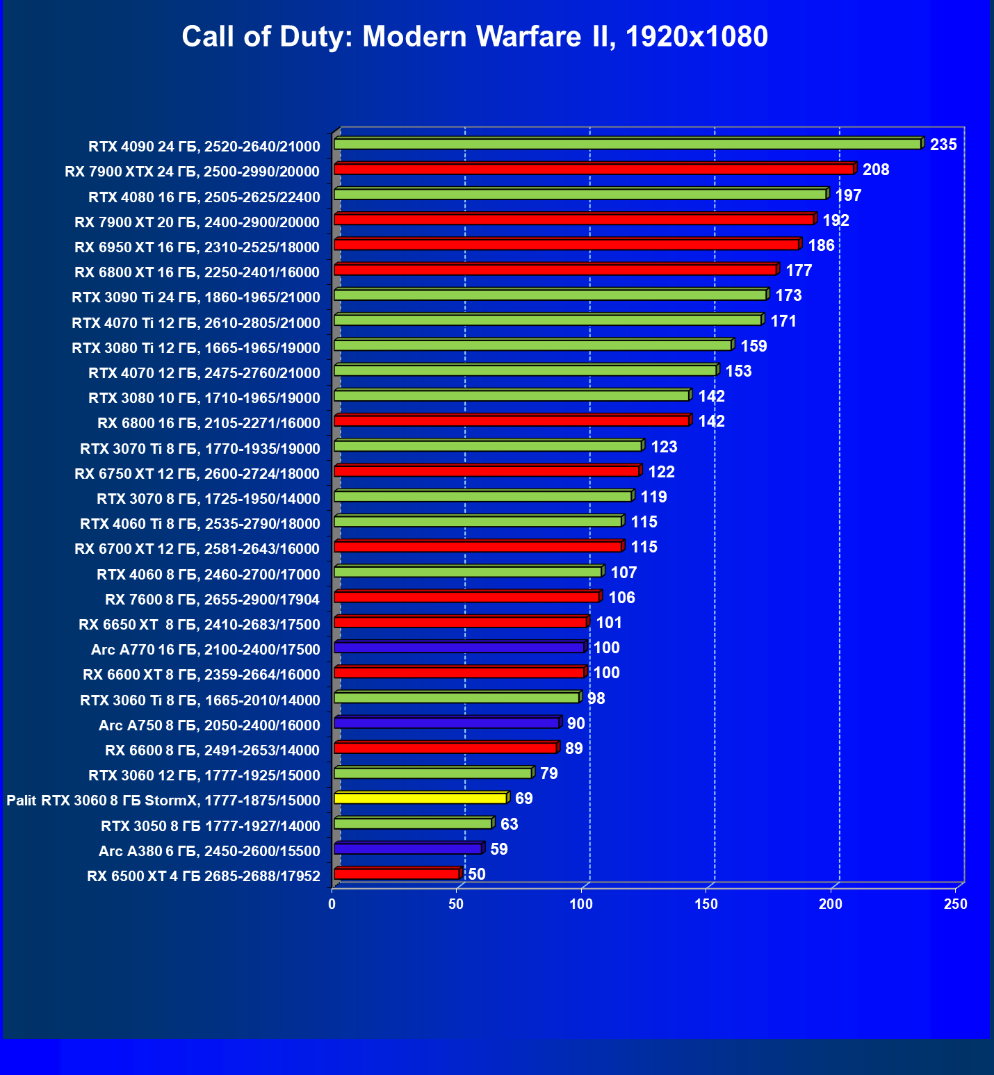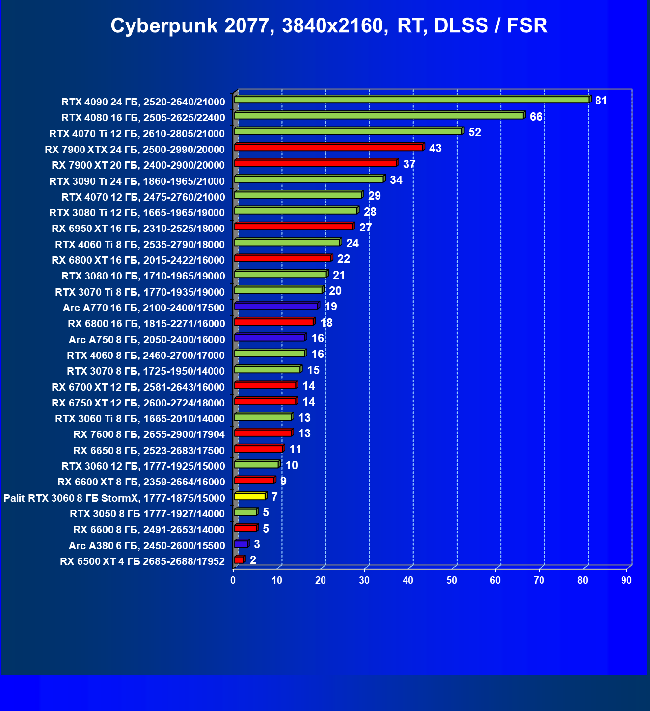 | 08 | RX 6650 XT 8 ГБ, 2410—2683/17500 | 86 | 274 | 32 000 |