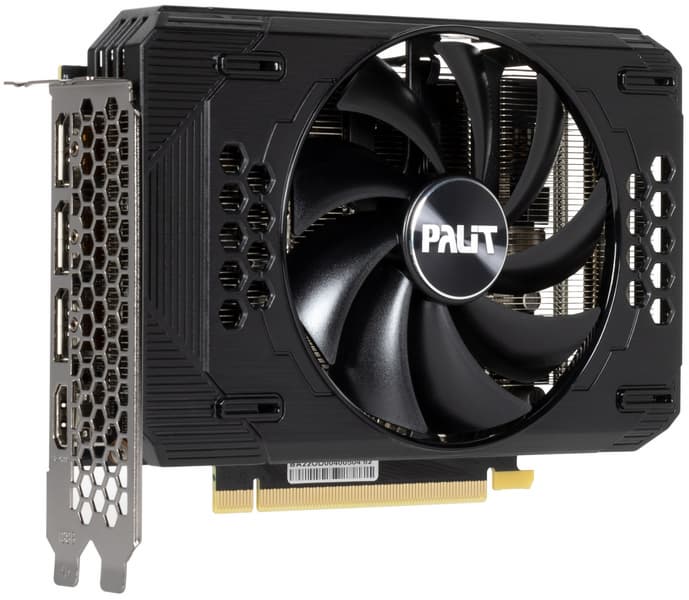 Рассмотренная карта Palit потребляет около 120 Вт. Система охлаждения очень компактная, эффективная и достаточно тихая. Габариты этой модели составляют 17 см в длину и 13 см в высоту, а по толщине она занимает 2 слота в корпусе. Набор видеовыходов стандартный: 3 DP и 1 HDMI. Карта Palit имеет один 8-контактный разъем питания версии PCIe 2.0.
