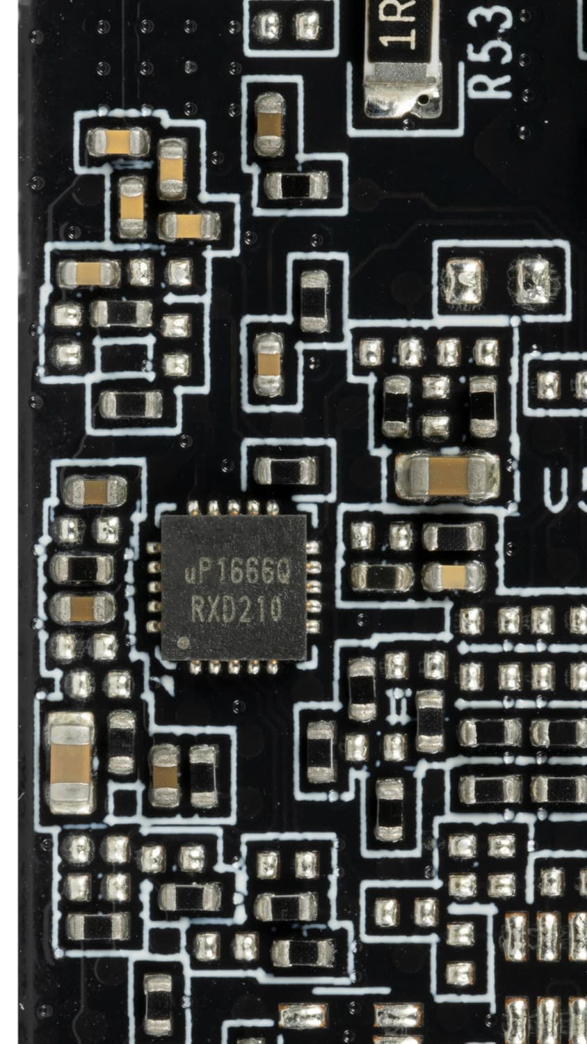 А контроллер uP1666Q управляет двумя фазами питания микросхем памяти. Оба контроллера расположены на обороте печатной платы.
