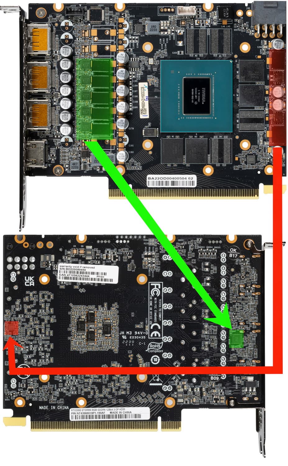 Графическое ядро имеет стандартную для GeForce RTX 3060 маркировку GA106-302, произведено примерно в середине 2022 года.