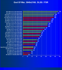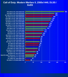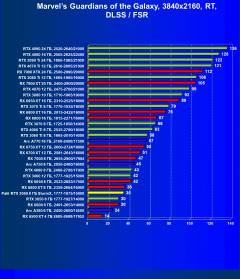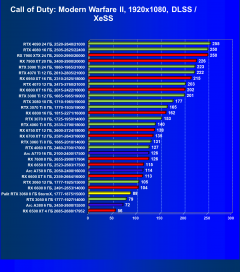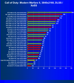 Рейтинг составлен по 9 тестам, в которых используется технология трассировки лучей и одновременно технология Nvidia DLSS, AMD FSR или Intel XeSS. Этот рейтинг нормирован по самому слабому ускорителю в данной группе — Radeon RX 6500 XT (то есть сочетание скорости и функций Radeon RX 6500 XT приняты за 100%).