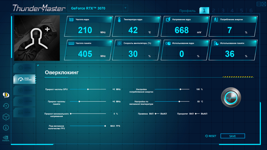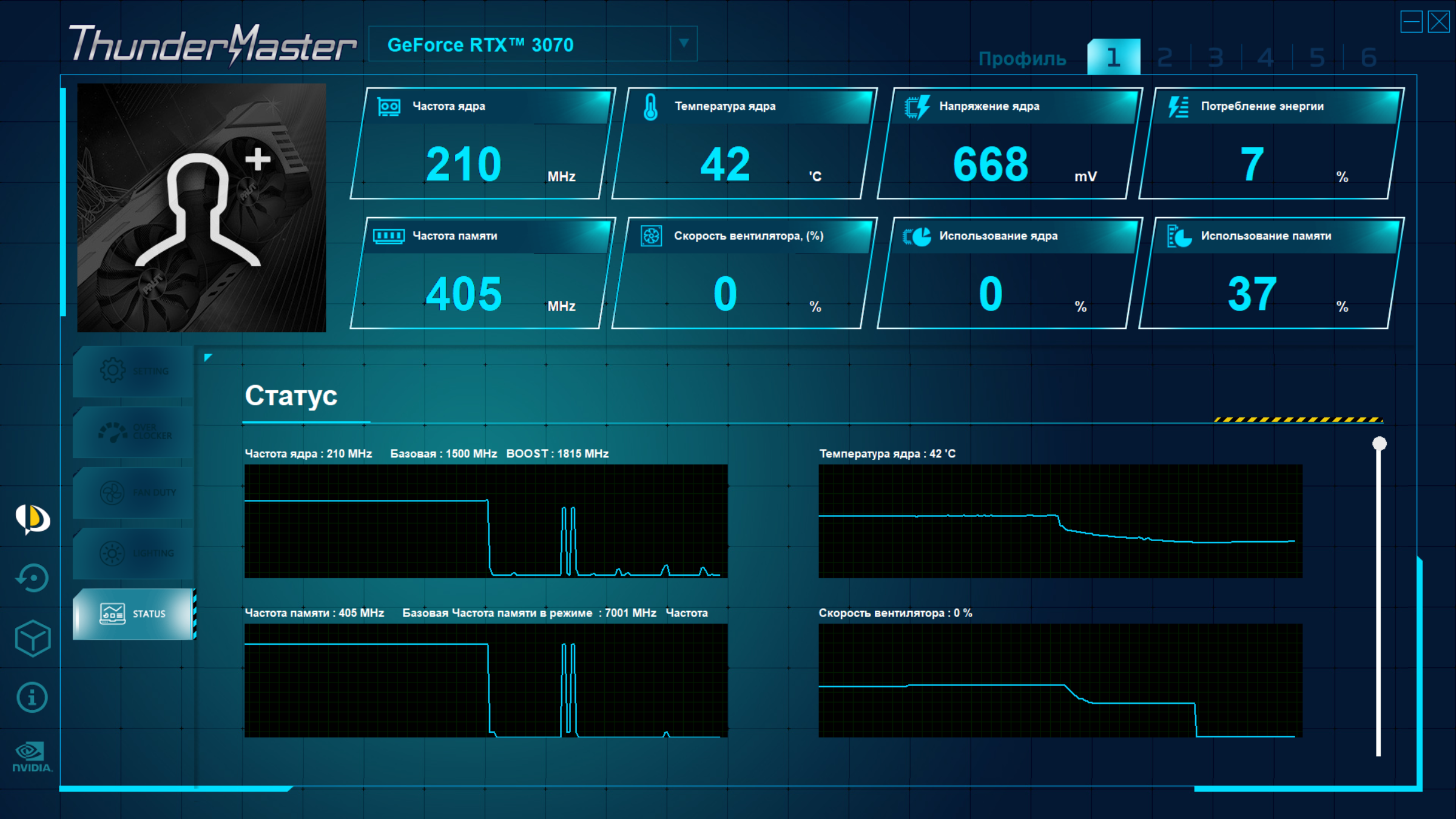 Управление работой карты обеспечивается с помощью фирменной утилиты Palit ThunderMaster.