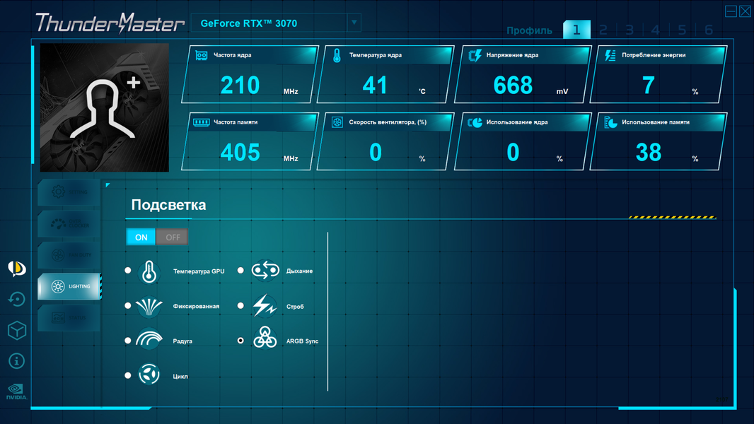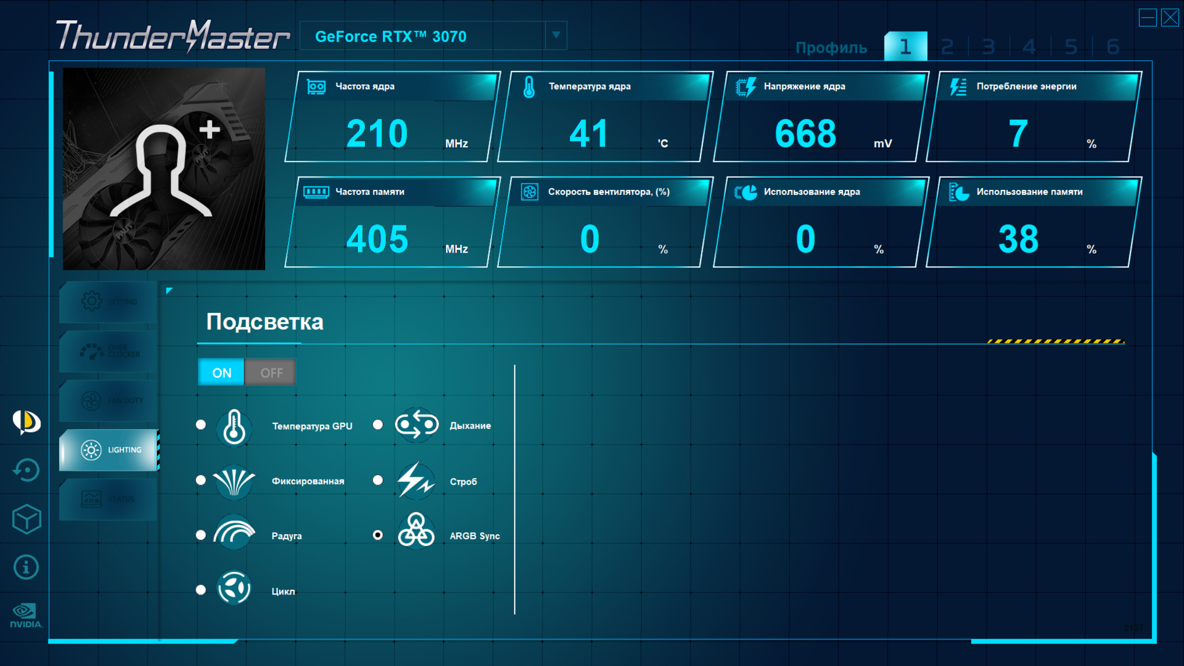 Управление режимами подсветки, в том числе и ее отключением, осуществляется той же утилитой Thunder Master.