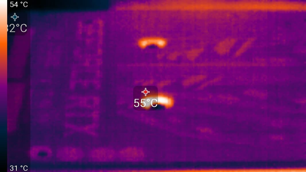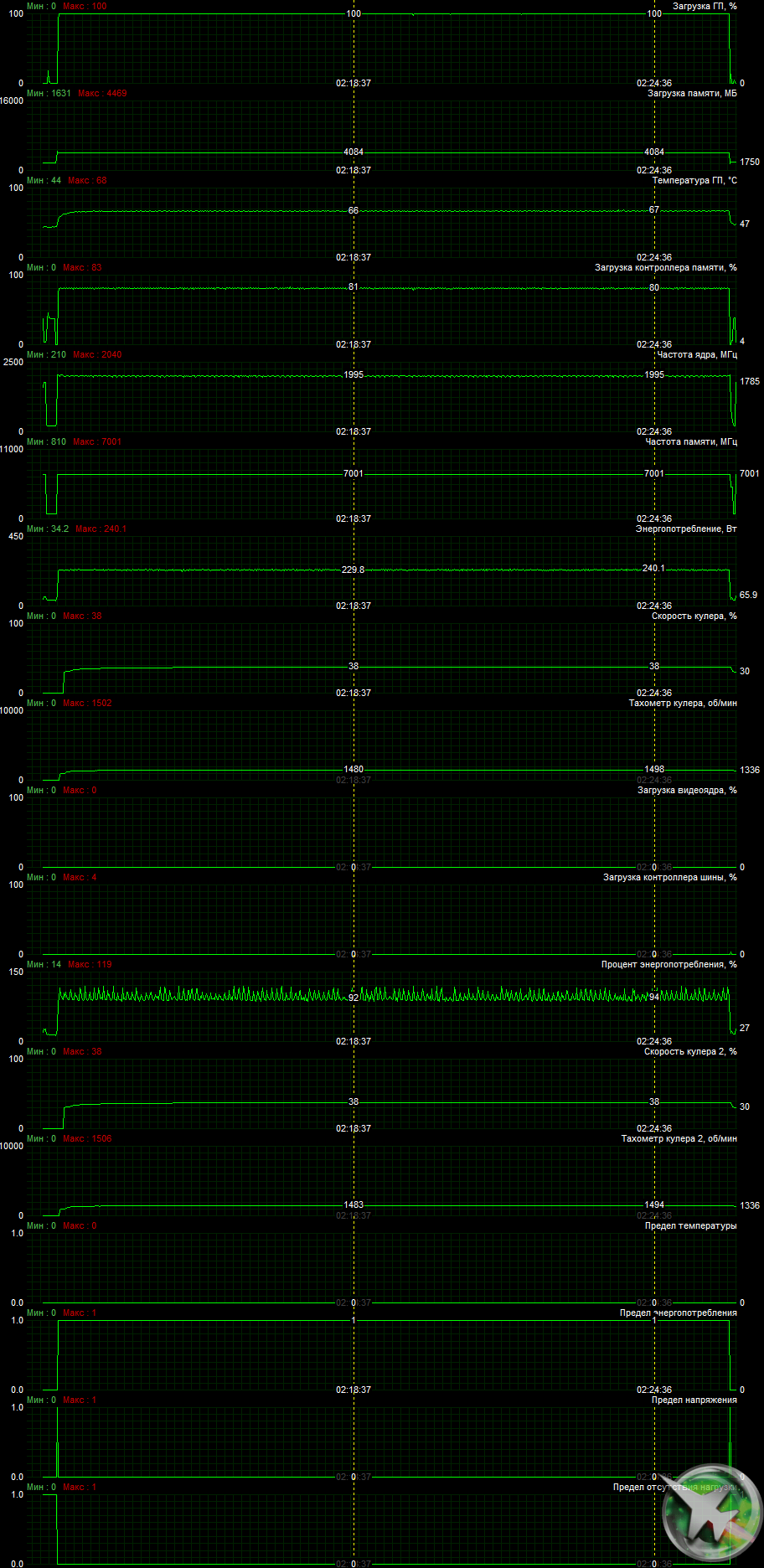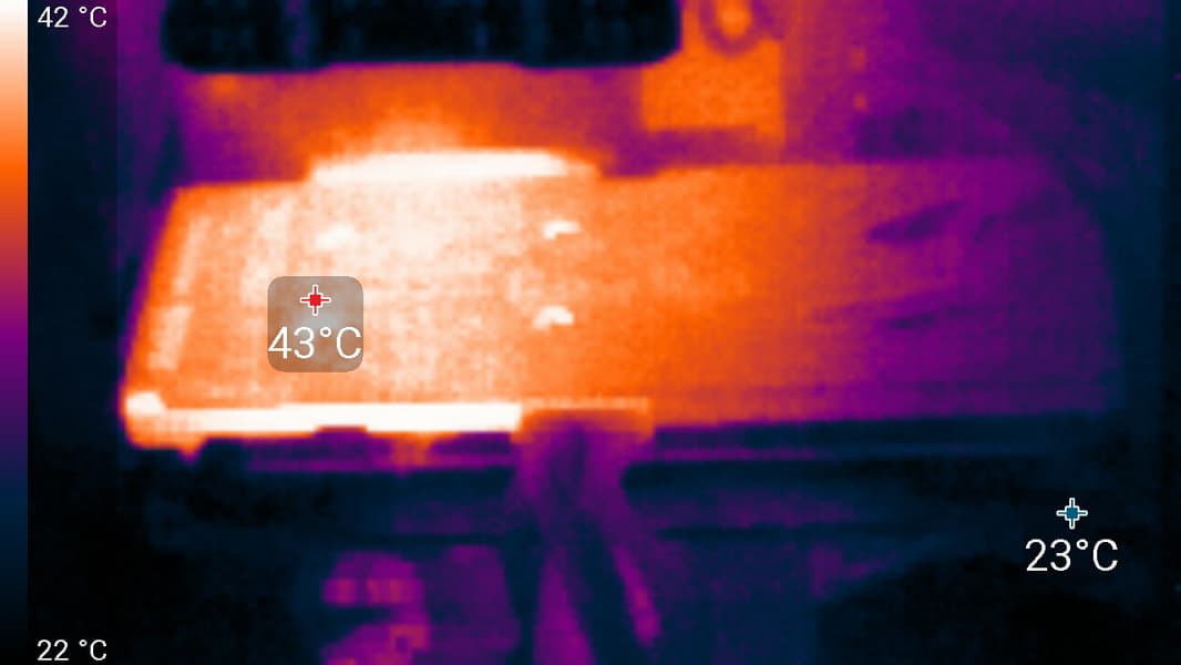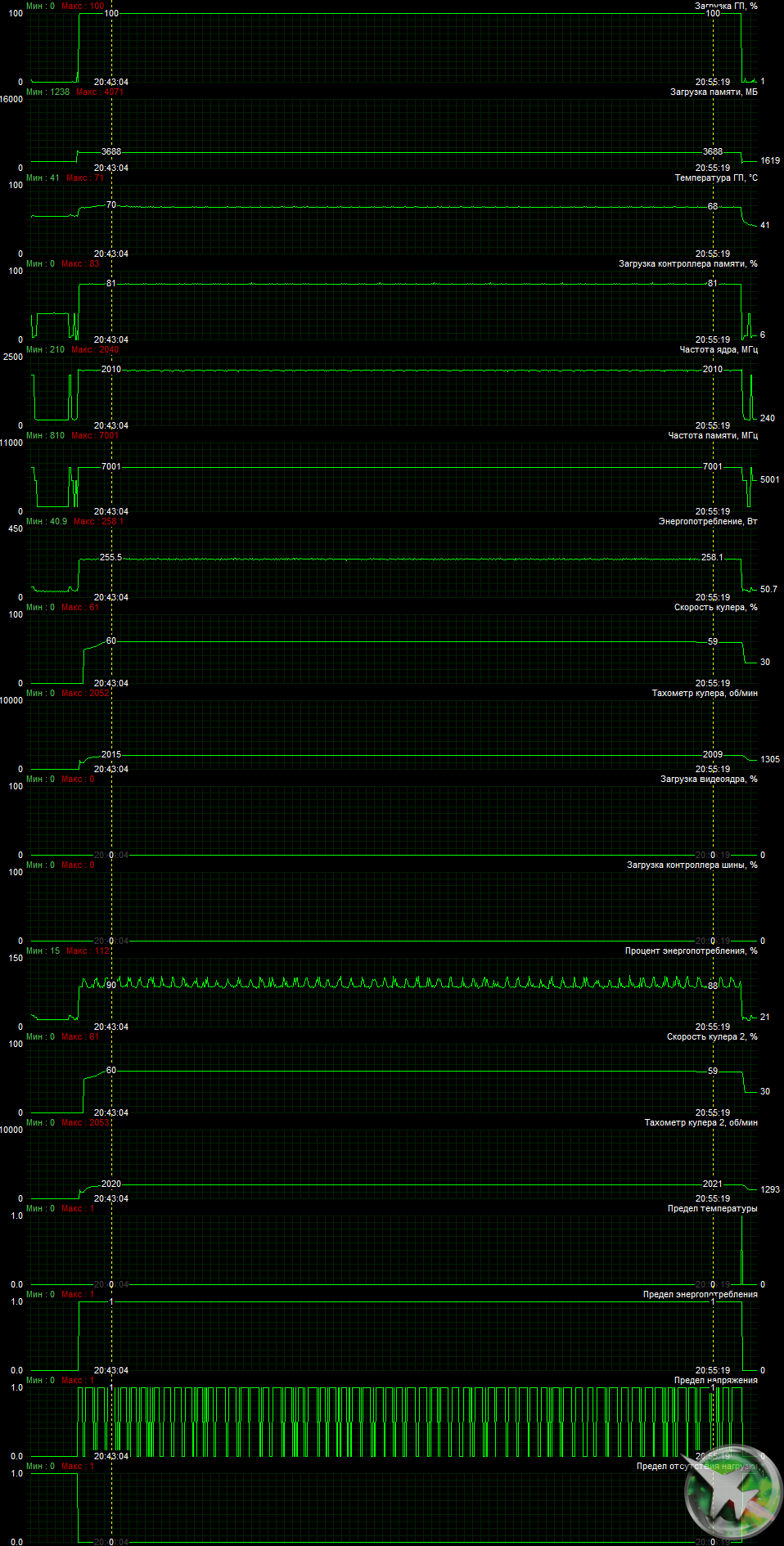 После 2-часового прогона под нагрузкой максимальная температура ядра не превысила 70 градусов, что является приемлемым результатом для видеокарт такого уровня. Максимальная мощность была зафиксирована на уровне 258 Вт, а максимальный нагрев наблюдался в левой части PCB, в основном слева от ядра (и основным источником нагрева являются преобразователи питания).