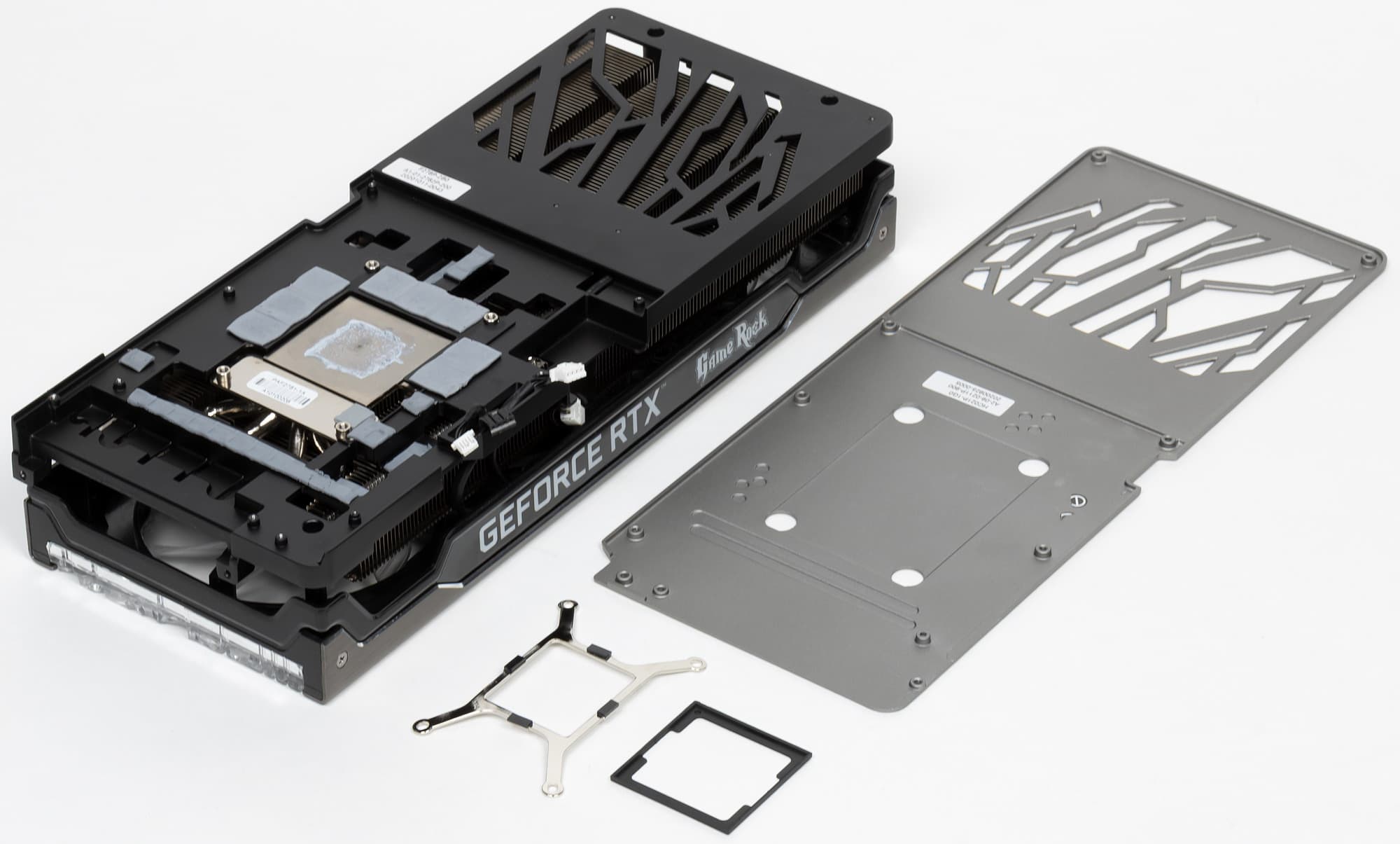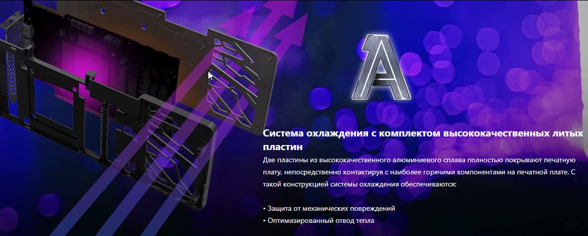 Перед нами большой двухсекционный пластинчатый радиатор с тепловыми трубками, подошва которого охлаждает GPU. Микросхемы памяти, как и преобразователи питания VRM, охлаждаются с помощью отдельной пластины, прикрученной к основному радиатору. Задняя пластина служит элементом жесткости и защиты печатной платы.