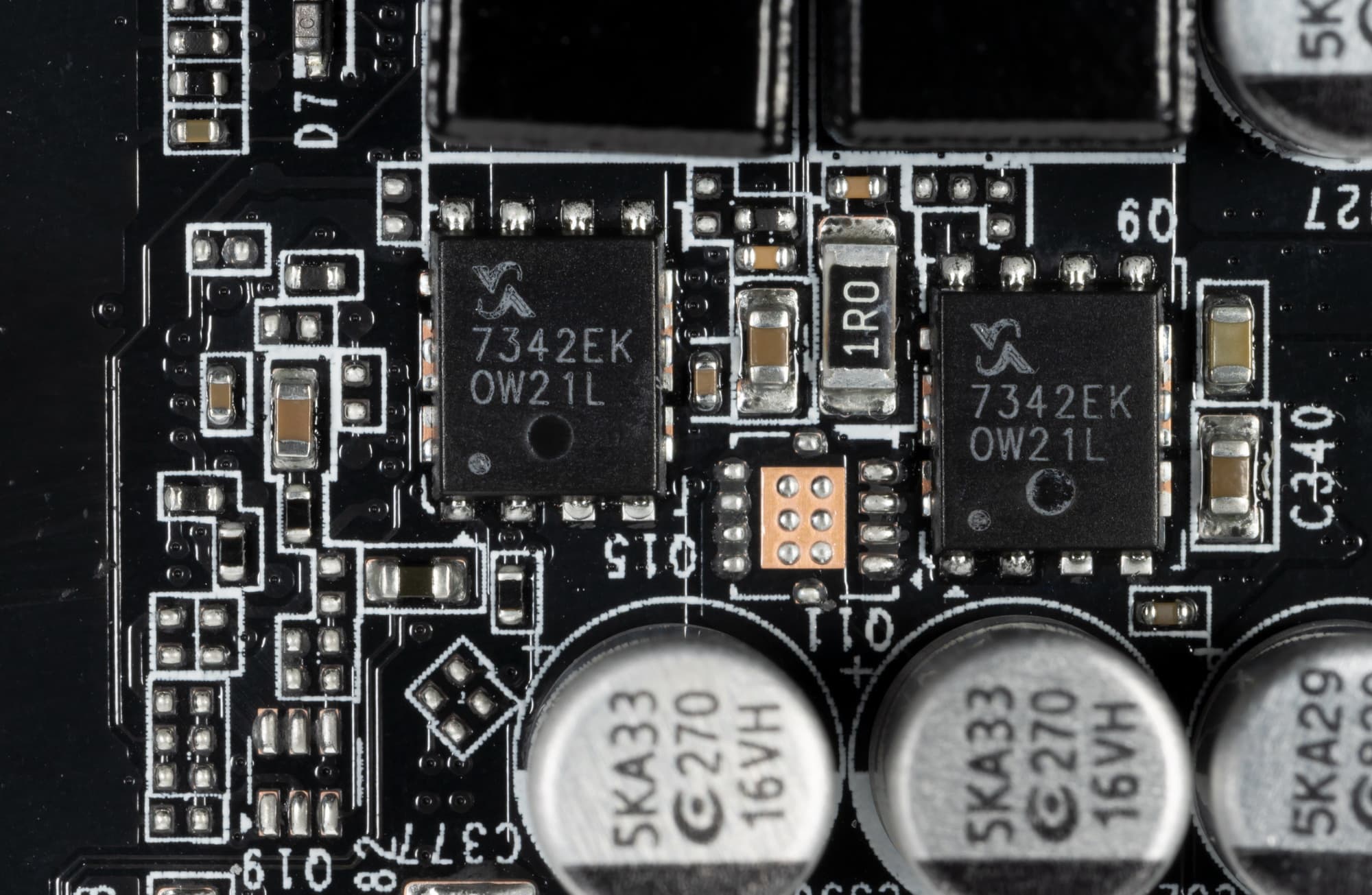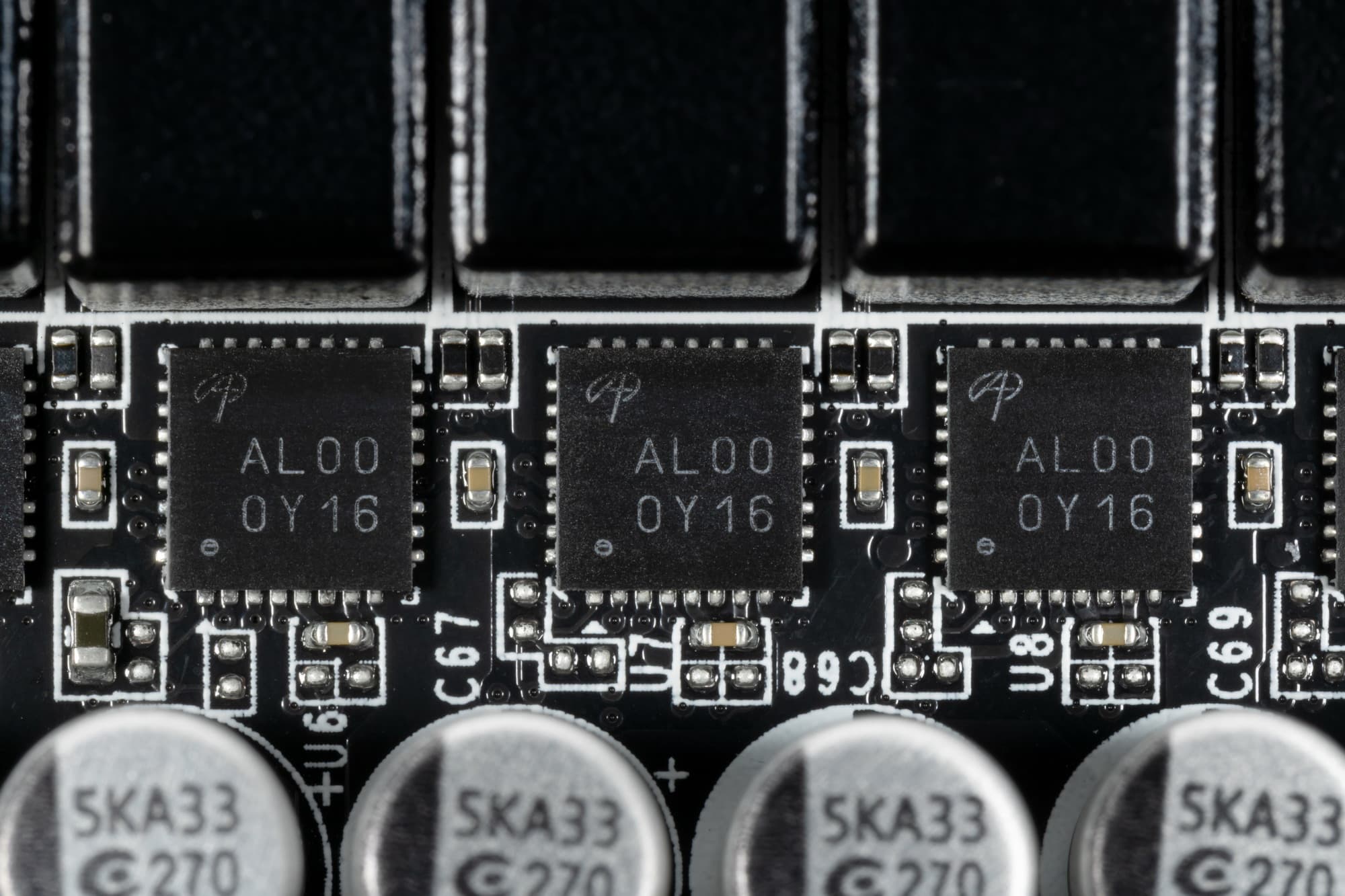 В преобразователе питания, традиционно для всех видеокарт Nvidia, используются транзисторные сборки DrMOS — в данном случае AOZ5332QI (Alpha & Omega Semiconductor) в цепях питания ядра, каждая из которых рассчитана максимально на 50 А.