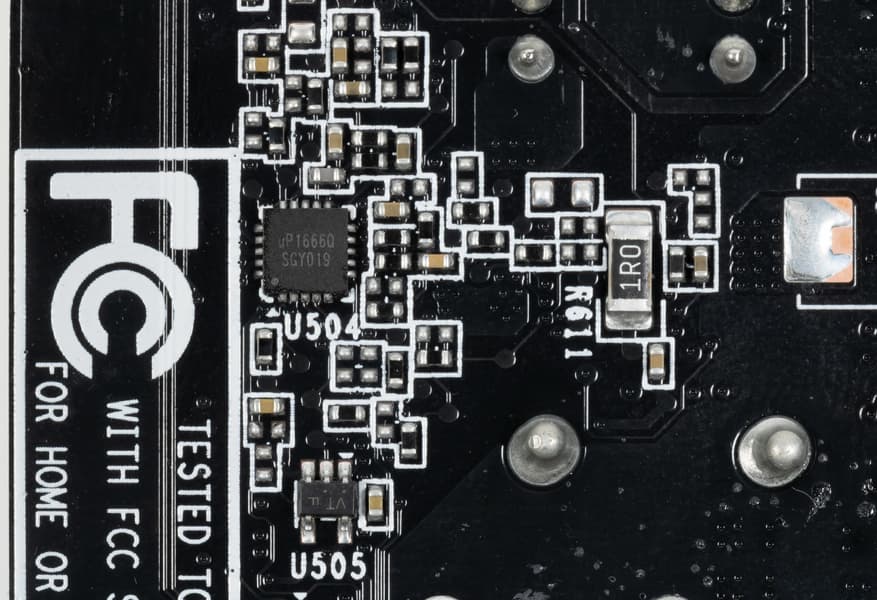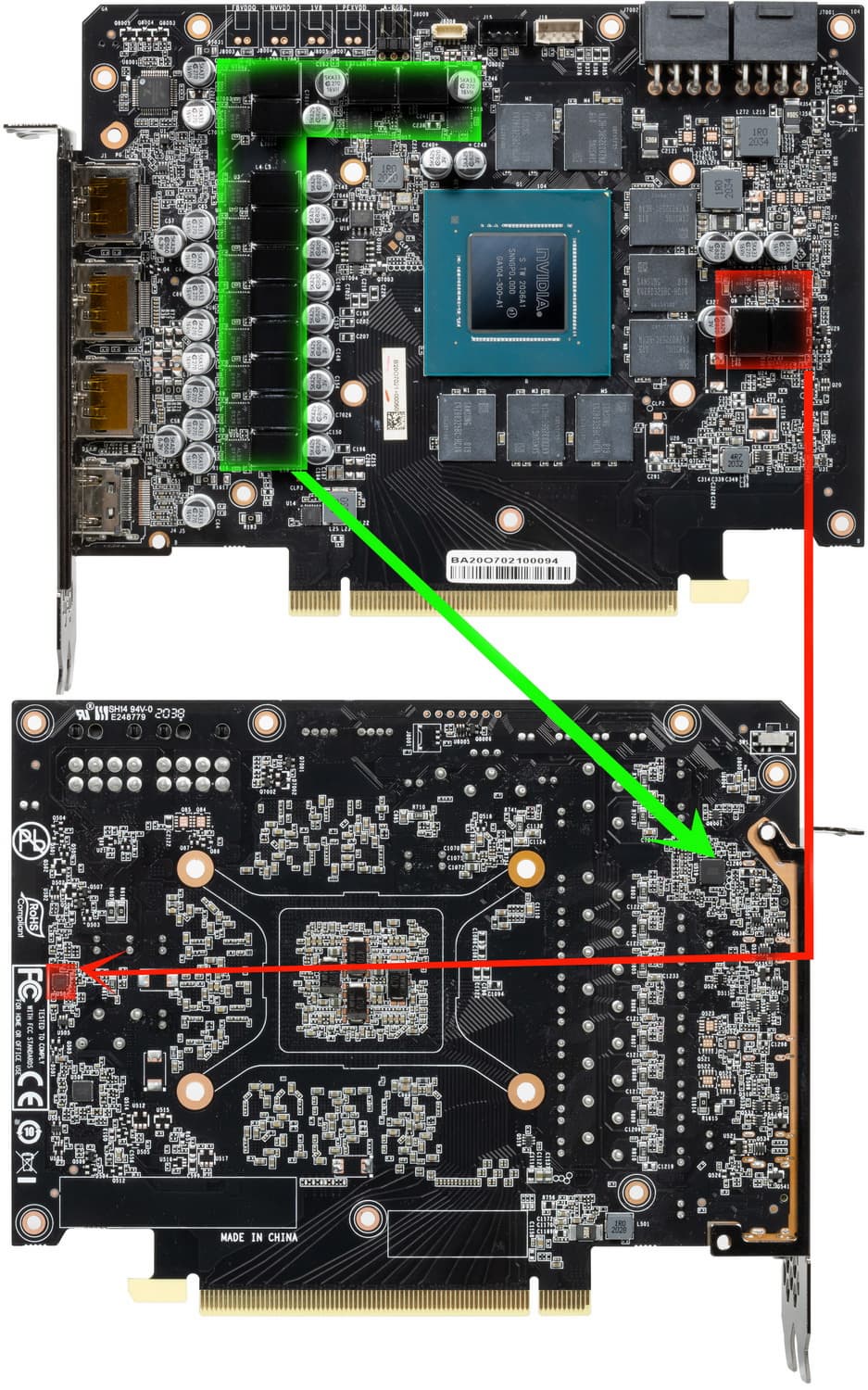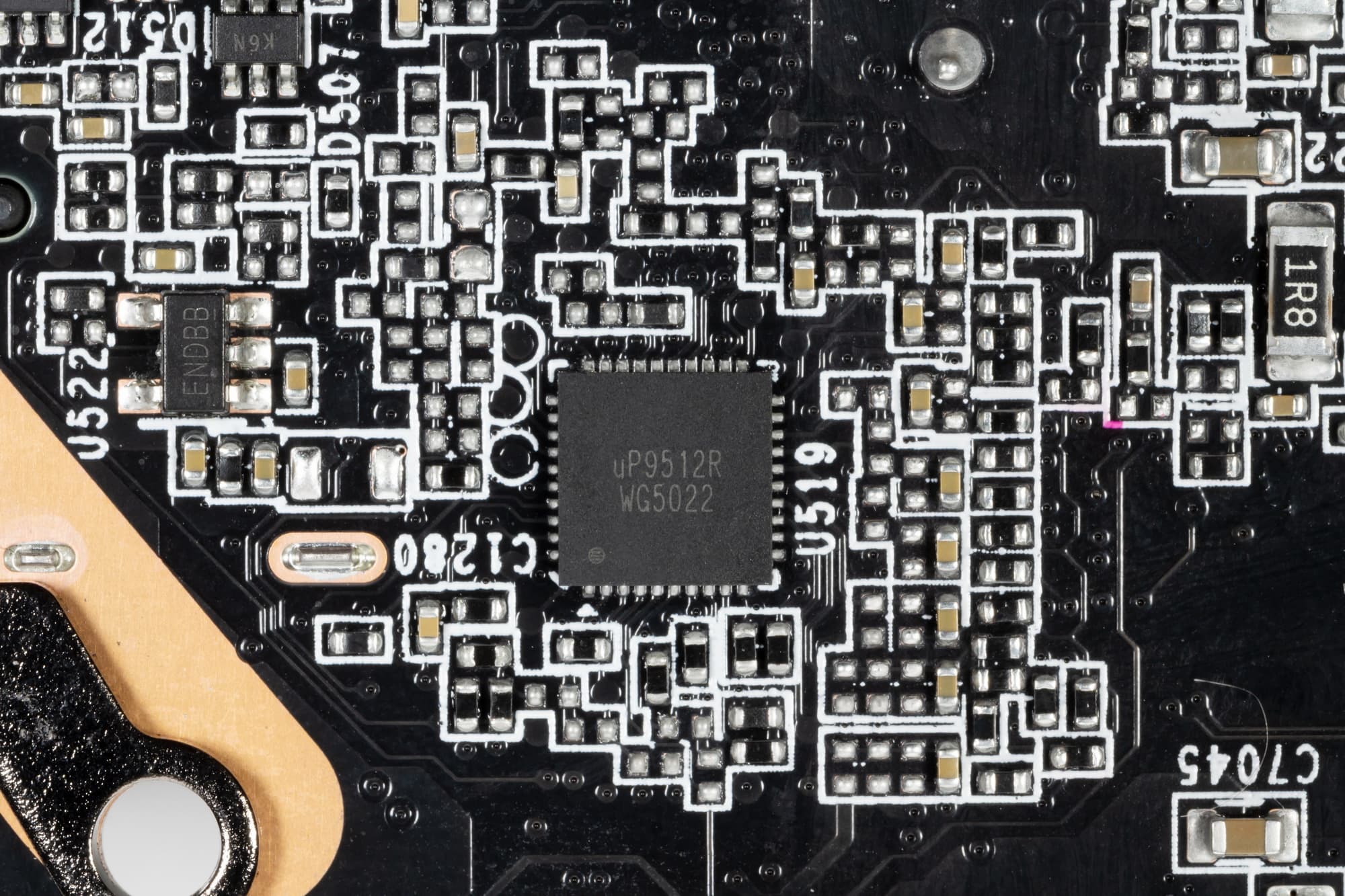 Зеленым цветом отмечена схема питания ядра, красным — памяти. Для управления схемой питания GPU используется ШИМ-контроллер uP9512R (uPI Semiconductor), он расположен на оборотной стороне платы.