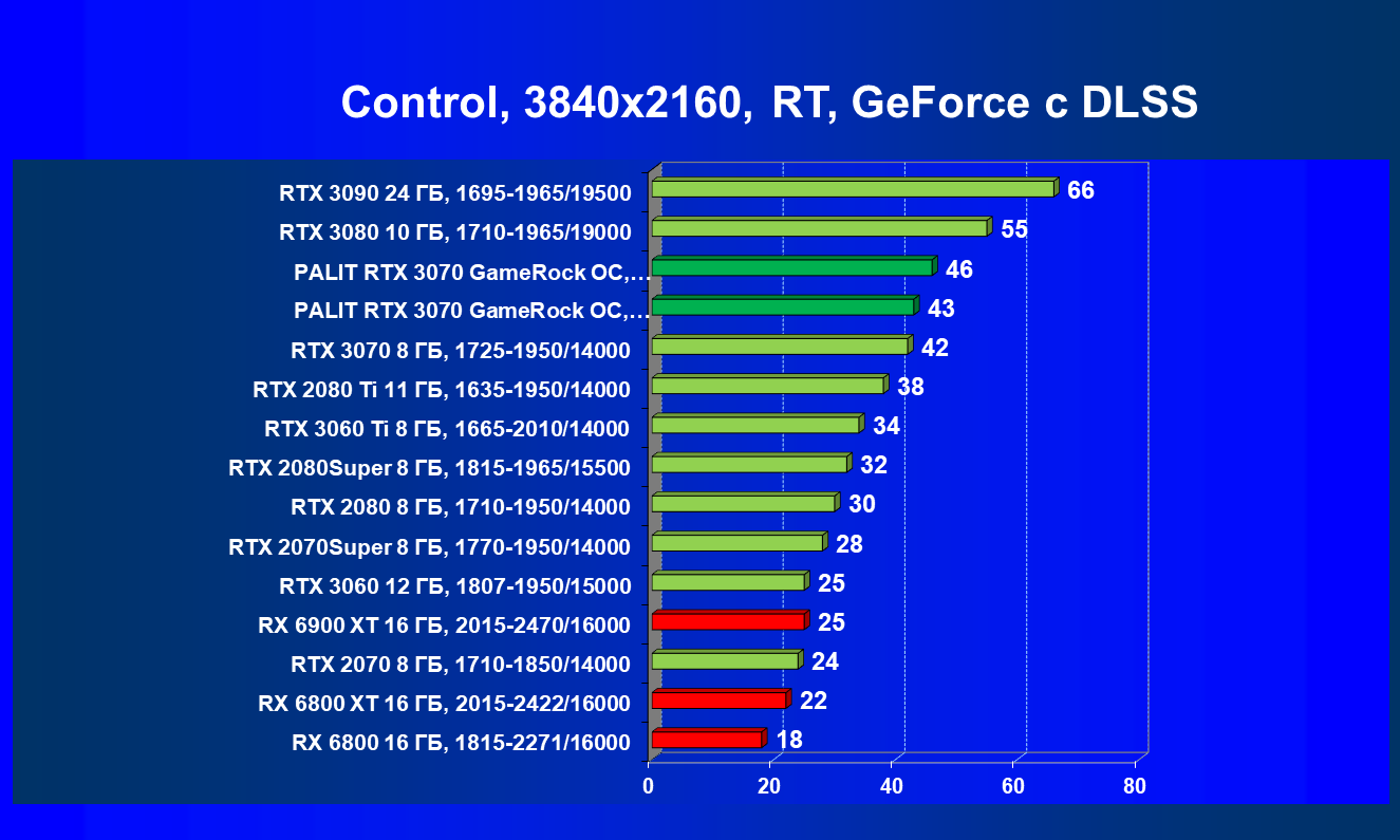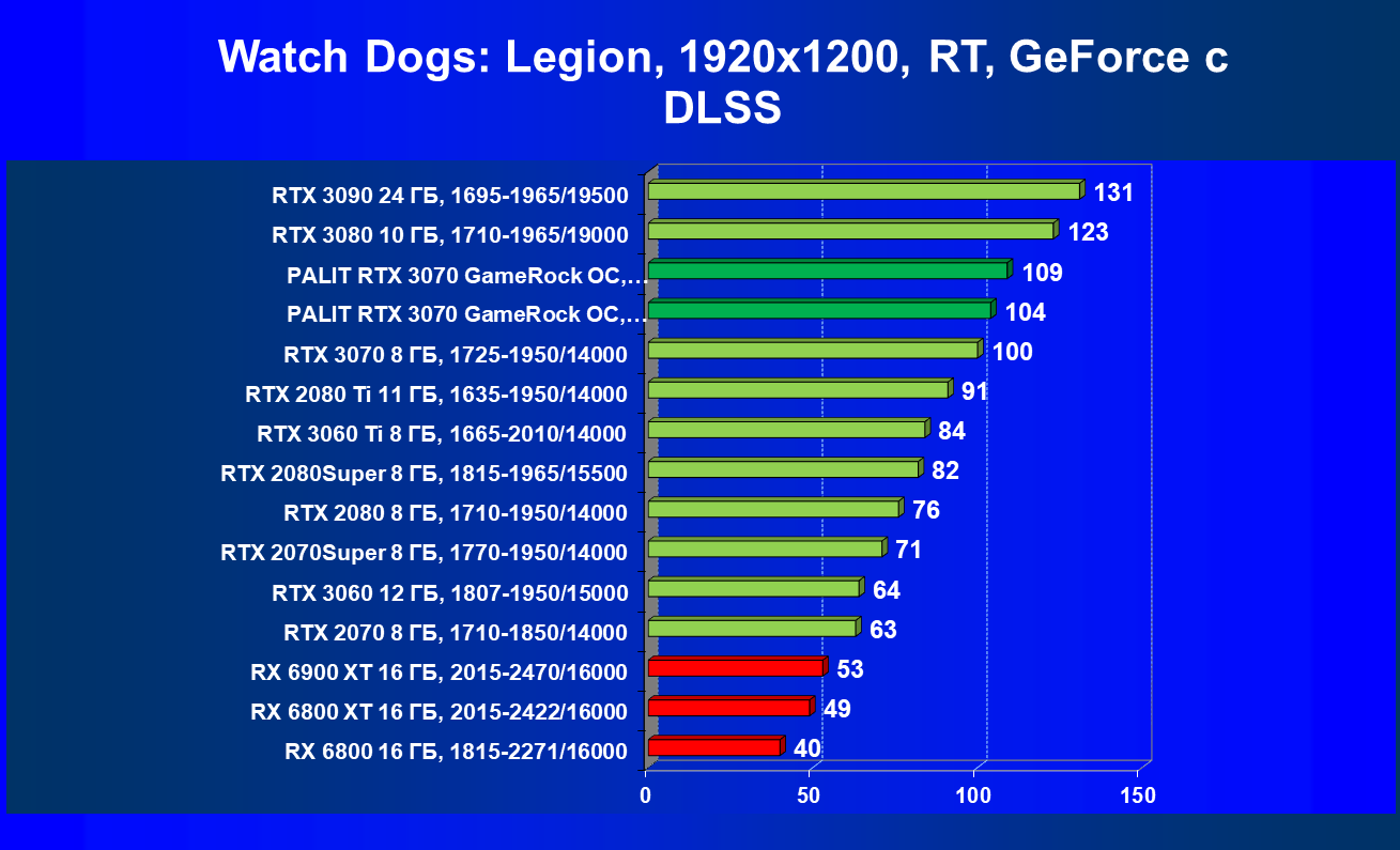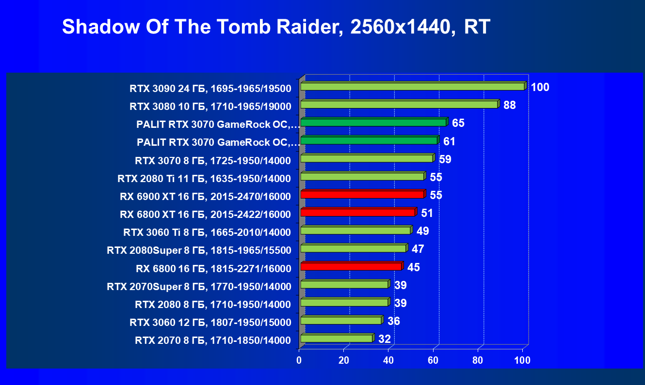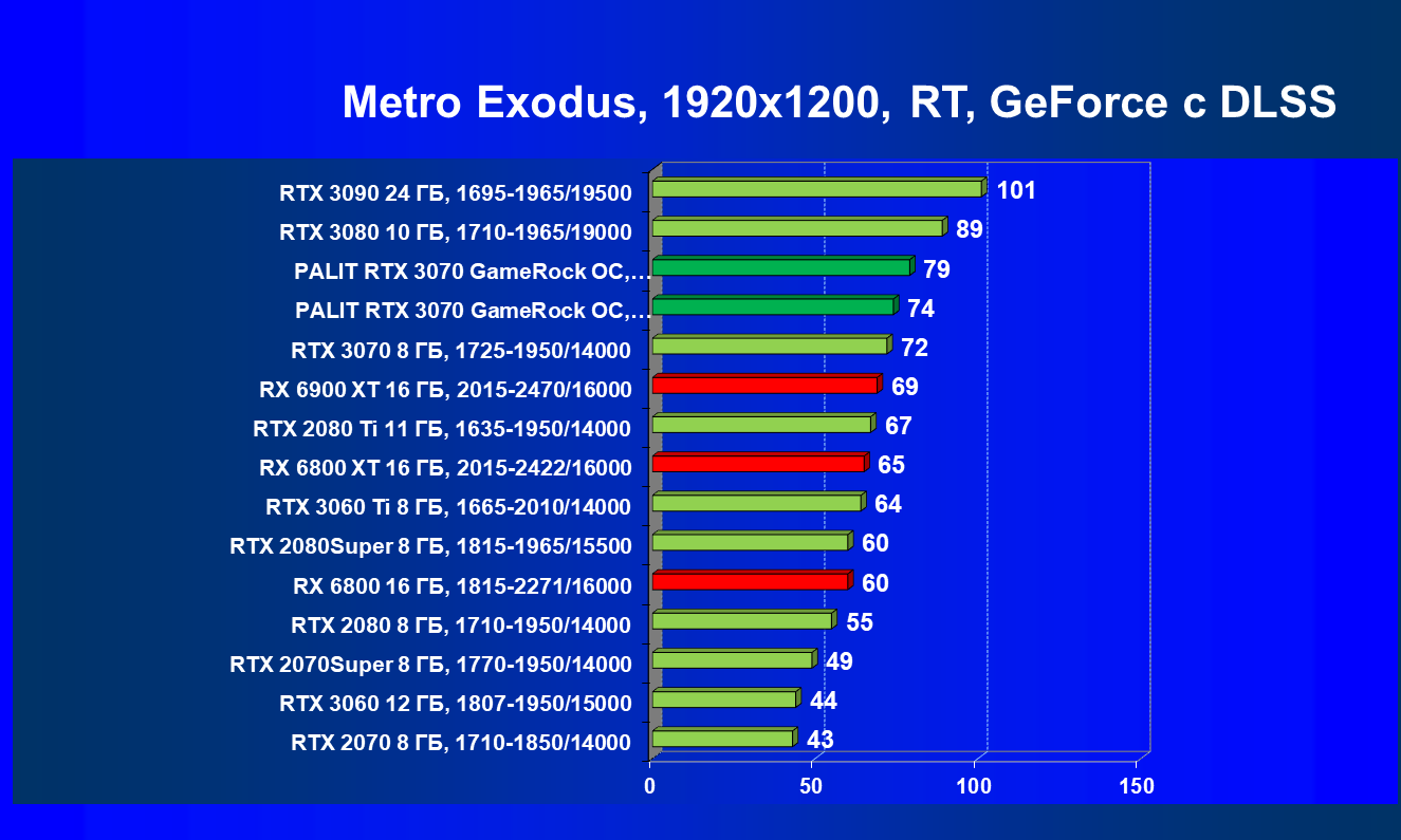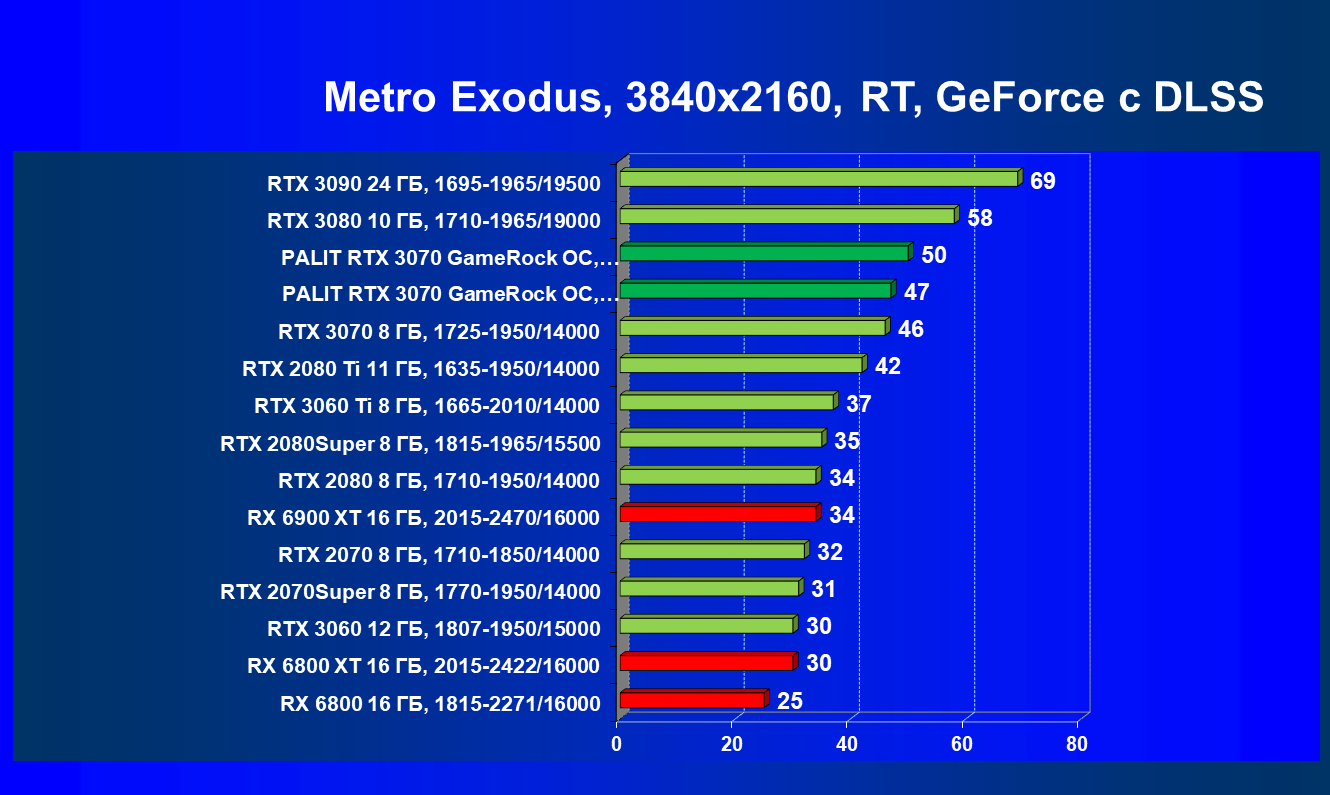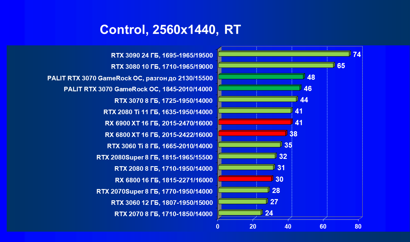 Всем интересующимся хорошо известно, что Radeon RX 6800 немного обходит GeForce RTX 3070 в играх с растеризацией без трассировки лучей. Небольшой фабричный разгон карты Palit не позволил ей догнать соперника, а вот с ручным разгоном карта уже заняла первое место в группе, обойдя Radeon RX 6800, который, кстати, уже можно найти дешевле, чем GeForce RTX 3070.