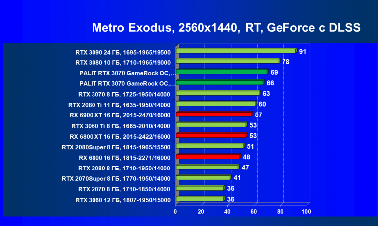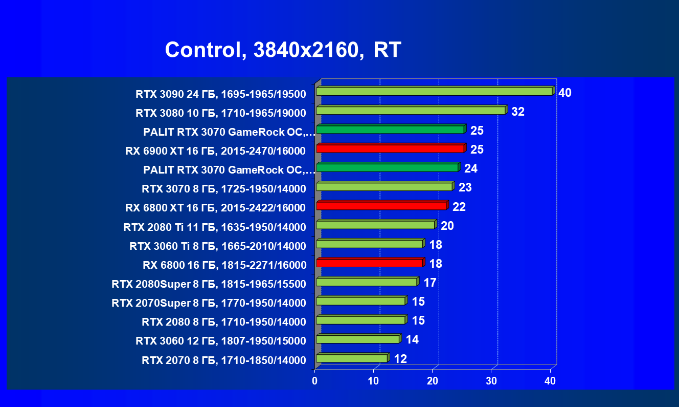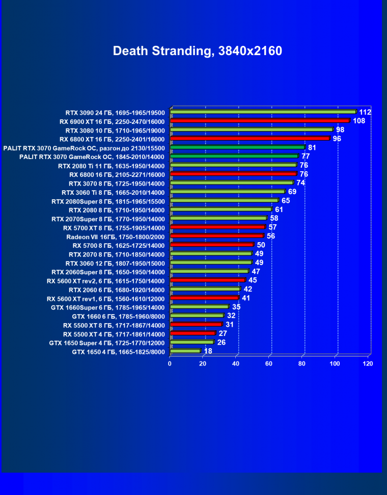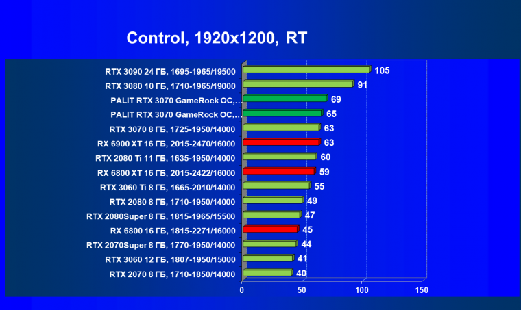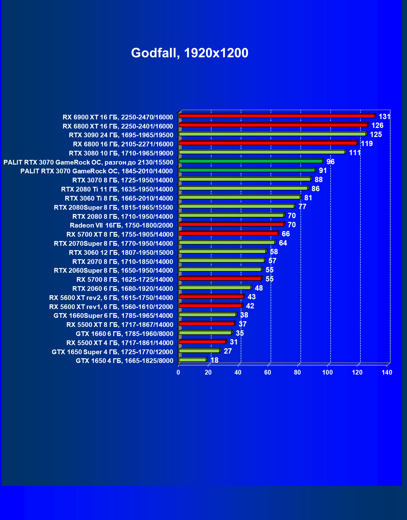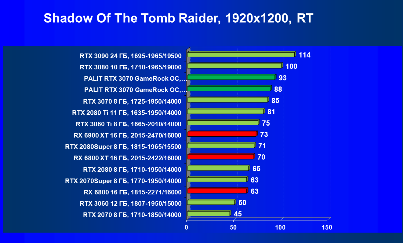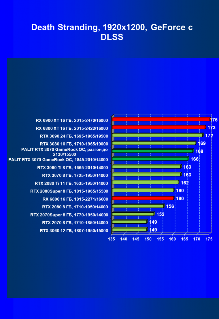 Всем интересующимся хорошо известно, что Radeon RX 6800 немного обходит GeForce RTX 3070 в играх с растеризацией без трассировки лучей. Небольшой фабричный разгон карты Palit не позволил ей догнать соперника, а вот с ручным разгоном карта уже заняла первое место в группе, обойдя Radeon RX 6800, который, кстати, уже можно найти дешевле, чем GeForce RTX 3070.