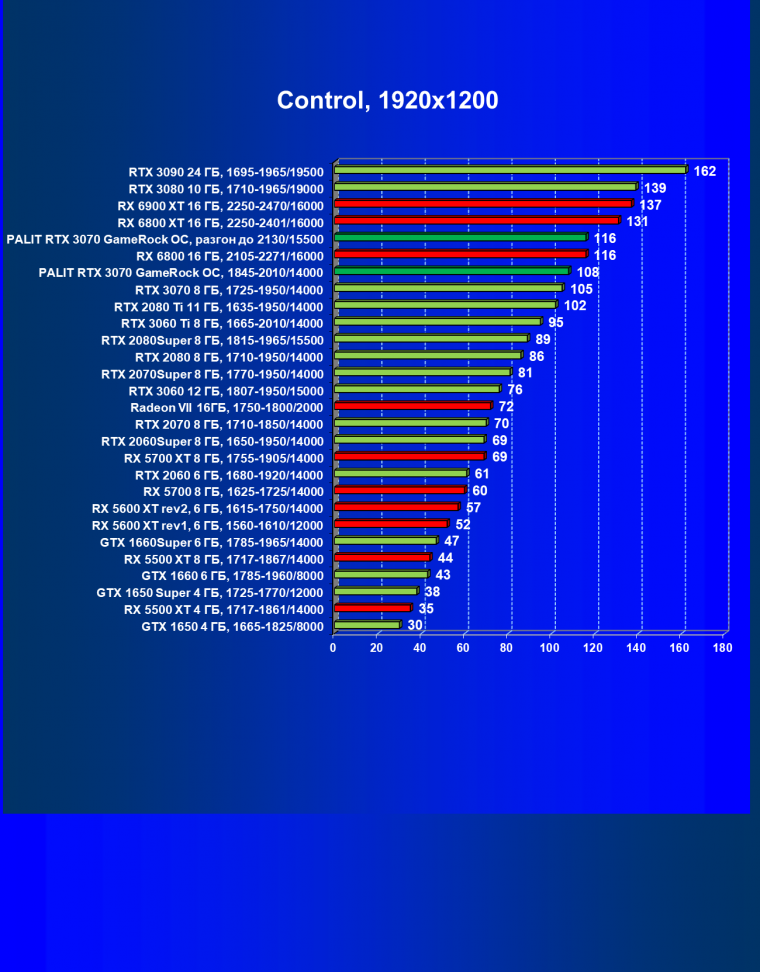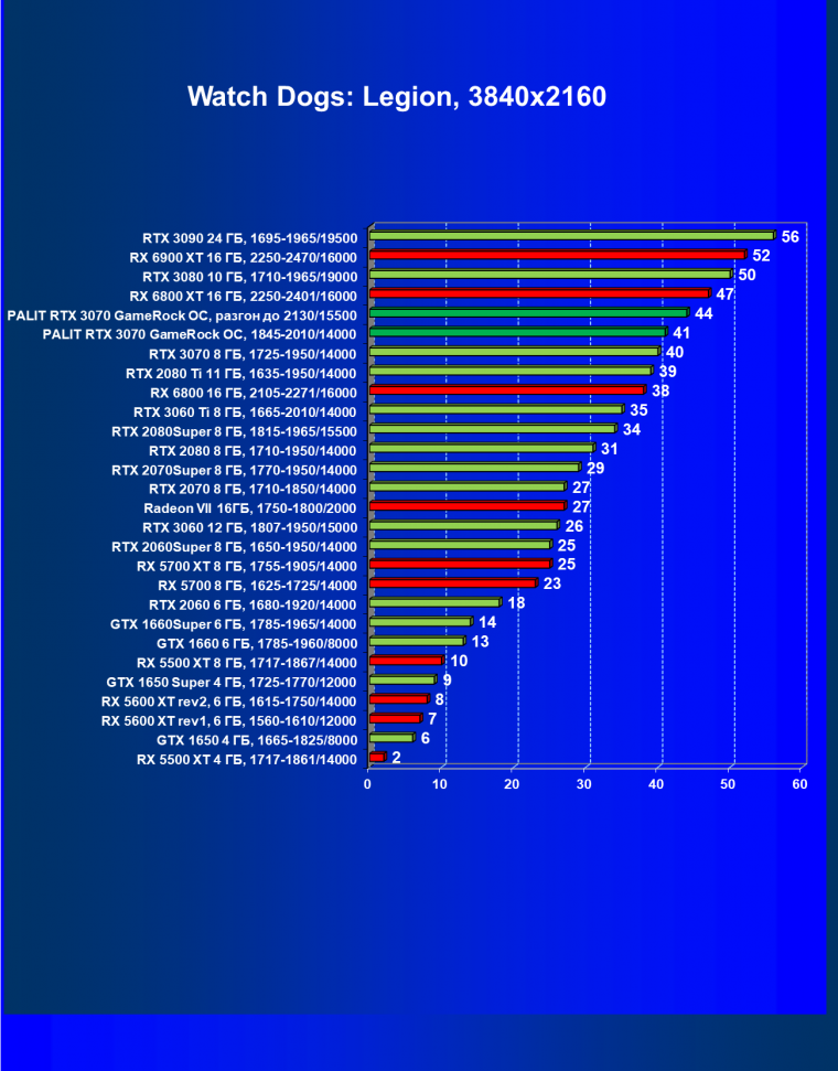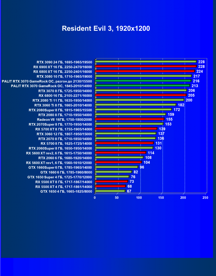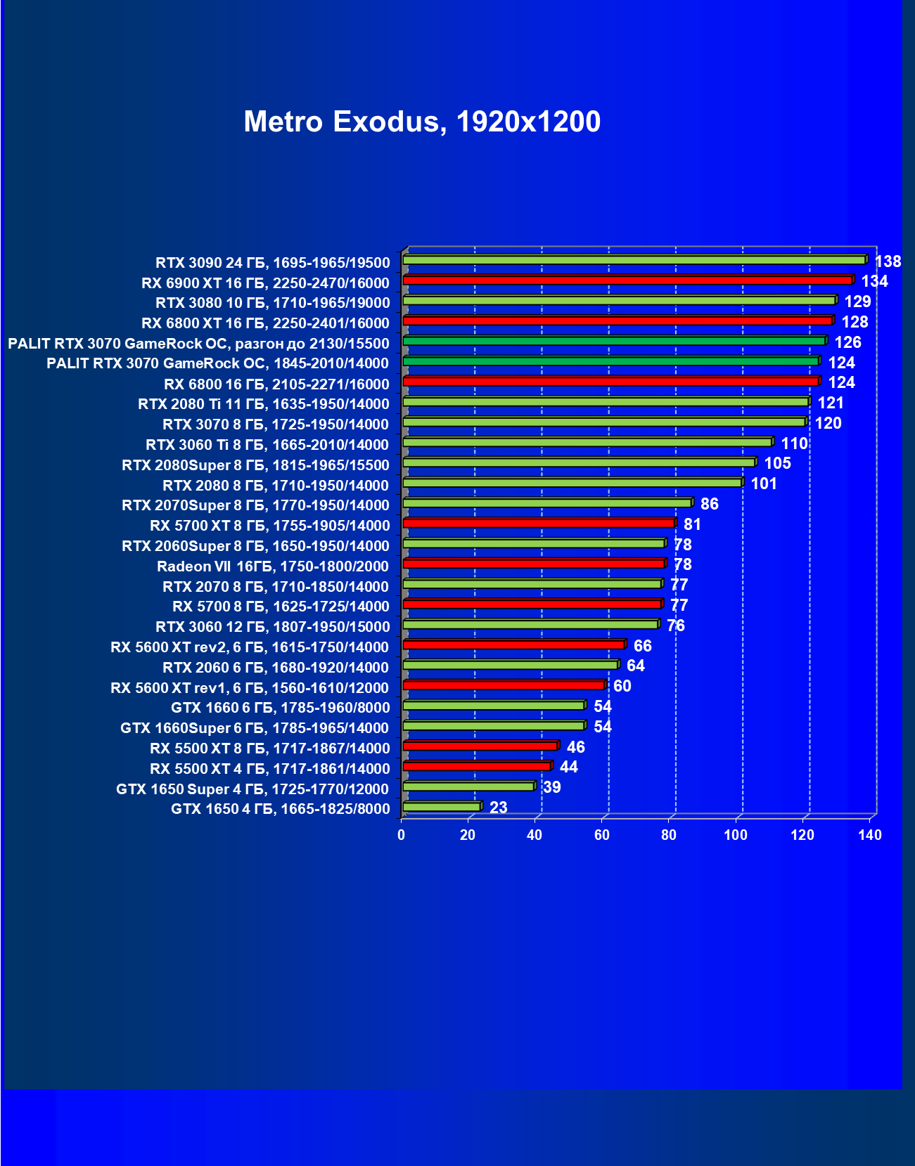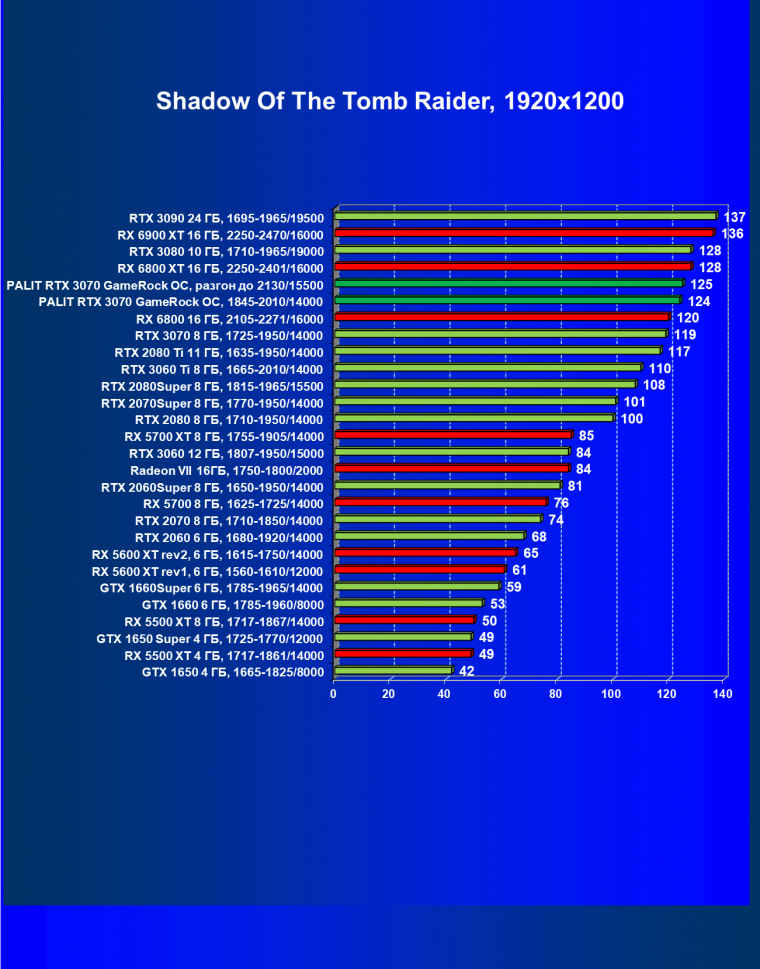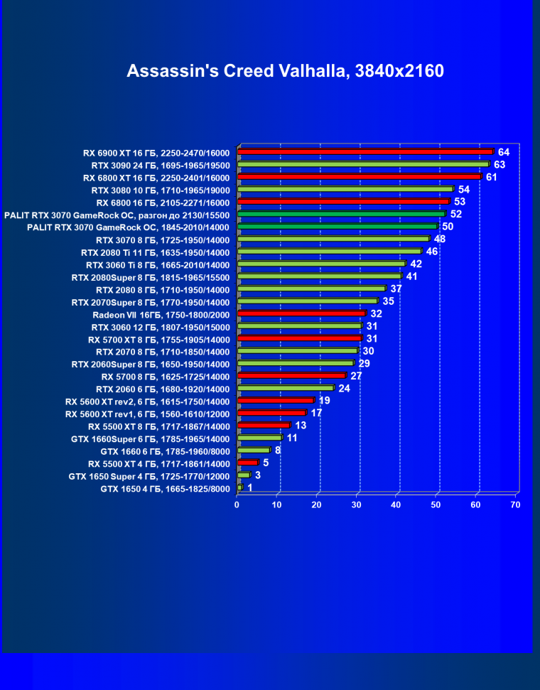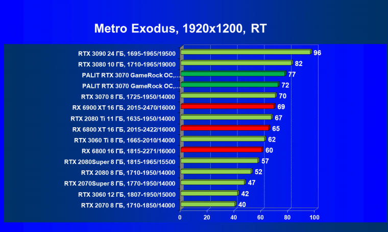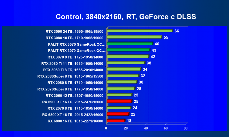 Всем интересующимся хорошо известно, что Radeon RX 6800 немного обходит GeForce RTX 3070 в играх с растеризацией без трассировки лучей. Небольшой фабричный разгон карты Palit не позволил ей догнать соперника, а вот с ручным разгоном карта уже заняла первое место в группе, обойдя Radeon RX 6800, который, кстати, уже можно найти дешевле, чем GeForce RTX 3070.