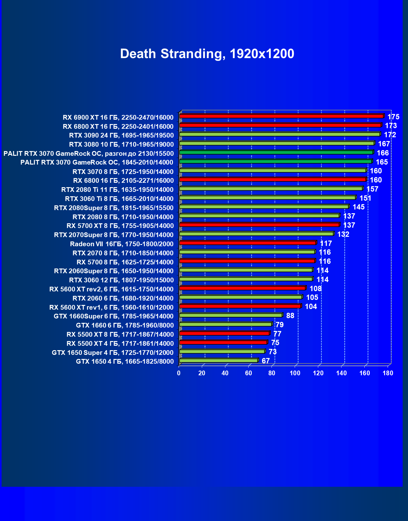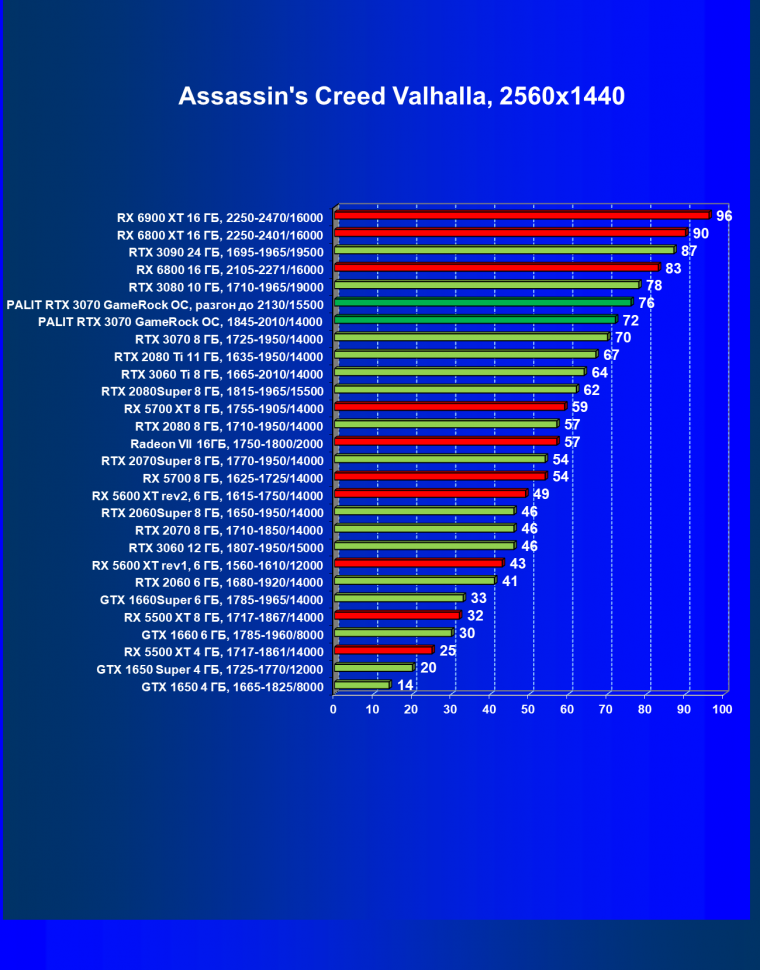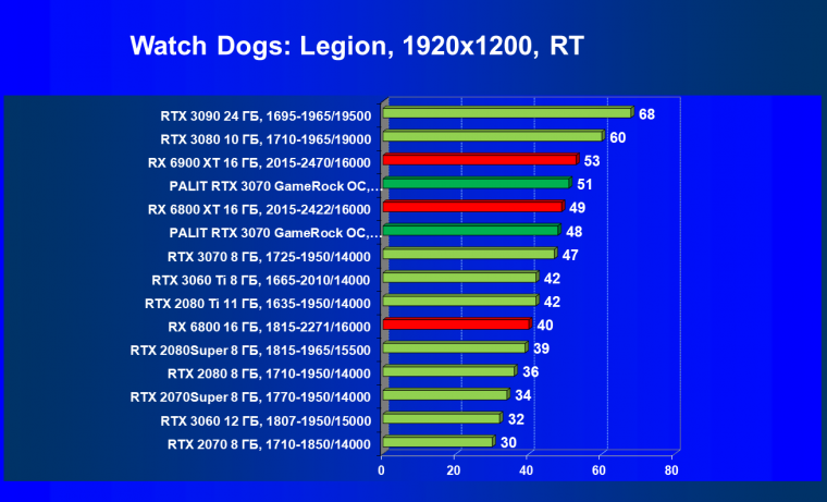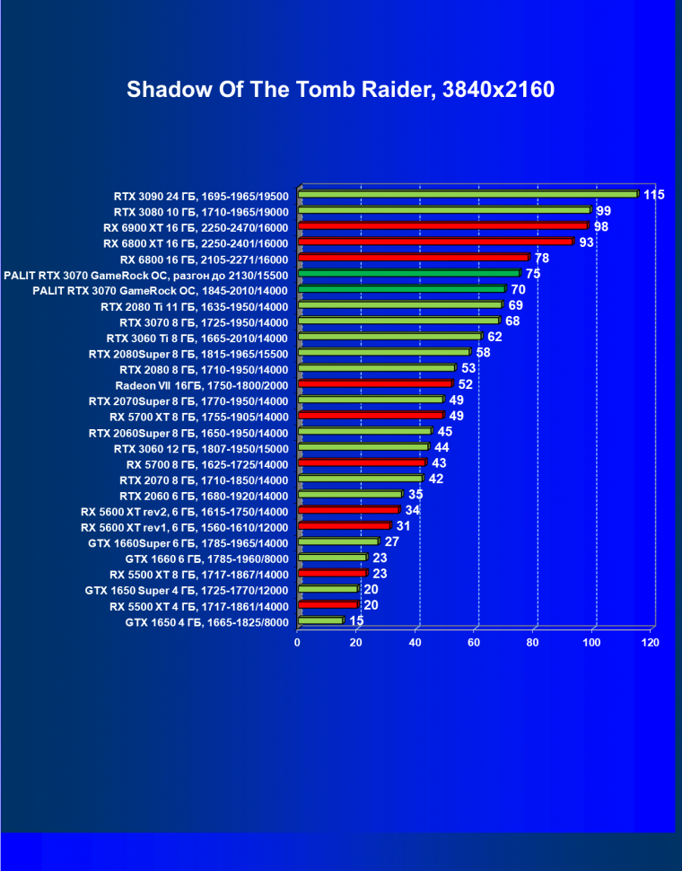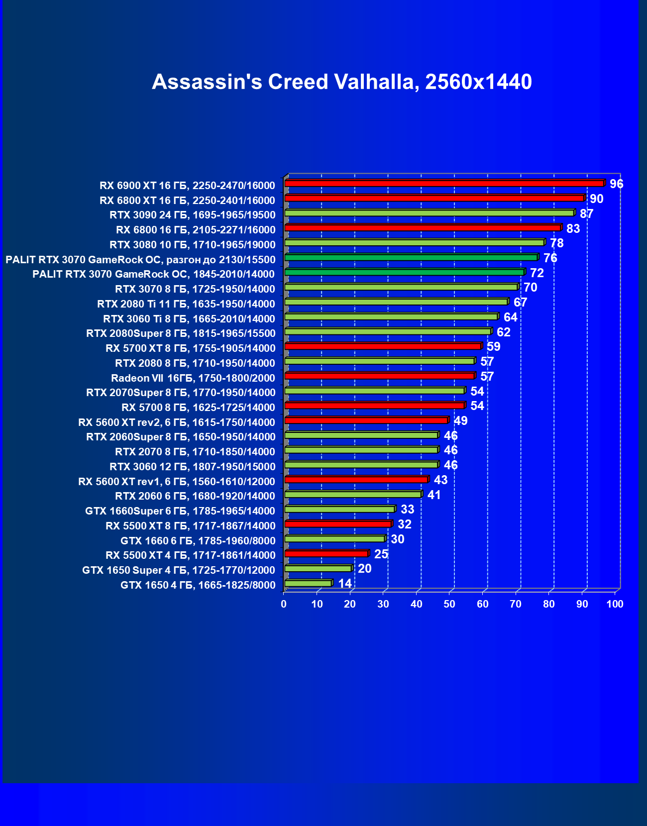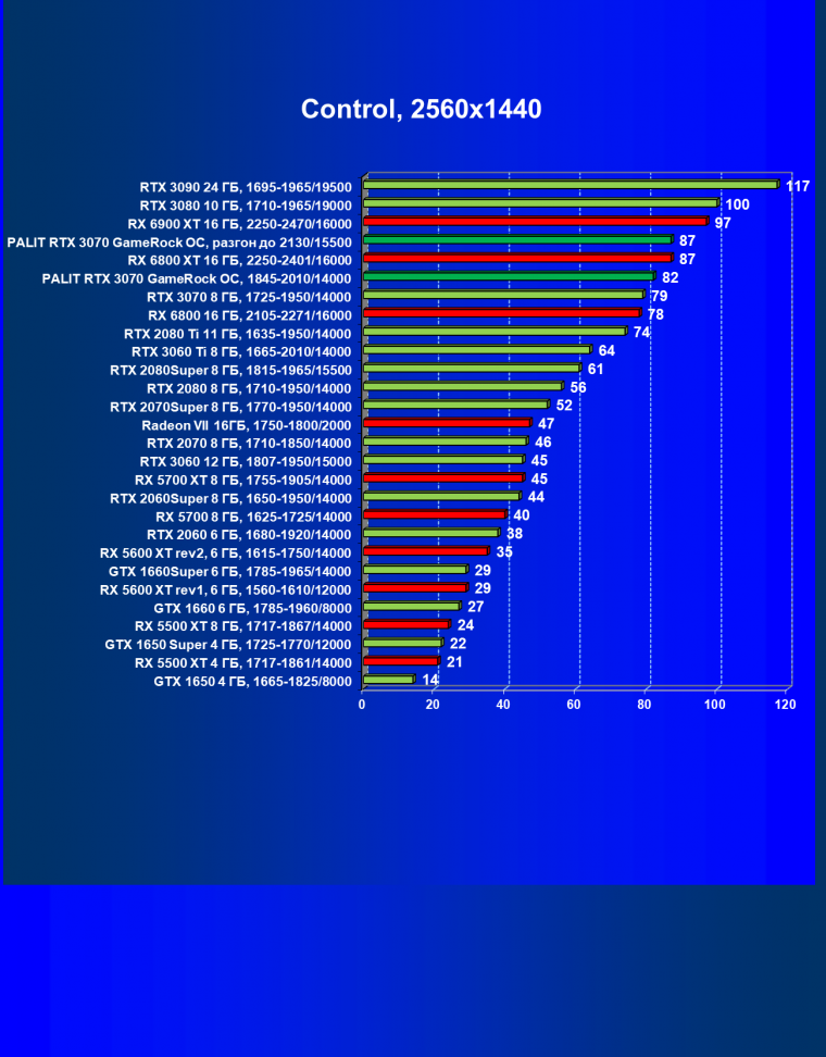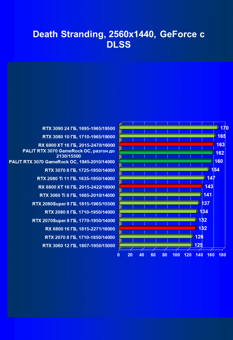 Всем интересующимся хорошо известно, что Radeon RX 6800 немного обходит GeForce RTX 3070 в играх с растеризацией без трассировки лучей. Небольшой фабричный разгон карты Palit не позволил ей догнать соперника, а вот с ручным разгоном карта уже заняла первое место в группе, обойдя Radeon RX 6800, который, кстати, уже можно найти дешевле, чем GeForce RTX 3070.