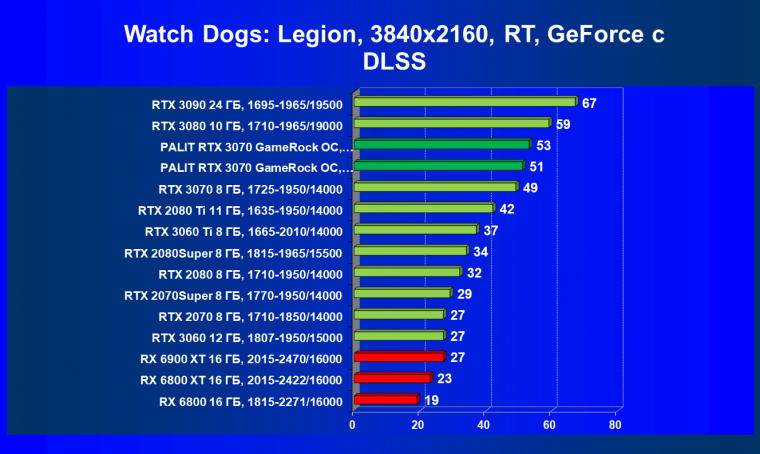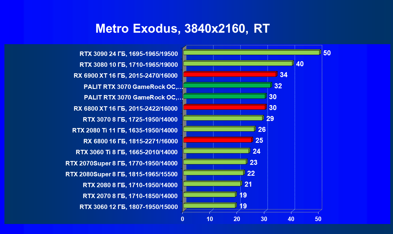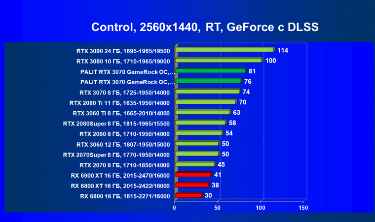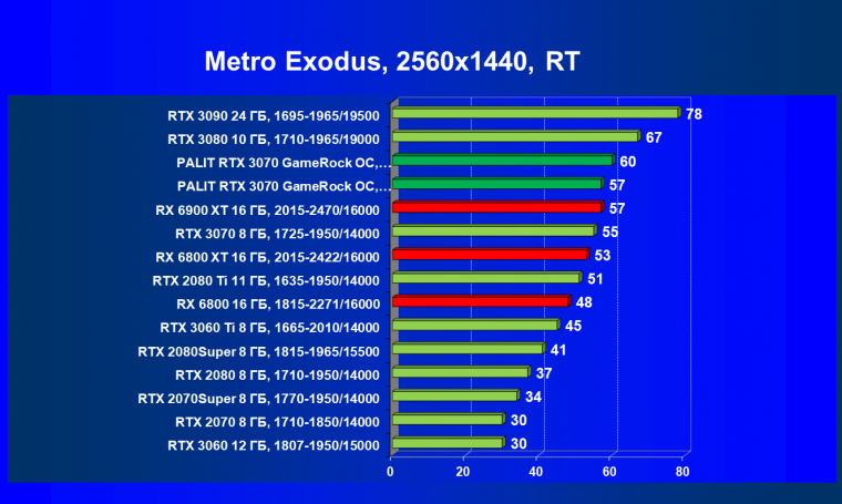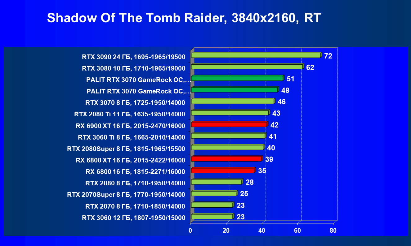 При включении RT производительность Radeon RX 6800 падает намного сильнее, нежели у GeForce RTX 3070, поэтому Radeon RX 6800 оказался в аутсайдерах, и даже Radeon RX 6800 XT отстает от GeForce RTX 3070 в таких играх. Понятно, что оба варианта карты Palit вышли в лидеры группы.