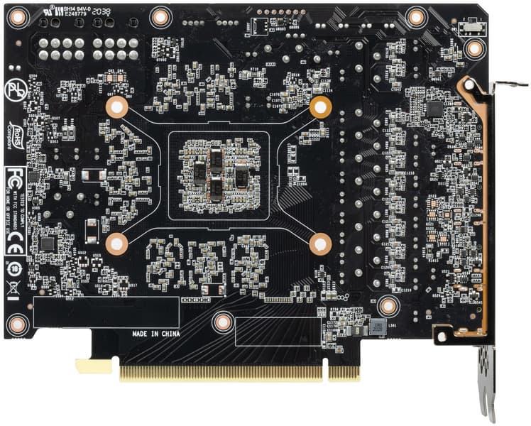 Поверх радиатора установлен кожух с тремя вентиляторами TurboFan 3.0 (∅95 мм), которые имеют двойные подшипники. Как и у референс-карты, крайний правый (на фото) вентилятор продувает радиатор насквозь, через отверстия в задней пластине.