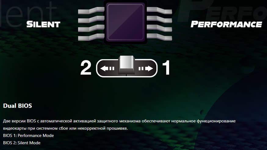 У карты двойной BIOS, поэтому на торце имеется переключатель BIOS1/BIOS2.