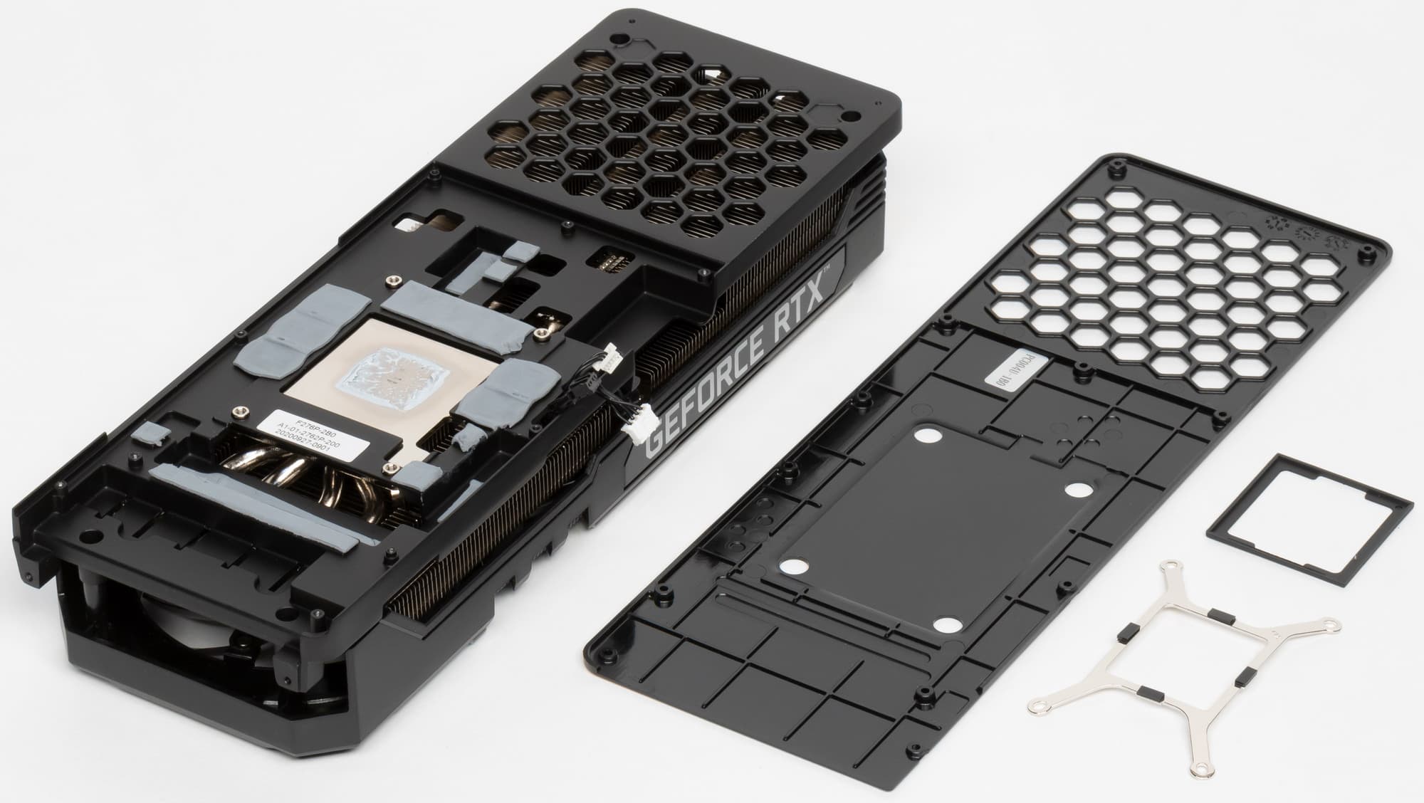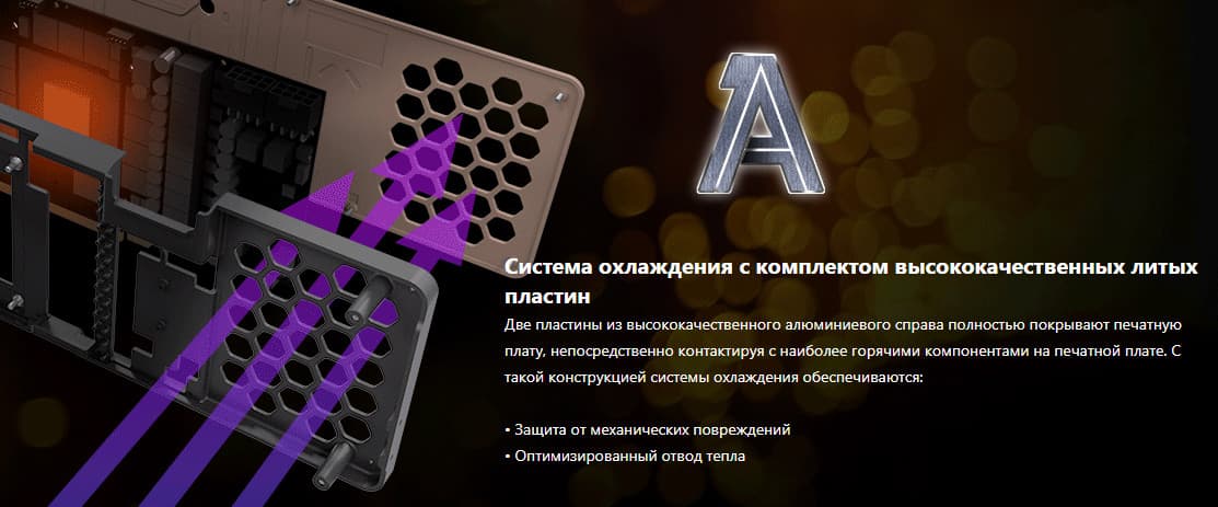 Мы уже неоднократно говорили, что для новых карт Founders Edition задумана специальная система охлаждения, требующая компактных печатных плат, поэтому PCB карт серии GeForce RTX 30 у многих партнеров Nvidia весьма компактны, а принципы работы кулеров аналогичны референсным. Здесь мы видим уже привычный большой двухсекционный пластинчатый никелированный радиатор с тепловыми трубками, подошва которого охлаждает GPU. Микросхемы памяти, как и преобразователи питания VRM, охлаждаются с помощью отдельной пластины, прикрученной к основному радиатору. Задняя пластина служит только элементом жесткости.