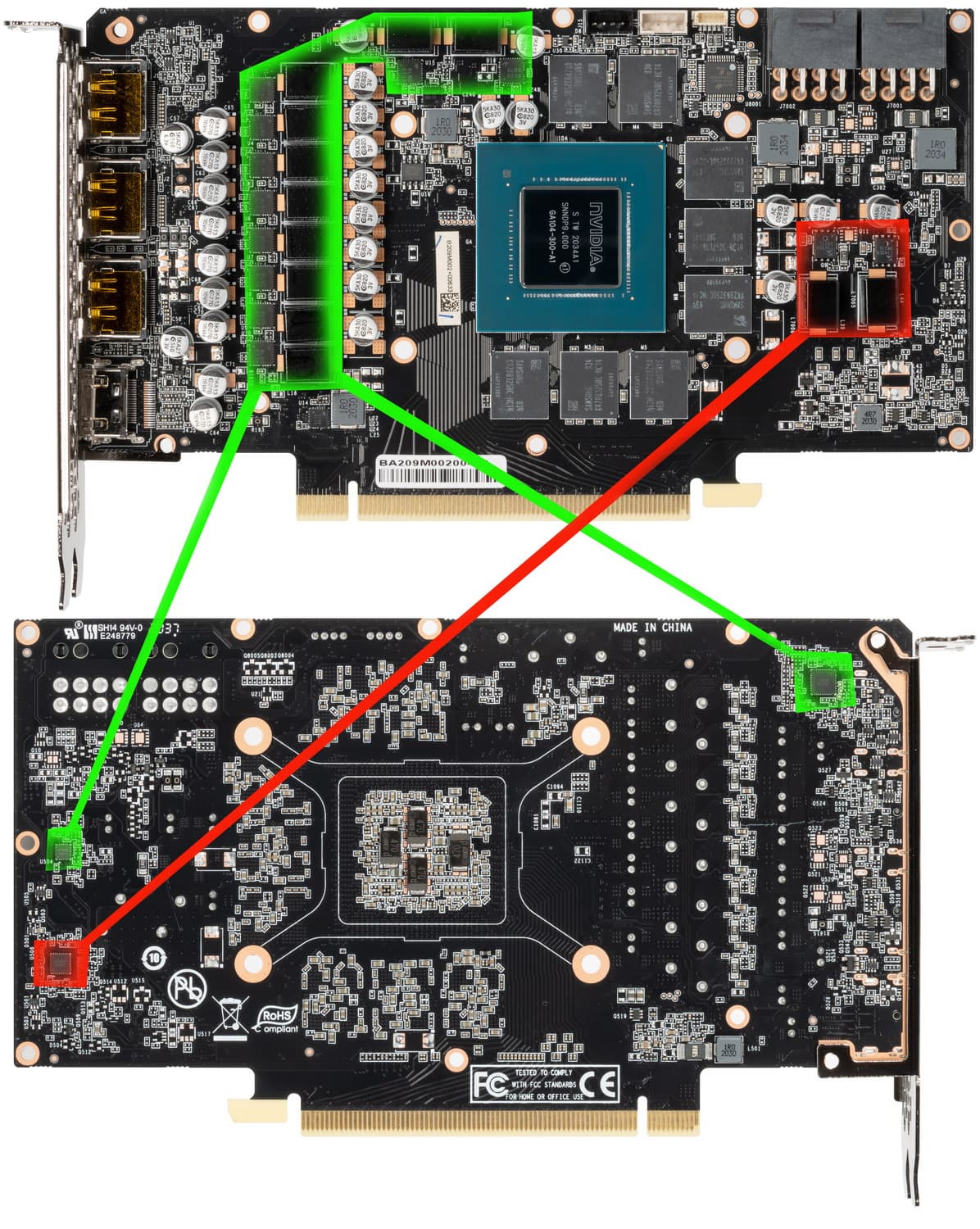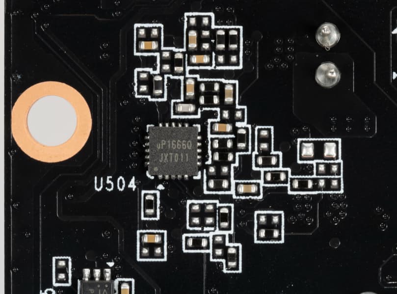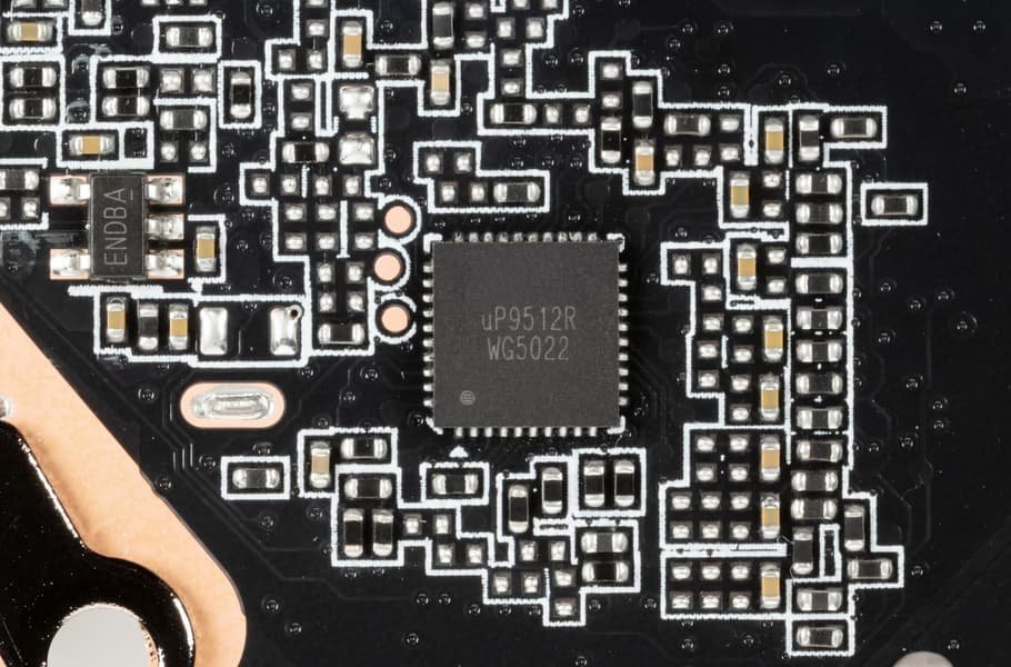 Зеленым цветом отмечена схема питания ядра, красным — памяти. При этом никаких удвоителей (даблеров) фаз нет, для управления схемой питания GPU используются два ШИМ-контроллера uPI Semiconductor: uP9512R (способен управлять 8 фазами максимум) и uP1666Q (рассчитанный на 2 фазы). Оба расположены на оборотной стороне платы.