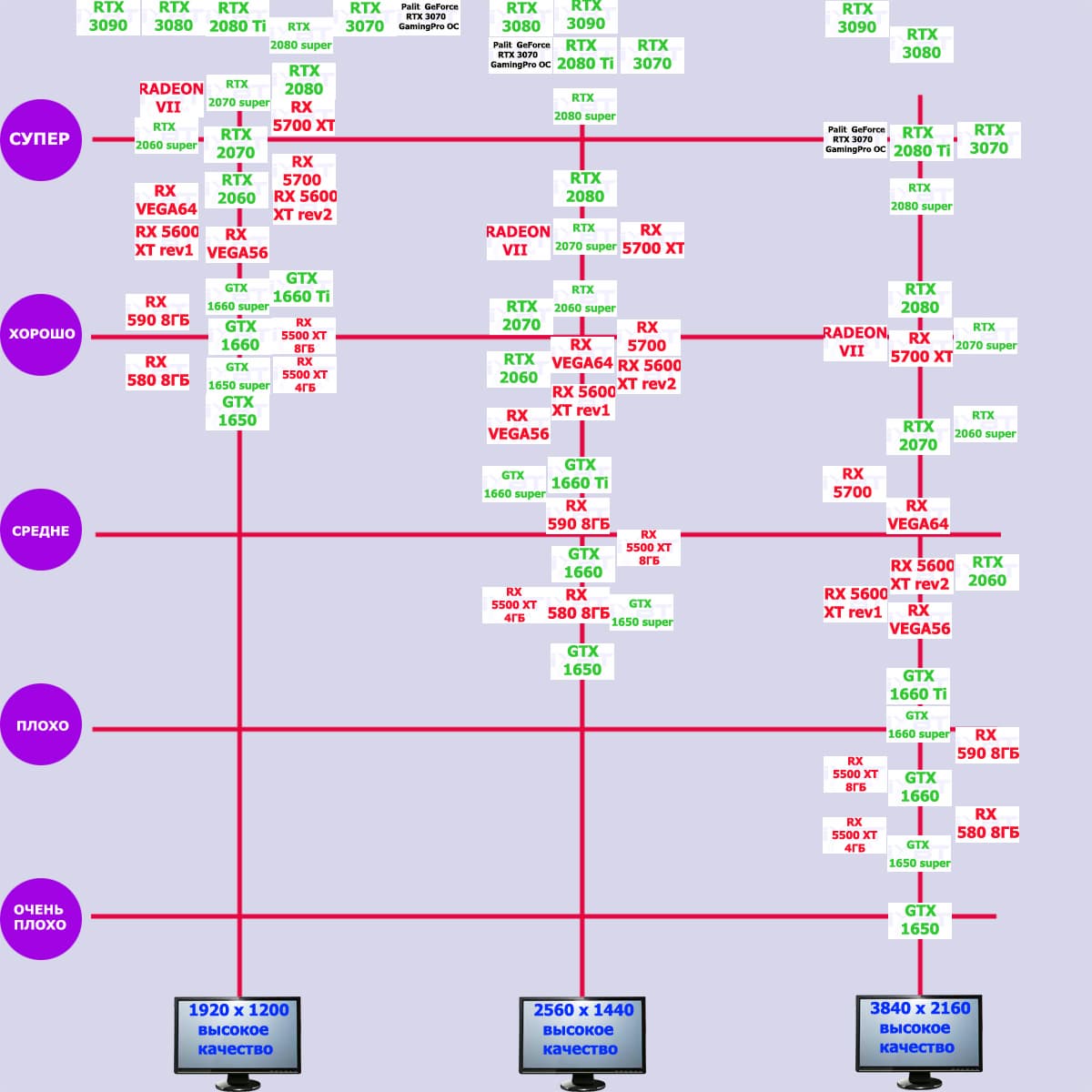 Стандартные результаты тестов без использования аппаратной трассировки лучей в разрешениях 1920×1200, 2560×1440 и 3840×2160