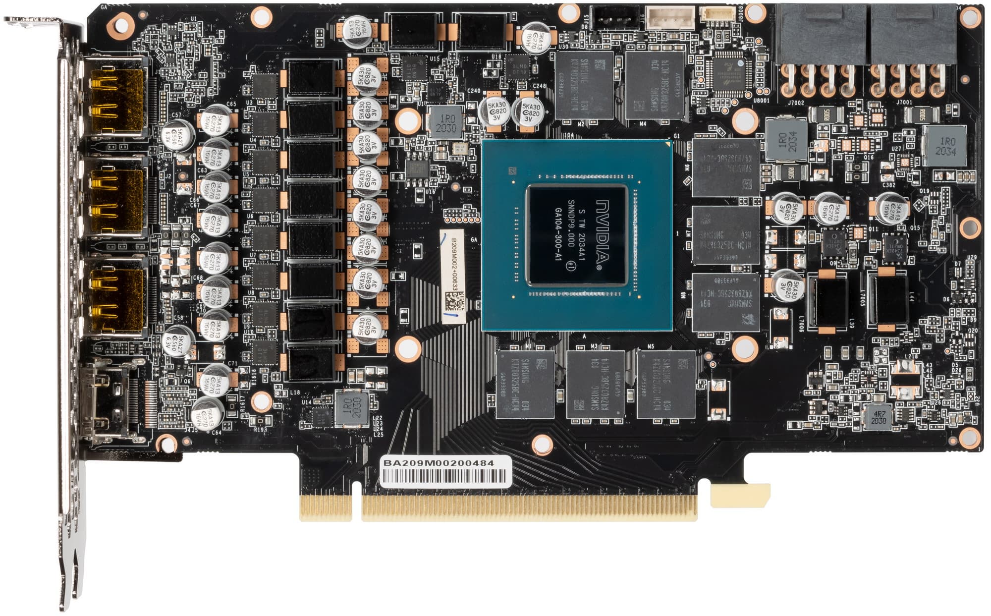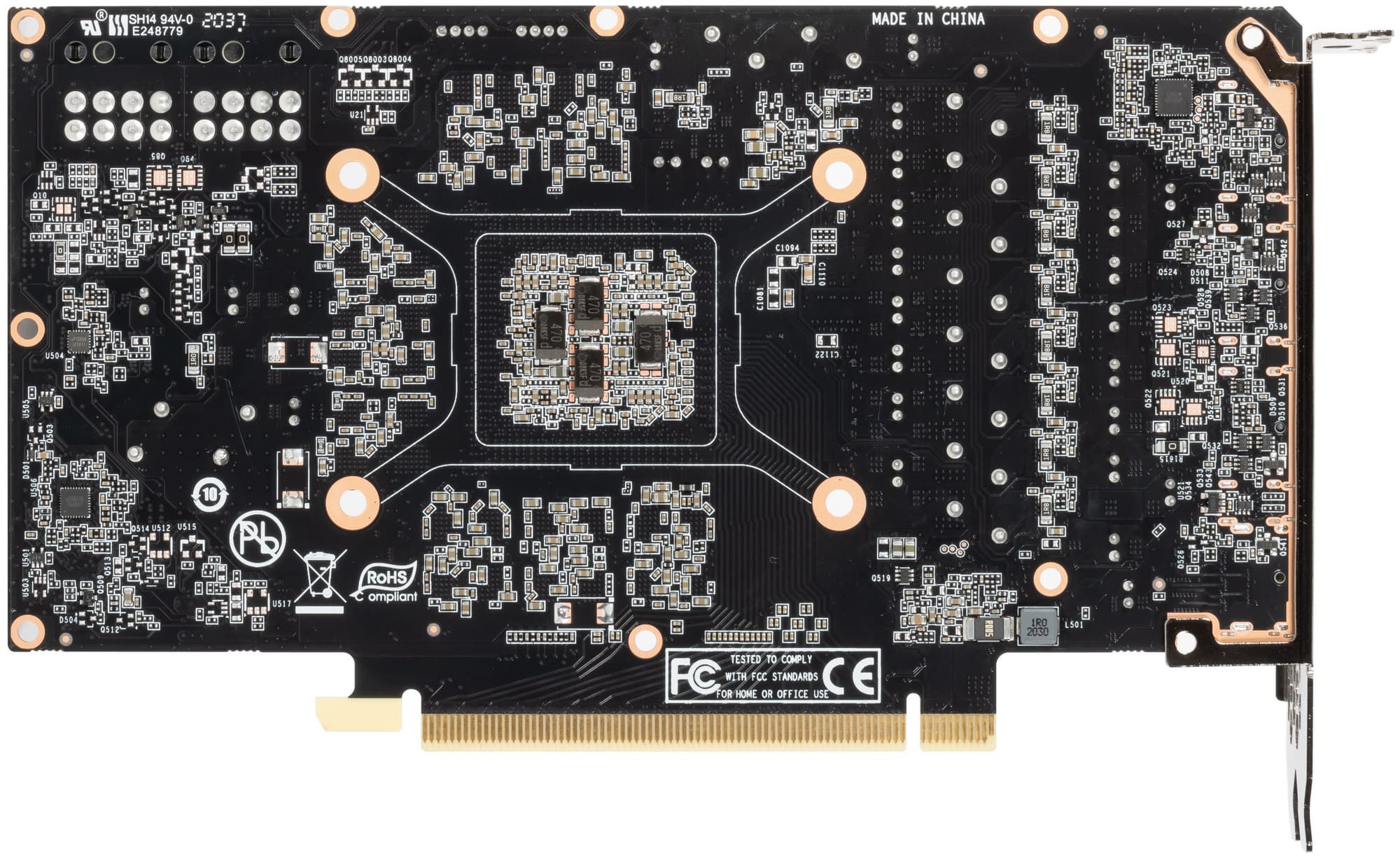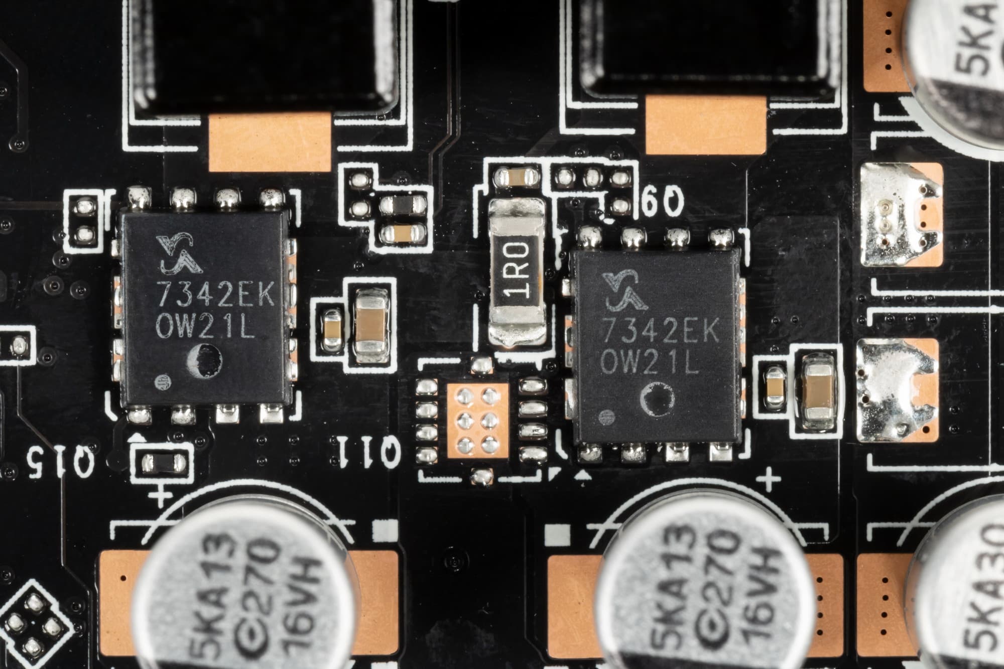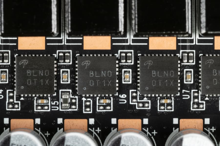 В преобразователе питания GPU, традиционно для всех видеокарт Nvidia, используются транзисторные сборки DrMOS — в данном случае AOZ5311NGI (Alpha&Omega Semiconductor), каждая из которых рассчитана максимум на 50 А.