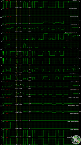 В режиме максимальной нагрузки в 3D температура достигала 73 °C. Вентиляторы при этом раскручивались до 1930 оборотов в минуту, шум вырастал до 34,7 дБА: это отчетливо слышно, на грани высокого шума. В видеоролике ниже хорошо видно, как растет шум (он фиксировался на пару секунд через каждые 30 секунд).