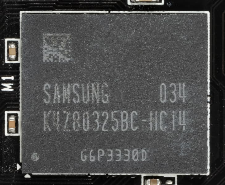 Карта имеет 8 ГБ памяти GDDR6 SDRAM, размещенной в 8 микросхемах по 8 Гбит на лицевой стороне PCB. Микросхемы памяти Samsung (GDDR6, K4Z80325BC-HC14) рассчитаны на условную номинальную частоту работы в 3500 (14000) МГц.