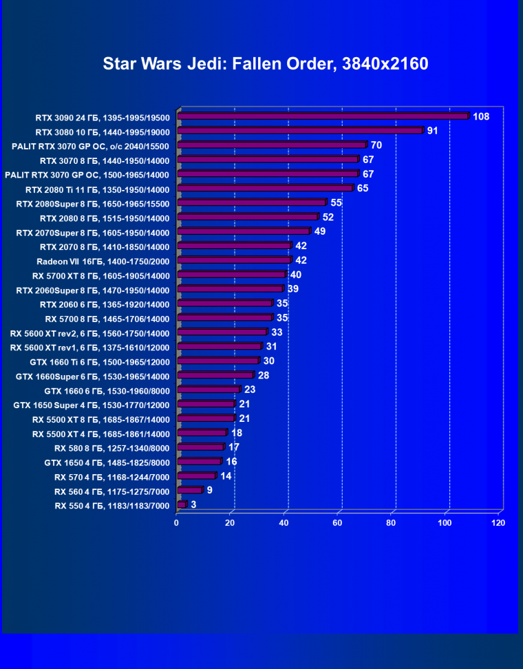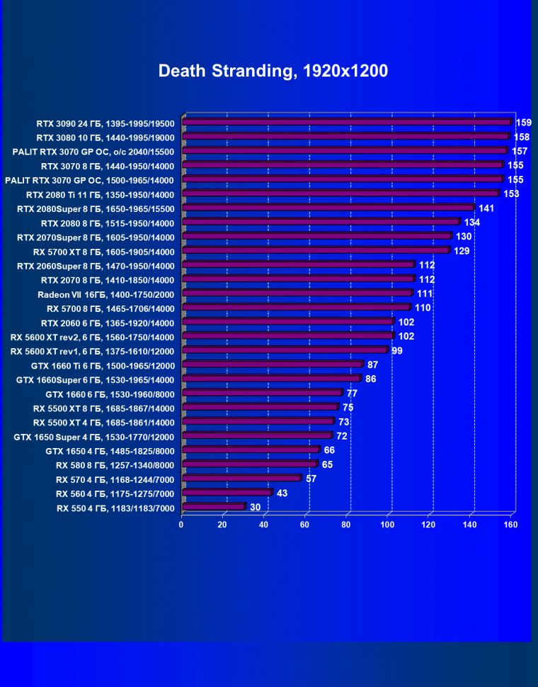 На момент подготовки обзора видеокарты GeForce RTX 3070 в продаже еще не появлялись (а GeForce RTX 3080/3090) если и появлялись, то мгновенно пропадали, так что для составления рейтинга мы вынуждены взять на всю новую линейку условные цены, исходя из рекомендованных Nvidia. И если это допущение оправдается на практике, то у GeForce RTX 3070 может быть большое будущее среди ускорителей в ценовом сегменте около 50 тысяч рублей.