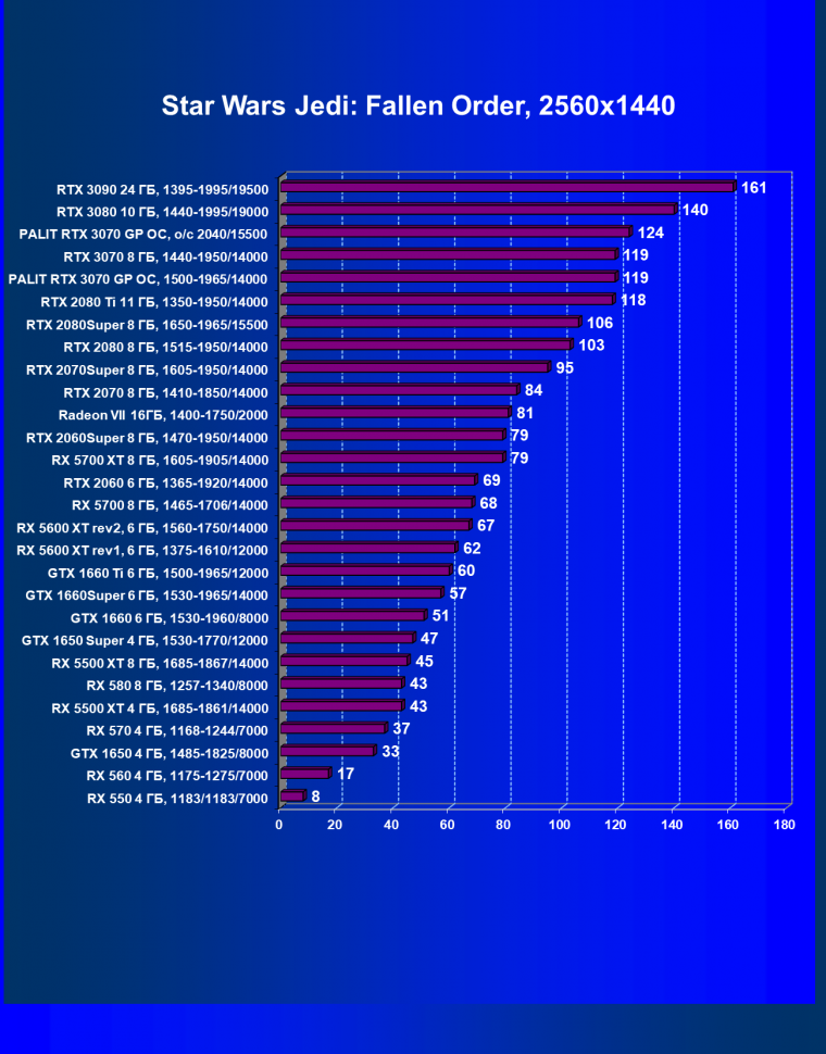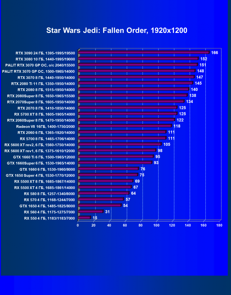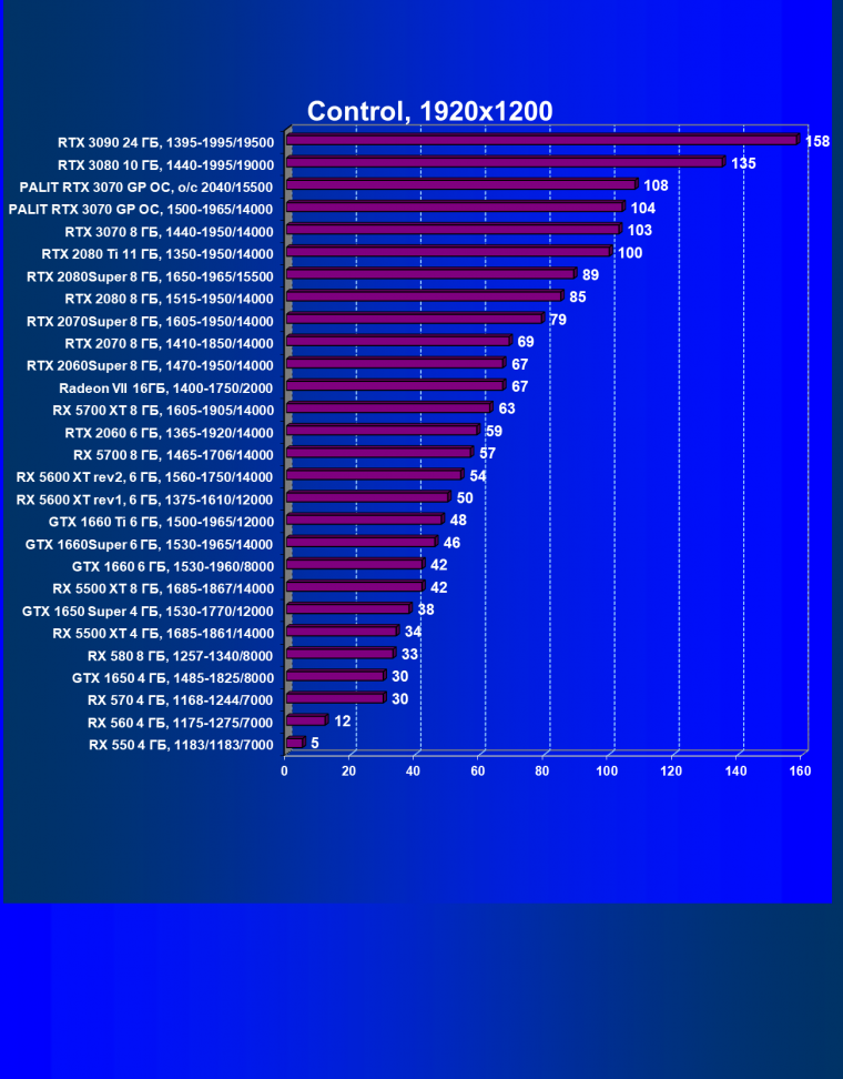 Рейтинг ускорителей iXBT.com демонстрирует нам функциональность видеокарт друг относительно друга и нормирован по самому слабому ускорителю — Radeon RX 550 (то есть сочетание скорости и функций Radeon RX 550 приняты за 100%). Рейтинги ведутся по 28 ежемесячно исследуемым нами акселераторам в рамках проекта Лучшая видеокарта месяца. В данном случае из общего списка выбрана группа карт для анализа, в которую входят GeForce RTX 3070 и его конкуренты.