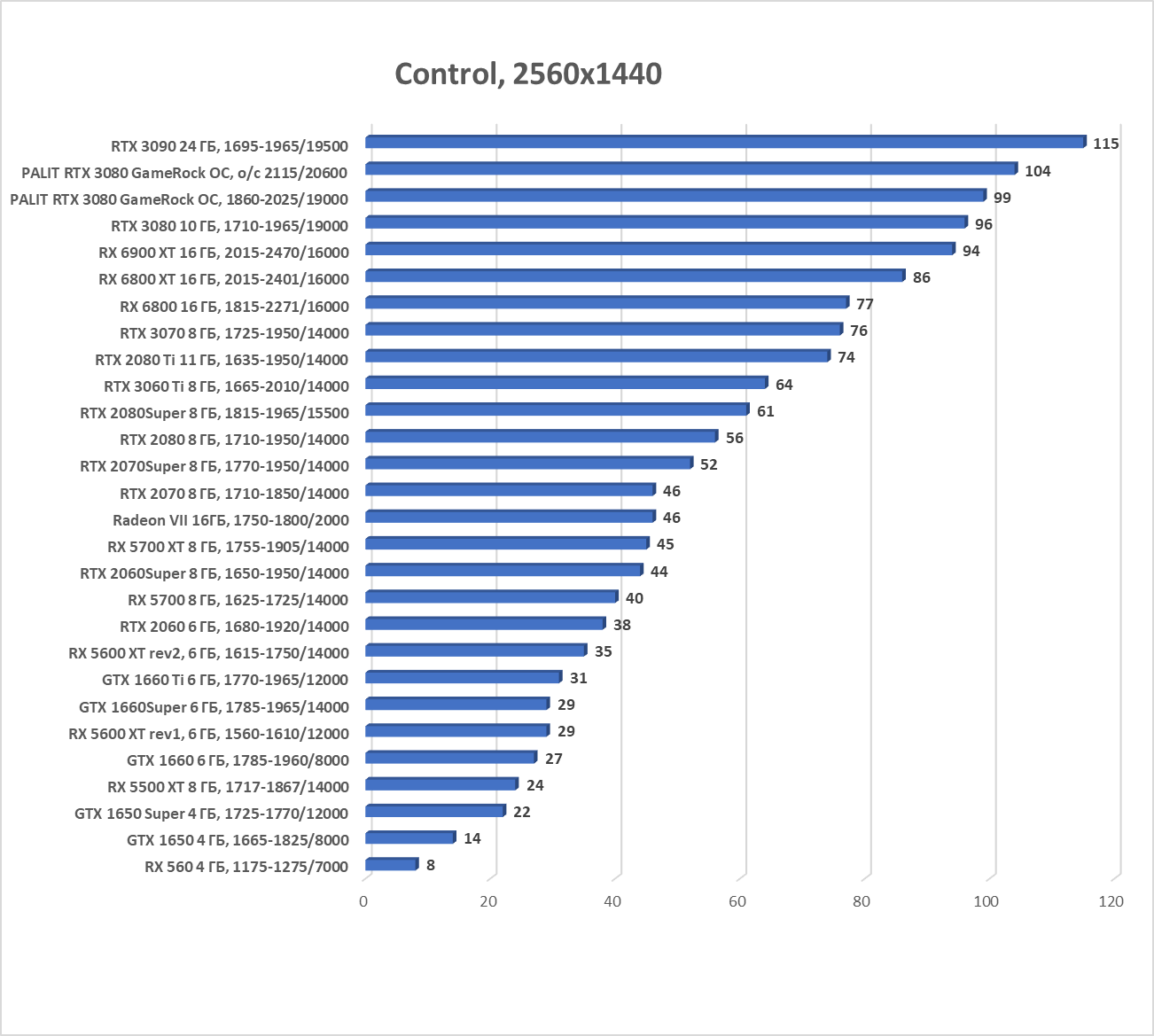 Рейтинг составлен по всем тестам без использования технологий трассировки лучей. Этот рейтинг нормирован по самому слабому ускорителю — Radeon RX 560 (то есть сочетание скорости и функций Radeon RX 560 приняты за 100%). В данном случае из общего списка выбрана группа карт для анализа, в которую входят GeForce RTX 3080 и его конкуренты.