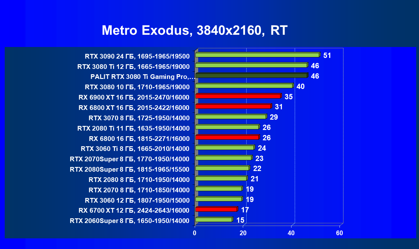 Здесь все логично: RTX 3090 находится в лидерах, за ней следует RX 6900 XT, которую уже преследует RTX 3080 Ti. Карта Palit по частотам работы практически идентична референс-аналогу, поэтому разница между ними ничтожна.
