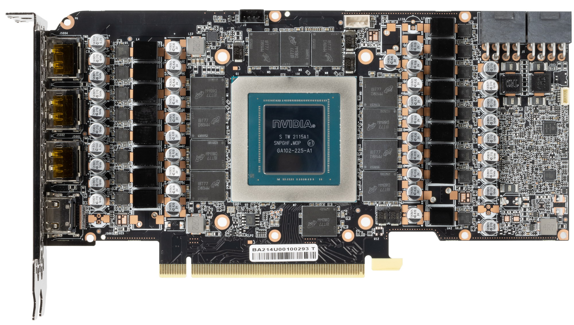Карта имеет 12 ГБ памяти GDDR6X SDRAM, размещенной в 12 микросхемах по 12 Гбит на лицевой стороне PCB. Микросхемы памяти Micron (GDDR6X, MT61K256M32JE-19) рассчитаны на номинальную частоту работы в 5500 (21000) МГц. Расшифровщик кодов на упаковках FBGA находится здесь.