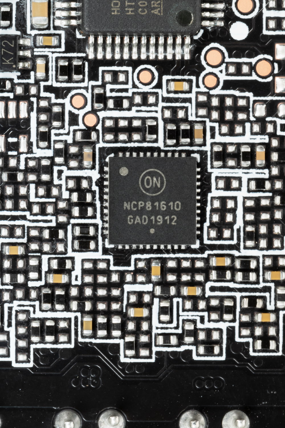 В преобразователе питания, традиционно для всех видеокарт Nvidia, используются транзисторные сборки DrMOS — в данном случае NCP302150 (On Semiconductor), каждая из которых рассчитана максимум на 50 А.