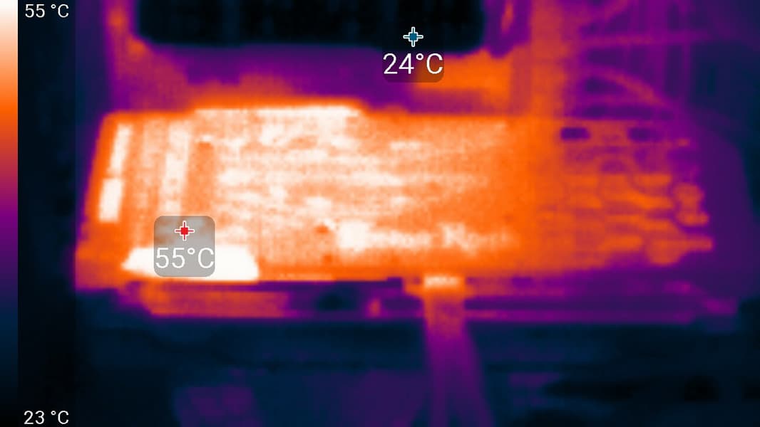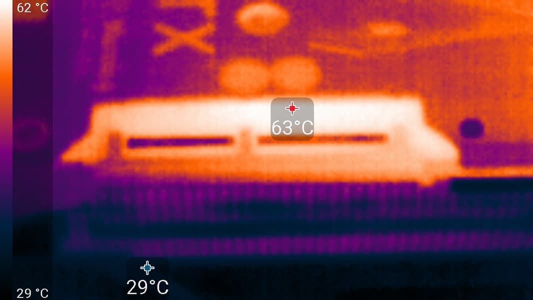 Максимальный нагрев наблюдался в центральной части PCB, в основном около микросхем памяти.