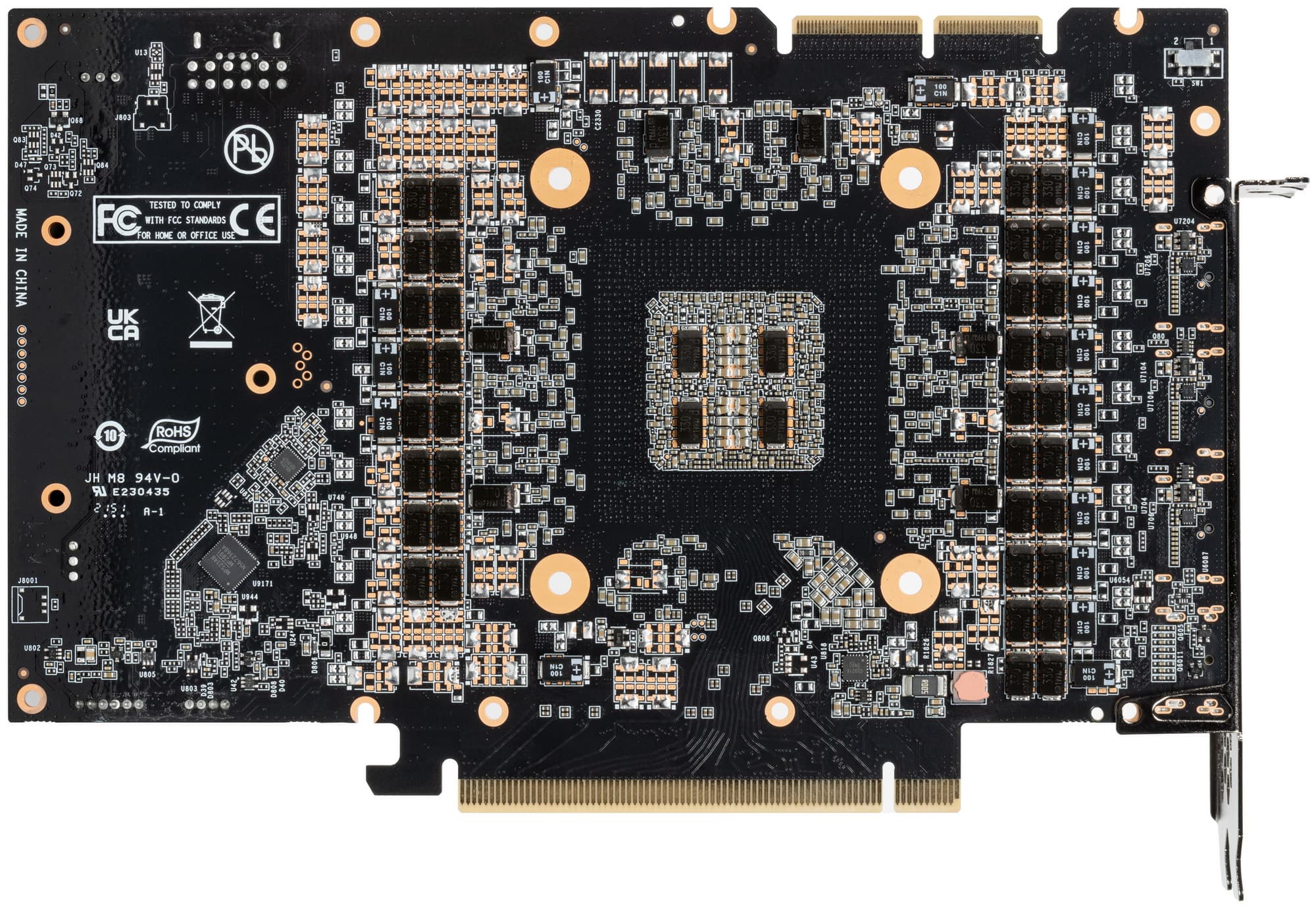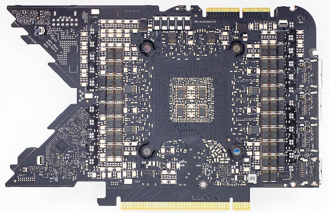Ранее я уже писал, что у Nvidia имеется несколько вариантов референс-дизайна 3090 Ti (справа — вариант, что идет в фирменные видеокарты Founders Edition от самой Nvidia). Если при изучении карт на базе RTX 3090/3080 мы подмечали отличия между PCB у карт Founders Edition и серийно выпускаемых карт партнерами Nvidia (у FE размеры самые маленькие, а также имеется V-образный вырез, чего не было ни у одной карты от партнеров), то сейчас и многие партнеры стали следовать примеру Nvidia, выпуская RTX 3090 Ti с печатными платами с вырезом. Однако инженеры Palit решили внести некоторые изменения в дизайн, и поэтому четко видно, что по компоновке элементов на PCB «вырез» как бы остался, и полезное место на текстолите в этом месте было использовано для контроллера подсветки.
