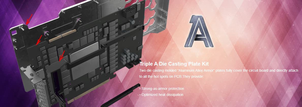 Задняя пластина также участвует в охлаждении оборотной стороны платы через термопрокладки, а также служит элементом защиты и усиления жесткости PCB. Концепция в целом предусматривает тройную защиту печатной платы от любых повреждений и изгибов: кроме задней пластины имеется еще и черная рама, связывающая первую с радиатором охлаждения, а также с крепежной планкой, создавая этакий монолит вокруг PCB.