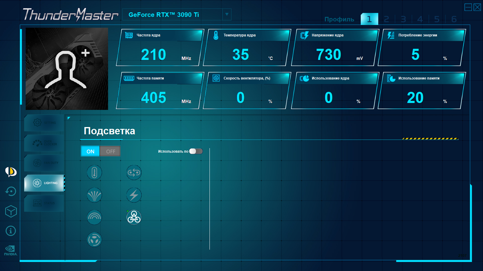 Это не новый тип подсветки, такой дизайн вышел в 2020 году с выходом RTX 30 в серии GameRock. Управление режимами подсветки, в том числе и ее отключением, осуществляется той же утилитой Thunder Master.