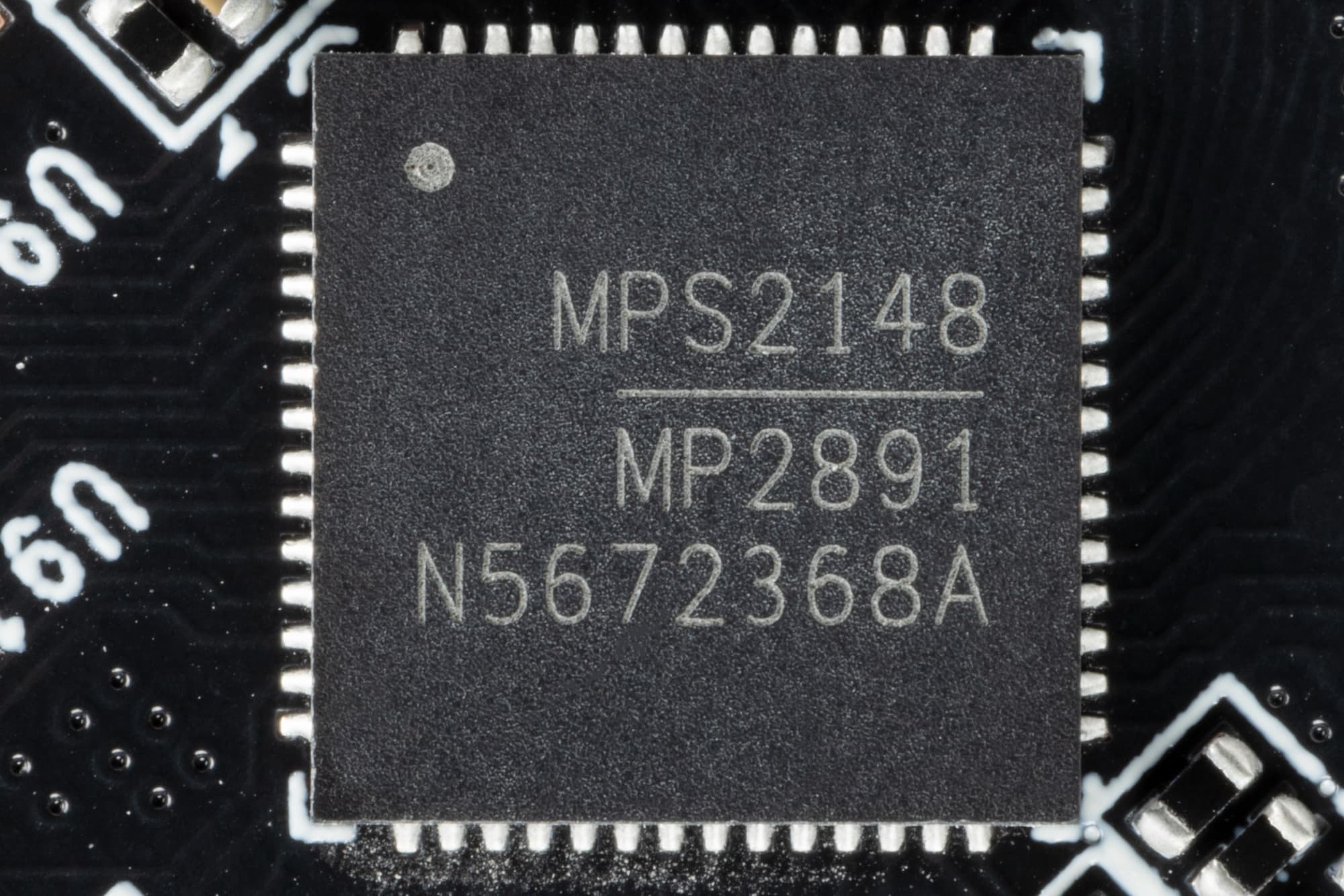 Зеленым цветом отмечена схема питания ядра, красным — памяти. Обоими схемами (18+3) управляет один ШИМ-контроллер MP2891 от Monolithic Power Systems (расположенный на оборотной стороне PCB). Это новый контроллер, по нему найти информацию пока не удалось, однако есть некоторые данные, говорящие, что он рассчитан максимум на 16 фаз, поэтому очевидно, что идет параллельное управление фазами питания GPU (не 18, а реально 9), плюс 3 прямые фазы питания микросхемами памяти.