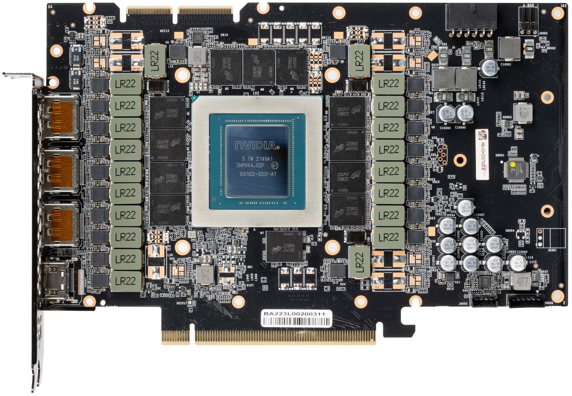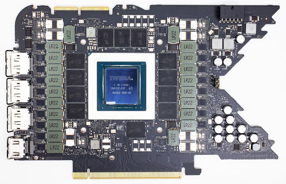 Карта имеет 24 ГБ памяти GDDR6X SDRAM, размещенной в 12 микросхемах по 16 Гбит на лицевой стороне PCB. Микросхемы памяти Micron (GDDR6X, MT61K512M32KPA-21 / D8BZC) рассчитаны на номинальную частоту работы в 2625 (21000) МГц.