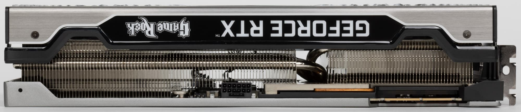 В целом концепция СО у этой карты соответствует той, что рекомендовала Nvidia при выпуске RTX 3xxx серии: компактная PCB и система охлаждения, продувающая крайним вентилятором радиатор насквозь. Собственно, инженеры Palit по сути усилили такой вариант: основой кулера является огромный многосекционный пластинчатый никелированный радиатор с тепловыми трубками, распределяющими тепло по ребрам радиатора. Трубки припаяны к огромному медному плато (подошве). Испарительной камеры в данном случае нет, просто сама подошва весьма толстая.