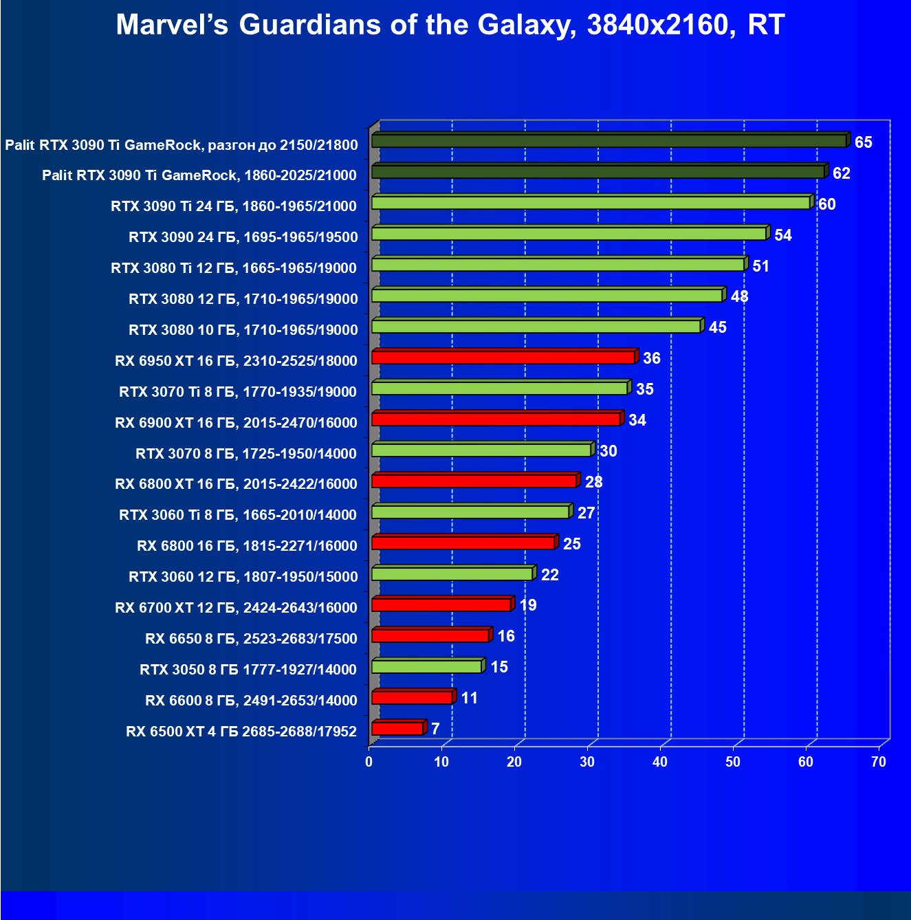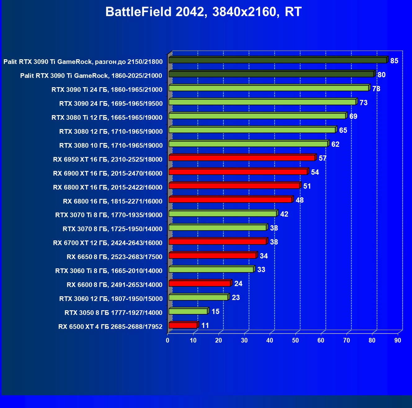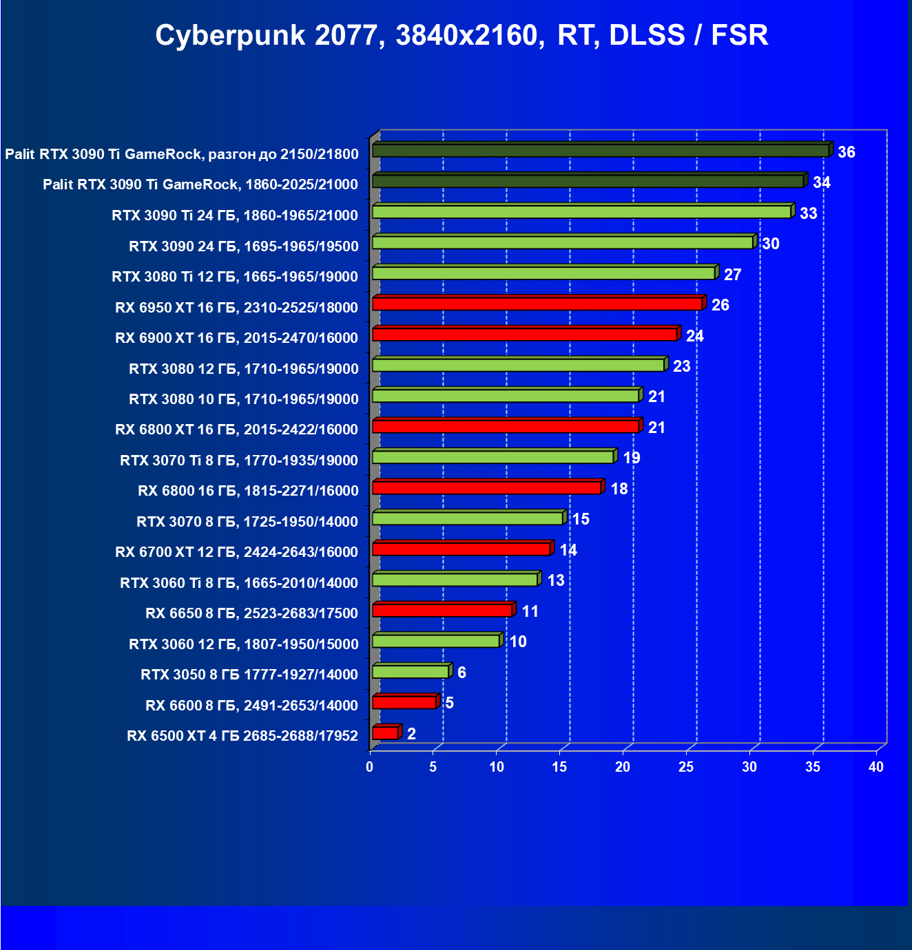 | 01 | Palit RTX 3090 Ti GameRock, разгон до 2150/21800 | 480 | 33 | 147 000 |