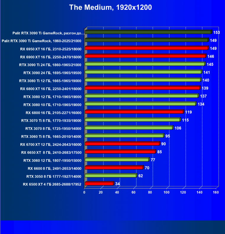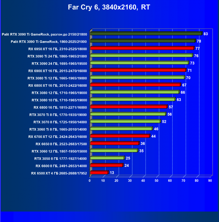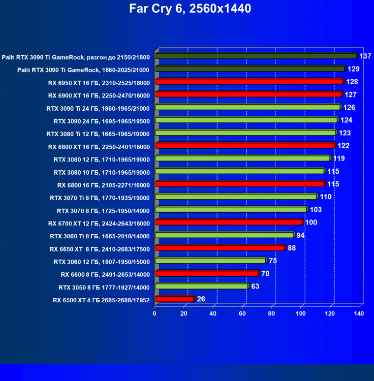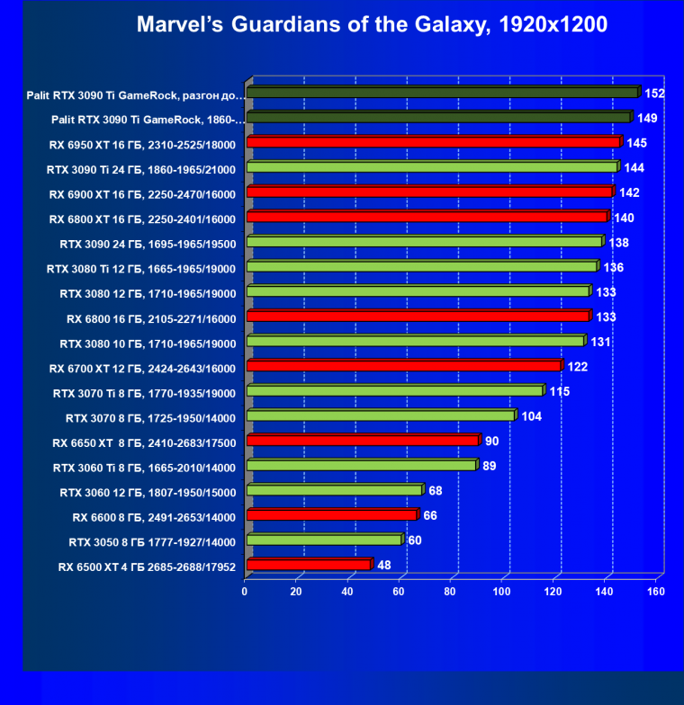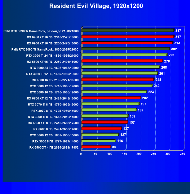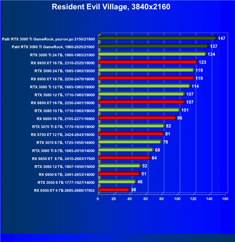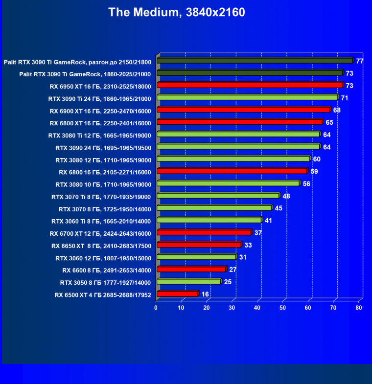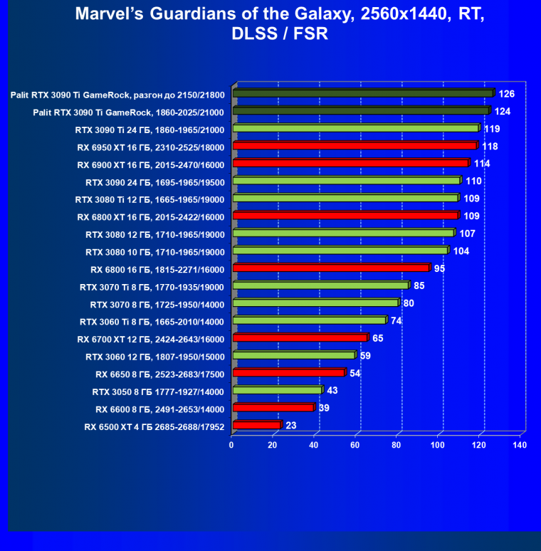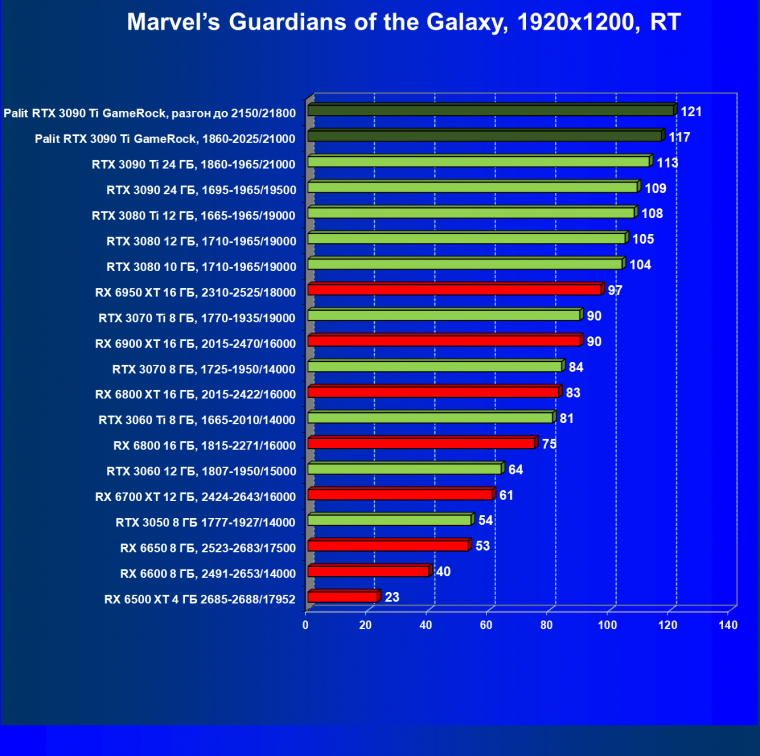Как ранее мы уже отмечали: лидер есть лидер во всех отношениях, причем повышенные частоты работы карты позволили ей обойти флагмана AMD — Radeon RX 6950 XT.